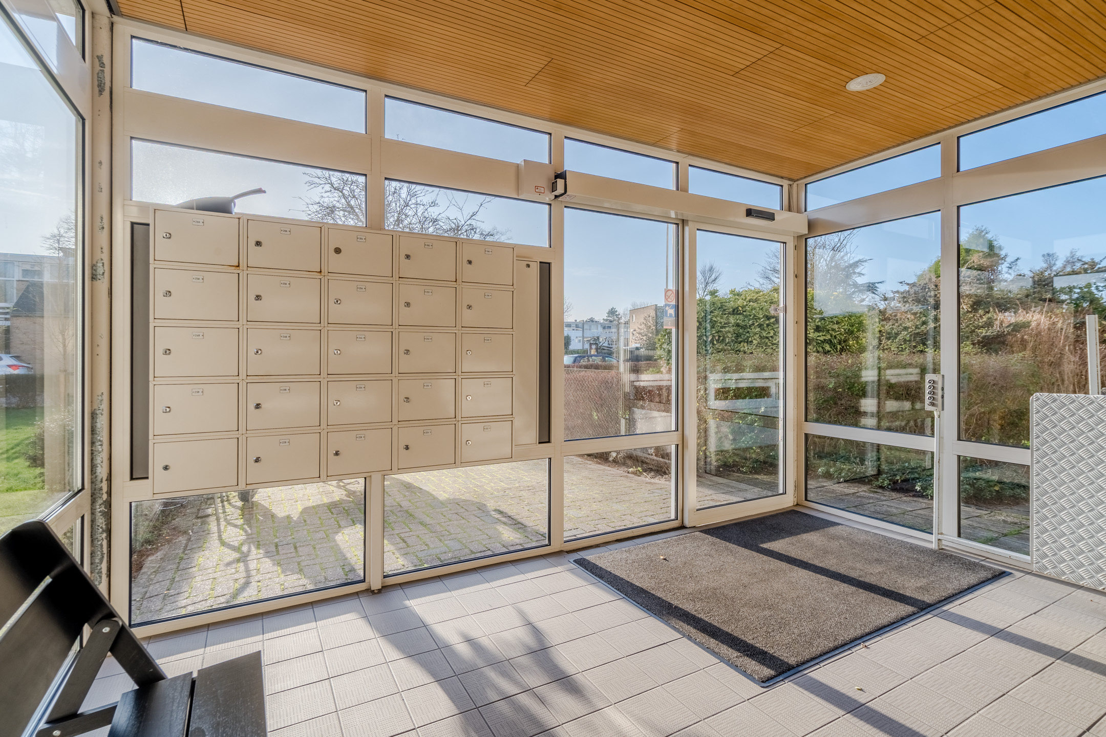 Op de begane grond bevindt zich de gesloten entreehal met de brievenbussen, het trappenhuis en de lift.