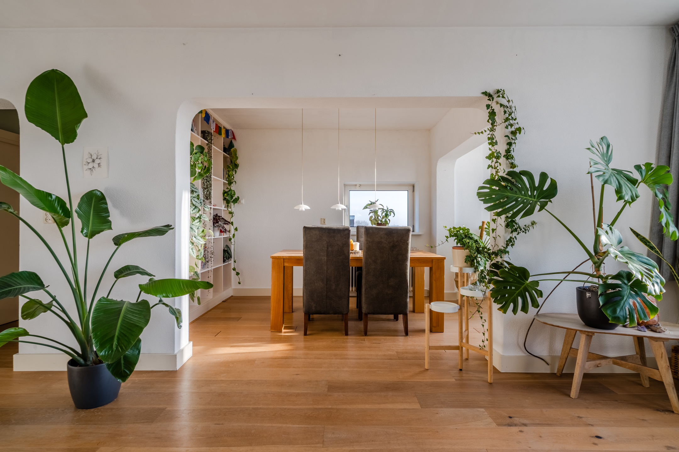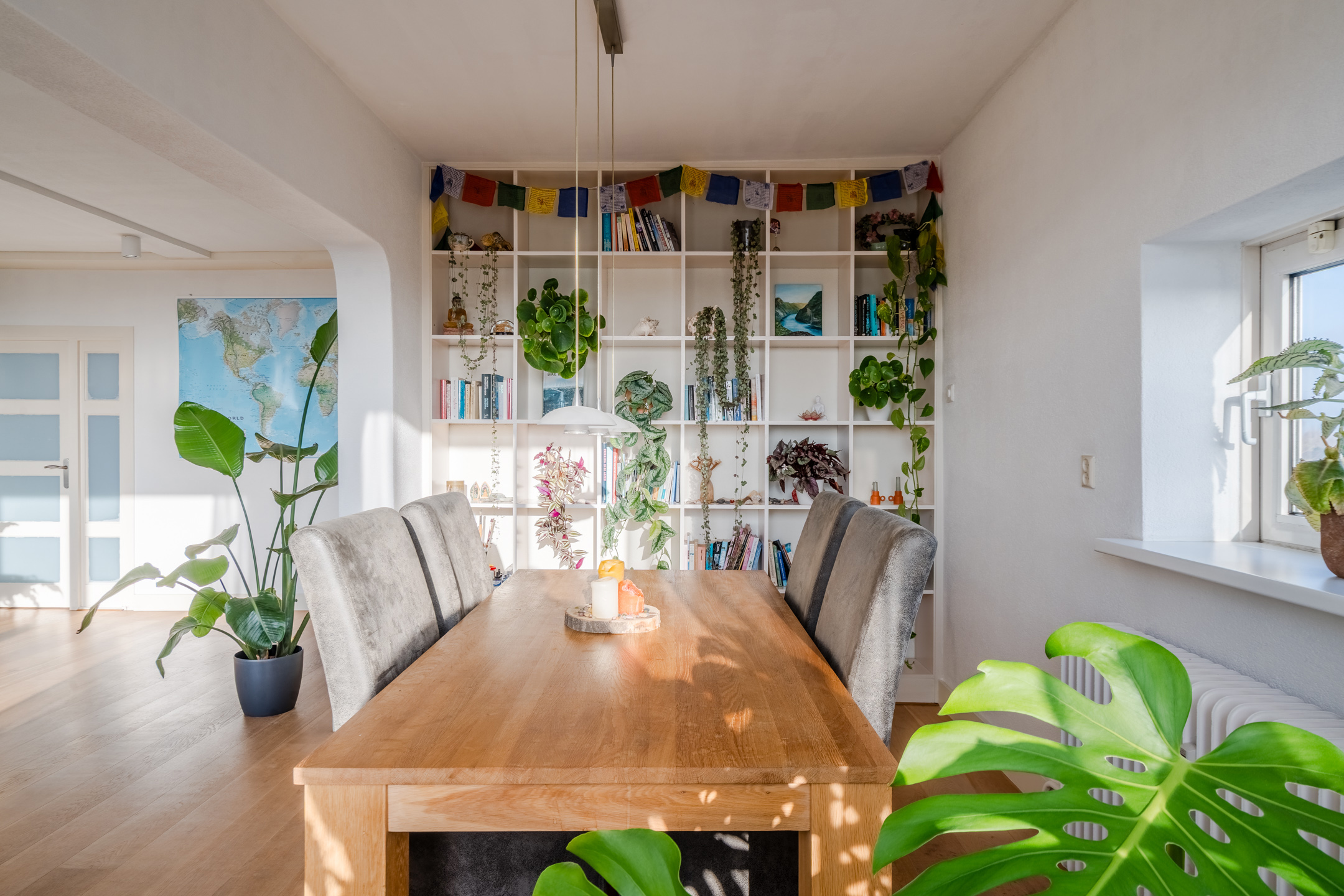 The cosy, south-facing living room is beautifully finished and enjoys an abundance of natural light. New external sun blinds are also present. From the living room there is access to the semi-open dining room, which could also be converted into a separate, additional bedroom. This dining room features two large sliding windows, allowing you to enjoy the sunshine even when sitting indoors with the windows open.
