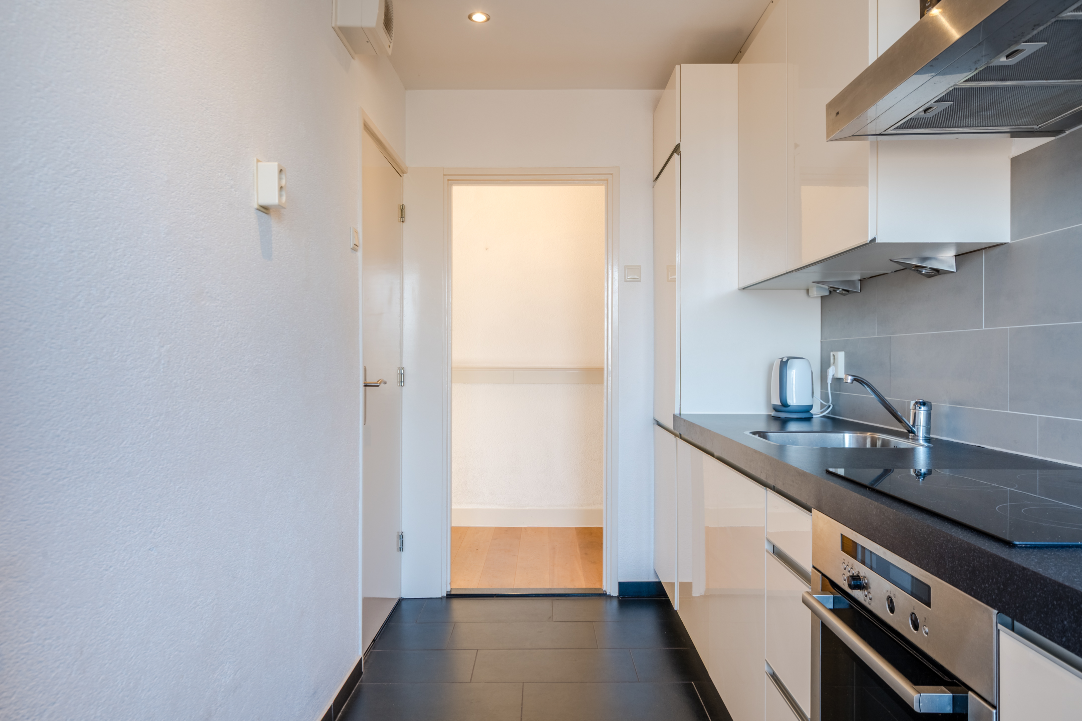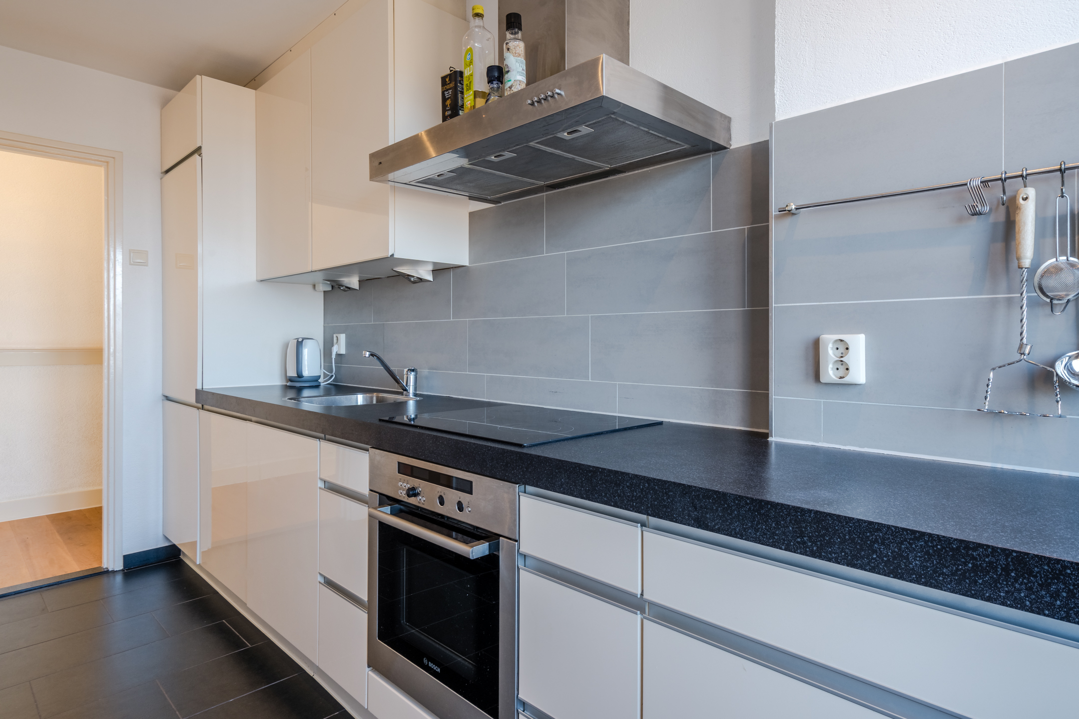 De moderne, gesloten keuken in rechte opstelling is voorzien van een inductiekookplaat met afzuigkap, combi-oven/magnetron, koelkast, vriezer, vaatwasser, inbouwspots en mechanische afzuiging. Door de laden en kastjes is er meer dan voldoende ruimte om keukengerei, ingrediƫnten en boodschappen netjes op te bergen. Tevens is er ook een vaste kast in de keuken om spullen in op te bergen.