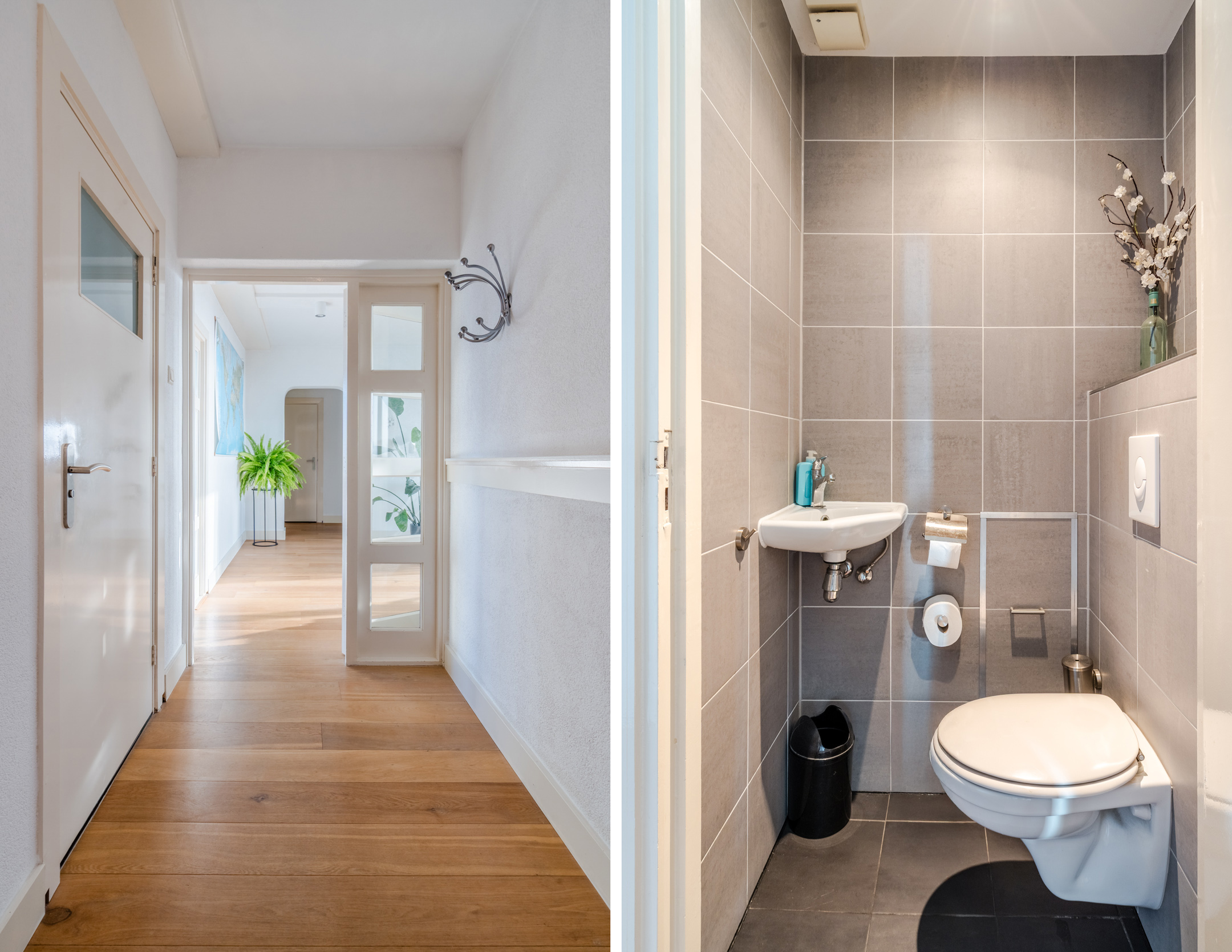From the living room there is also access to bedroom 1. The second bedroom can be reached via a separate hallway. In this hallway there is space for a washing machine and dryer in a spacious storage cupboard.