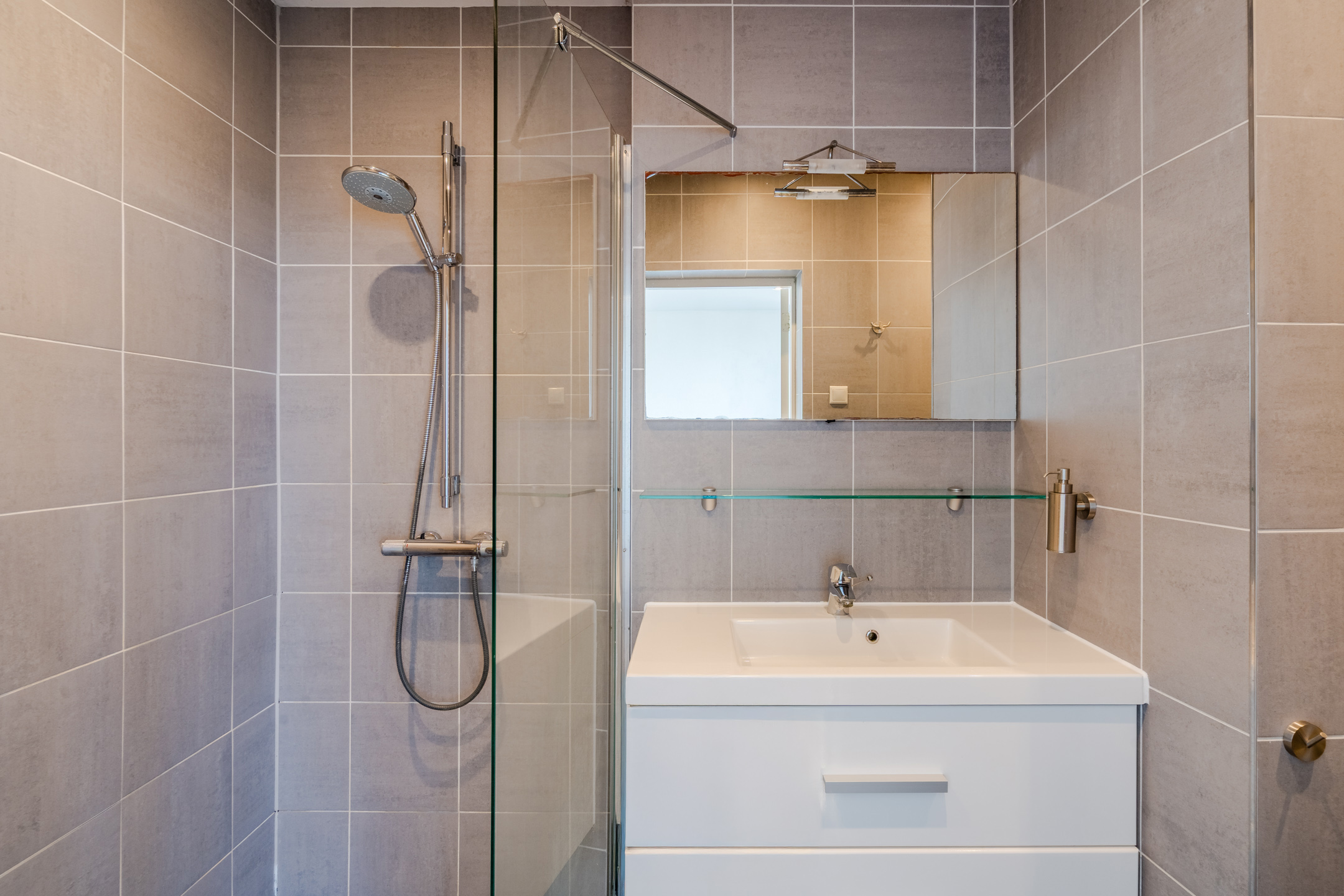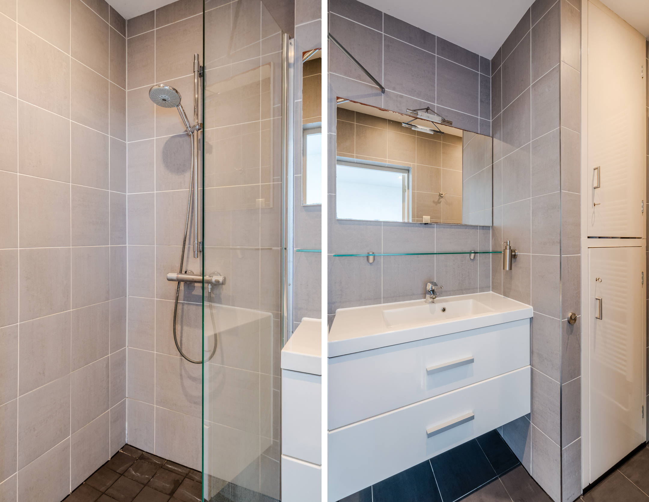 De complete badkamer beschikt over inbouwspots, een wastafel met meubel, een designradiator, een inloopdouche en mechanische afzuiging. De boiler is handig weggewerkt in een aparte kast.