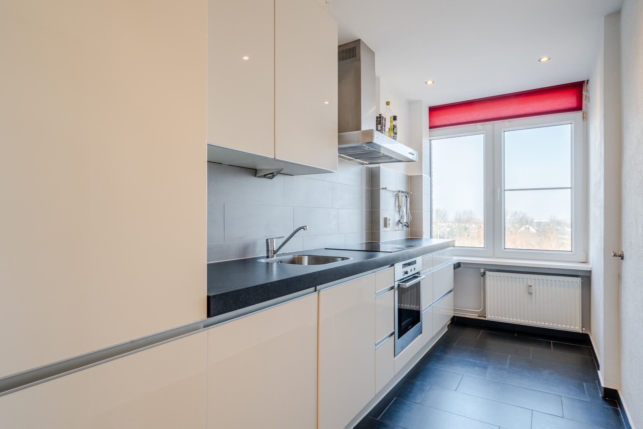 Via the stairwell or the lift we arrive at the apartment on the eighth floor. Upon entering, you step into the entrance hall, which has an open connection to the kitchen and provides access to the toilet with washbasin and to the living room.
