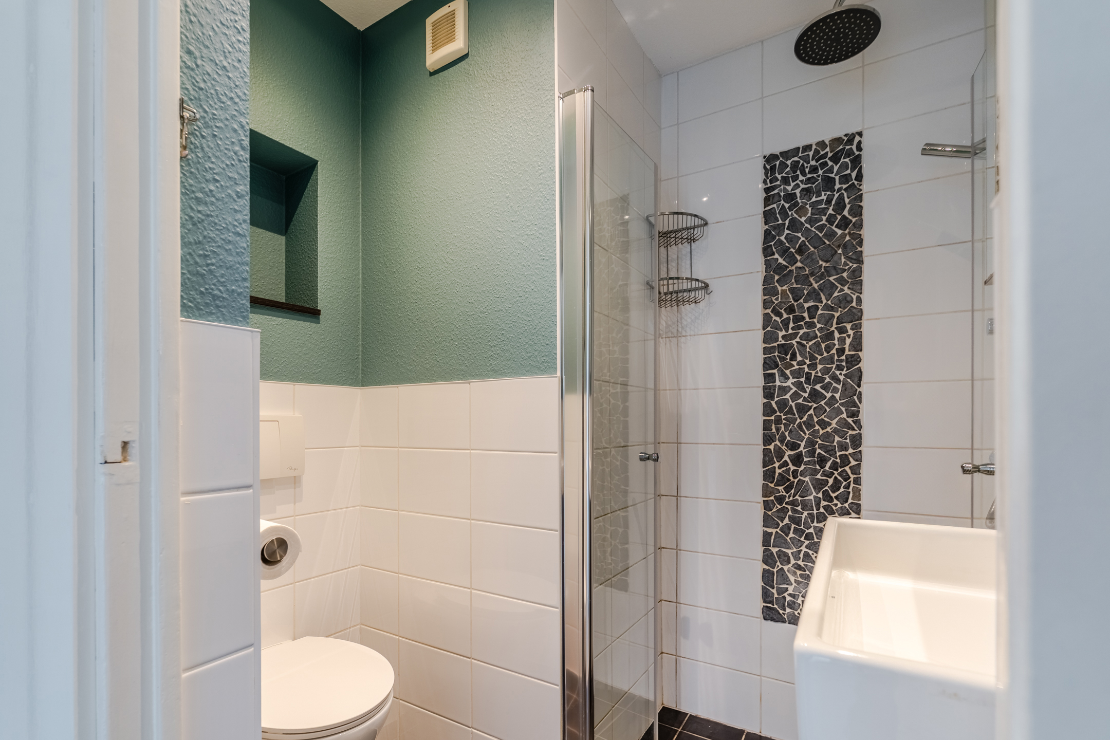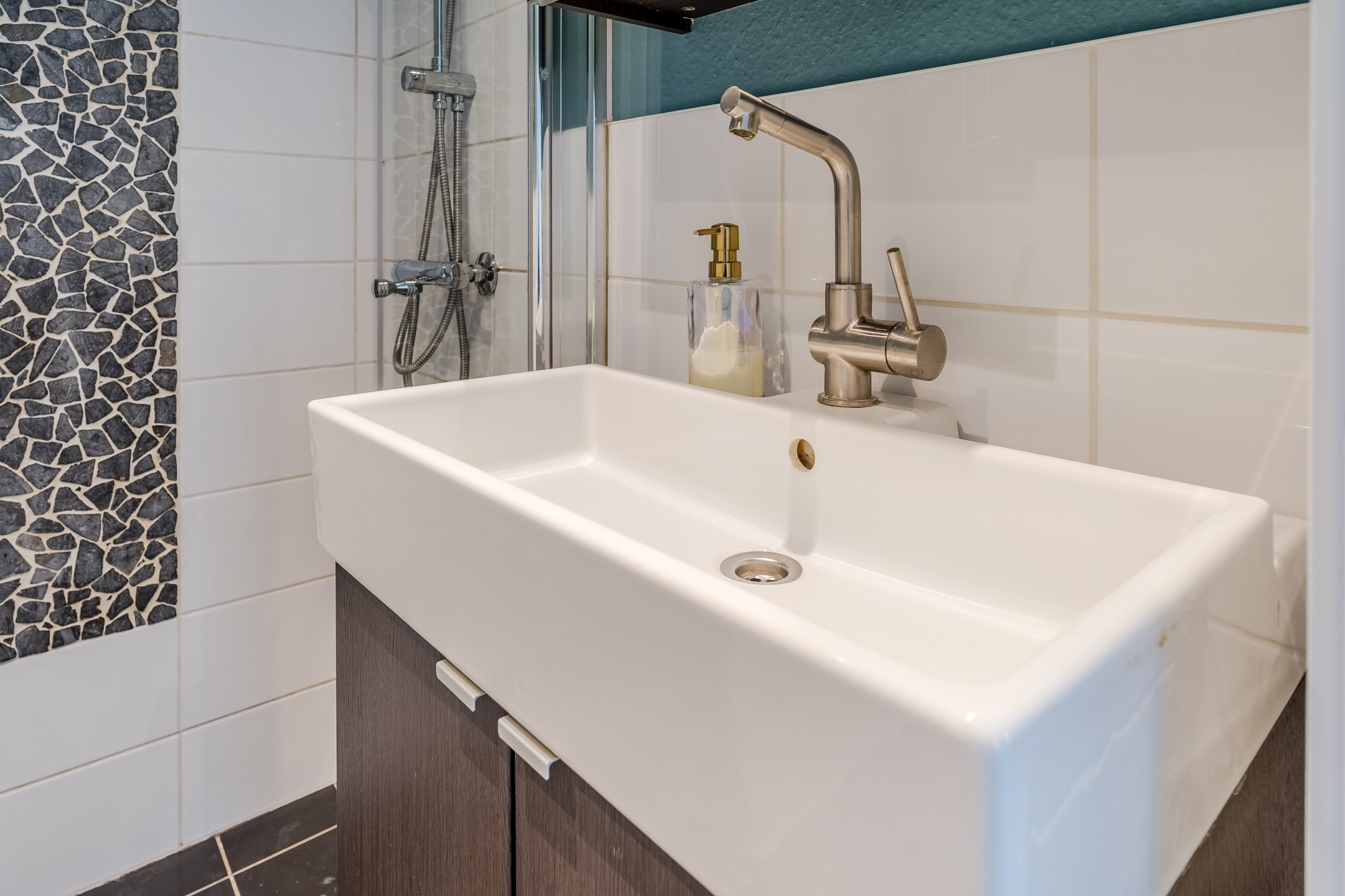 Achter de voordeur vinden we de centrale hal met aan onze rechterhand toegang tot de keuken en de badkamer. De keuken is voorzien van een gaskookplaat en tevens is er hier ruimte om de wasmachine te plaatsen. De badkamer is voorzien van inbouwspots, een zwevend toilet, wastafel met meubel en een inloopregendouche.
