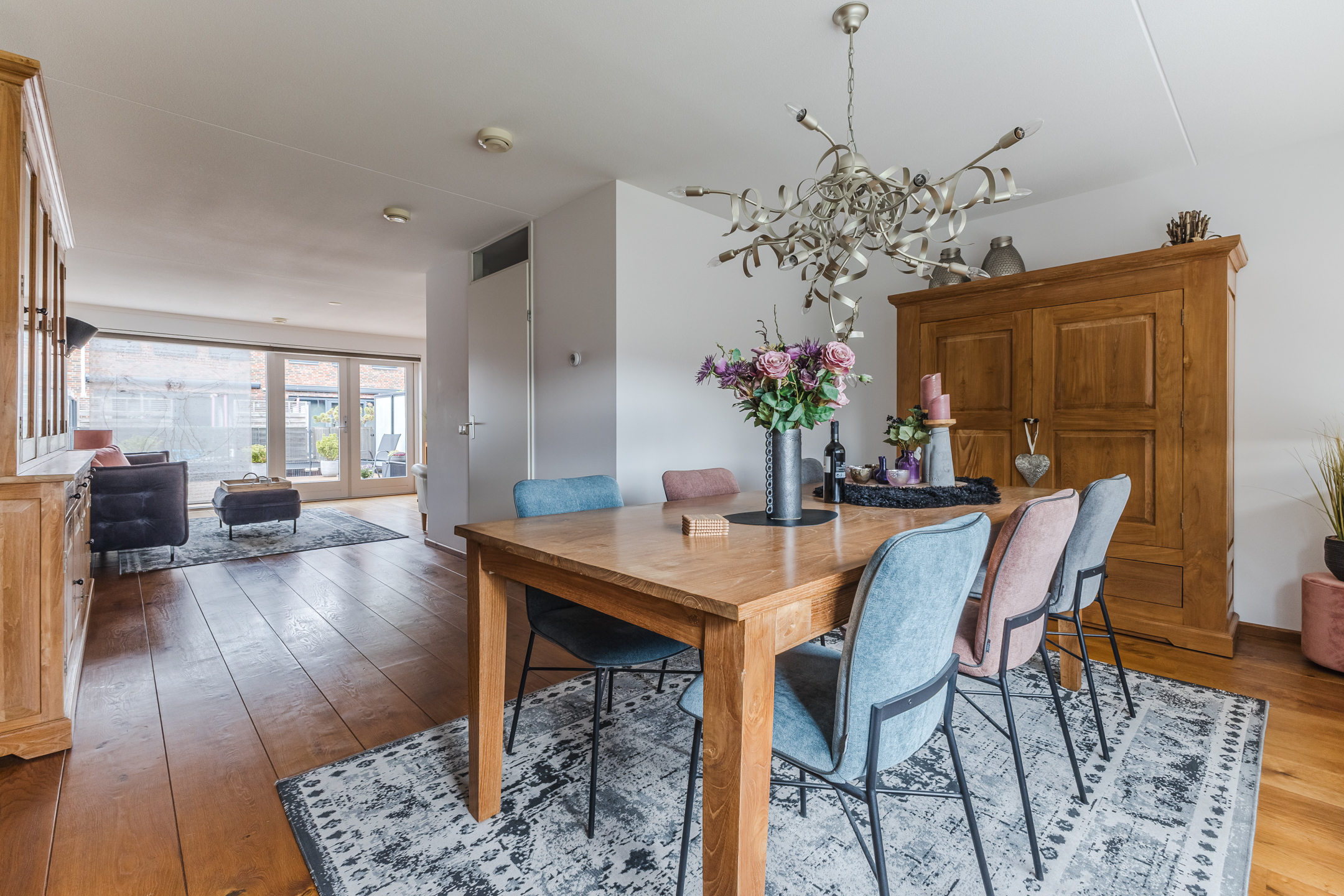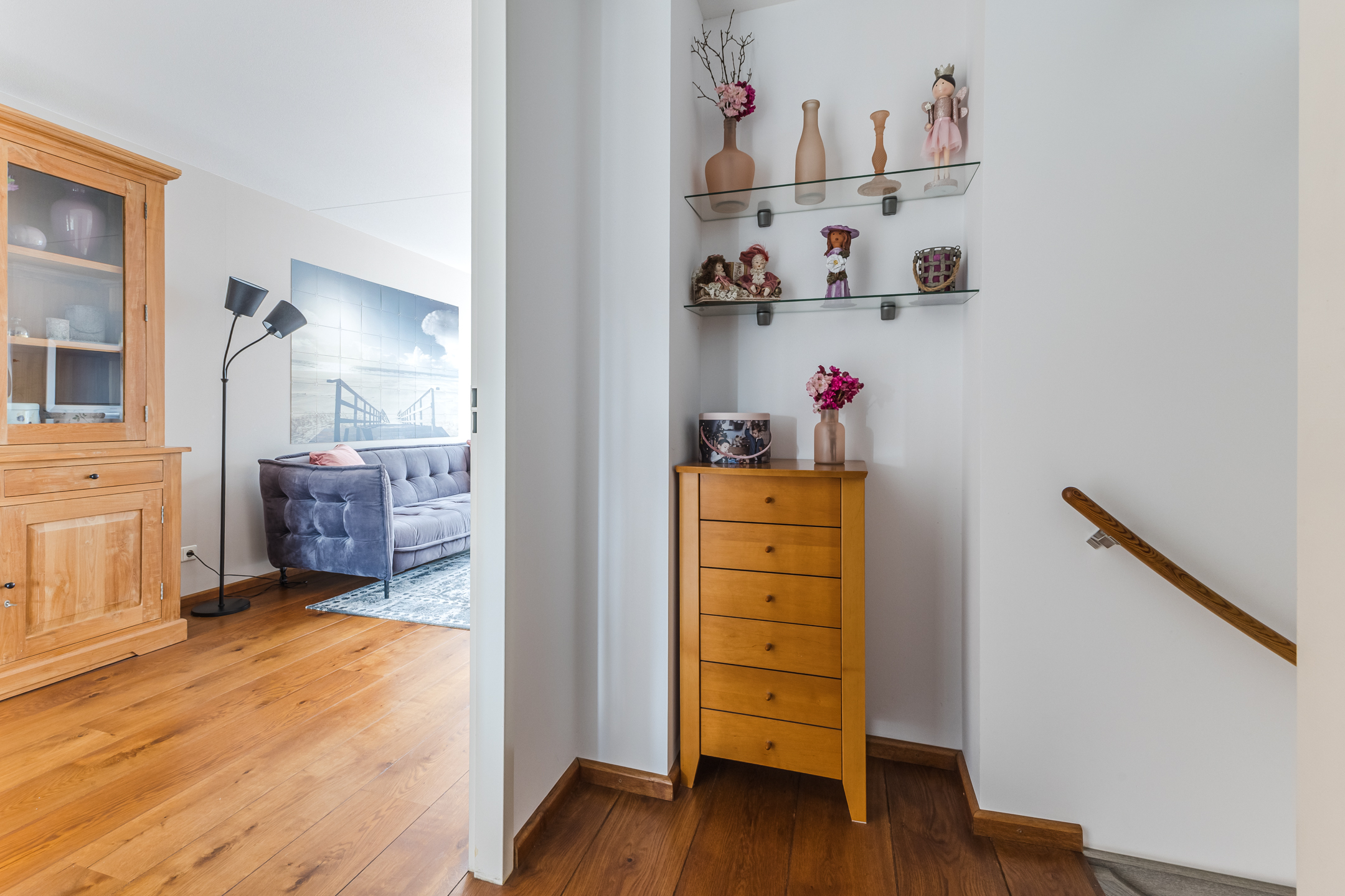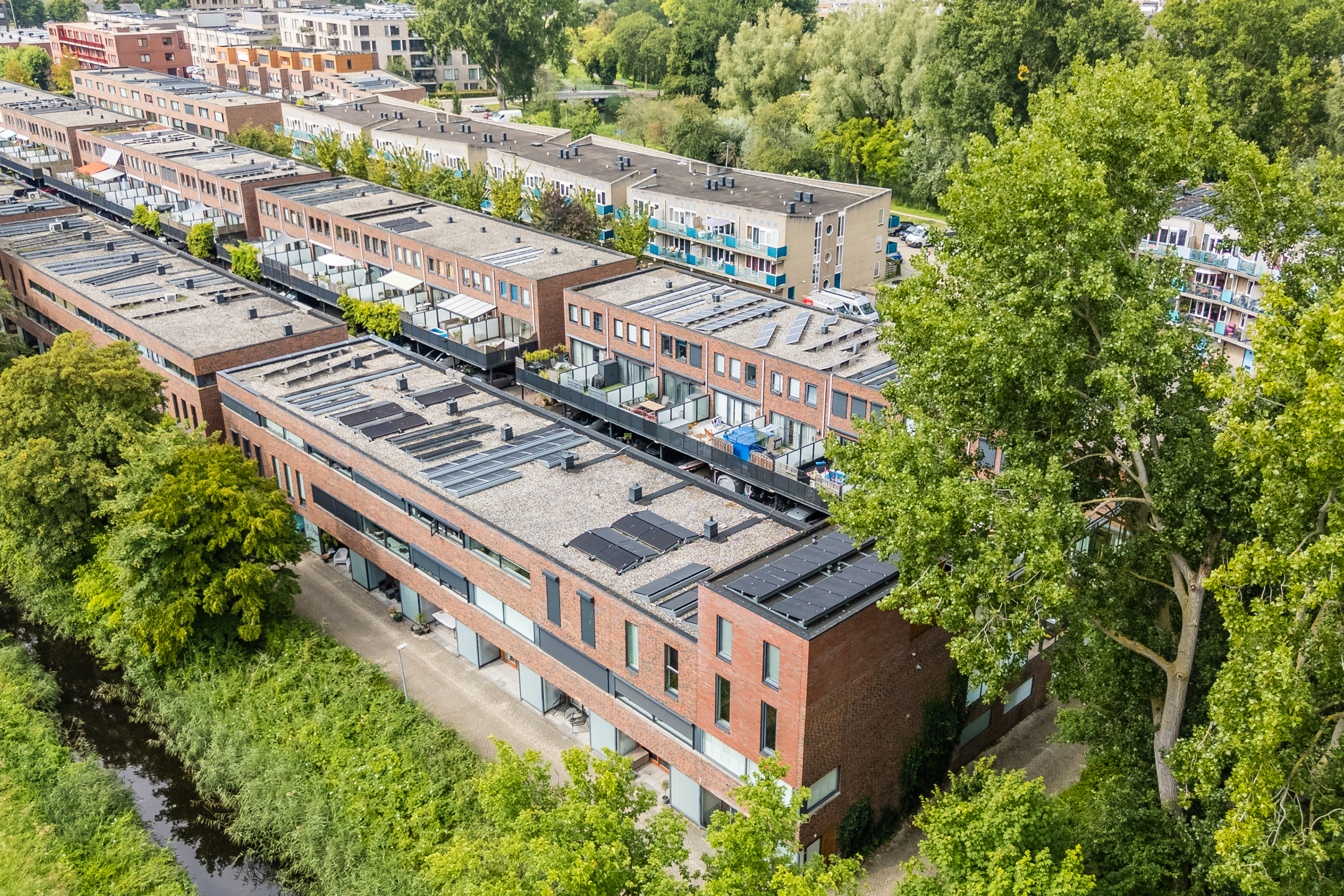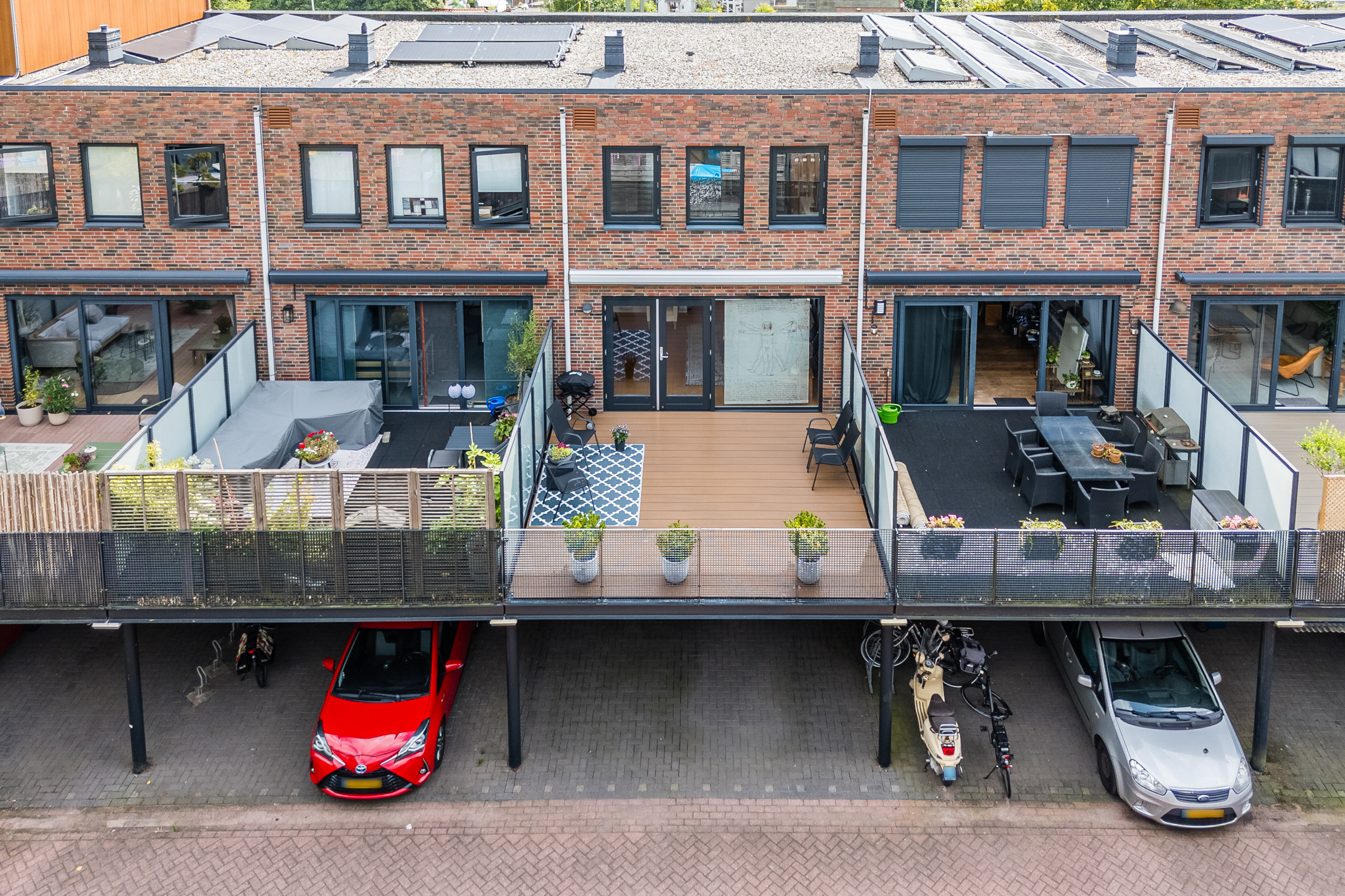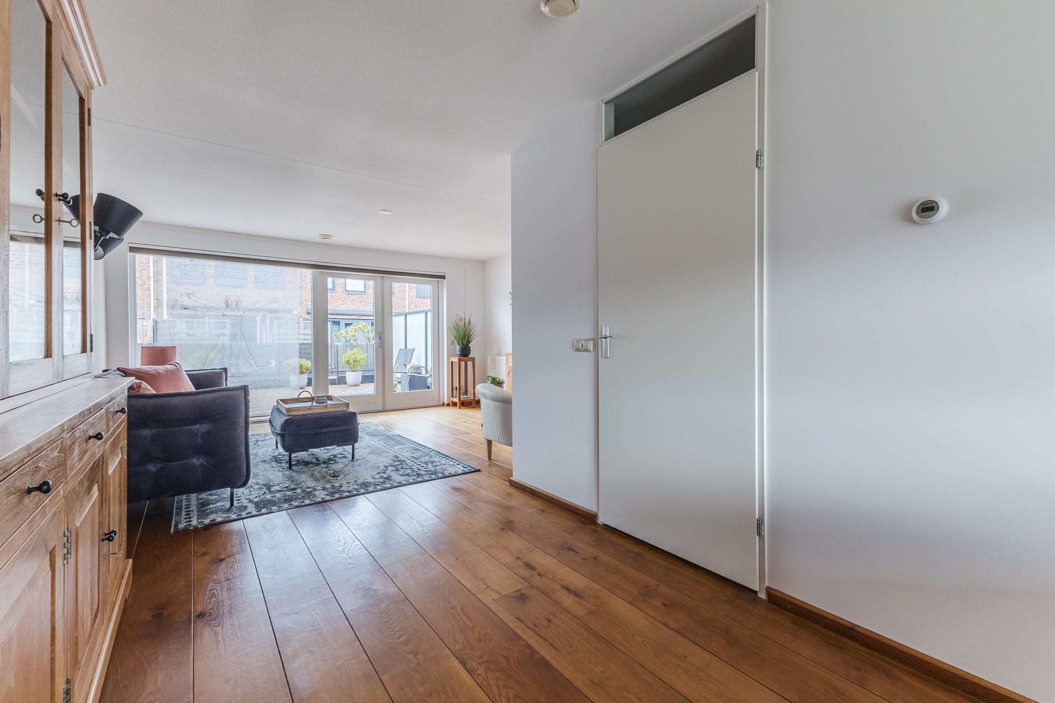 This energie efficient property has a special layout with the living room on the first floor and a ground floor that offers many possibilities for use. In the current layout, you will find here a large living kitchen/dining room with a very spacious utility room, but the realisation of an office/practice space is also very well possible. On the second floor of this large house, you will find the 3 bedrooms and the bathroom.As there are no sloping walls in the house, there is zero loss of space and all floors are of an equal size. From the living room, there is access to a spacious roof terrace of over 25,7 m2 facing the west and therefore enjoys plenty of afternoon and evening sun. Two cars can be parked easily and safely on private property.