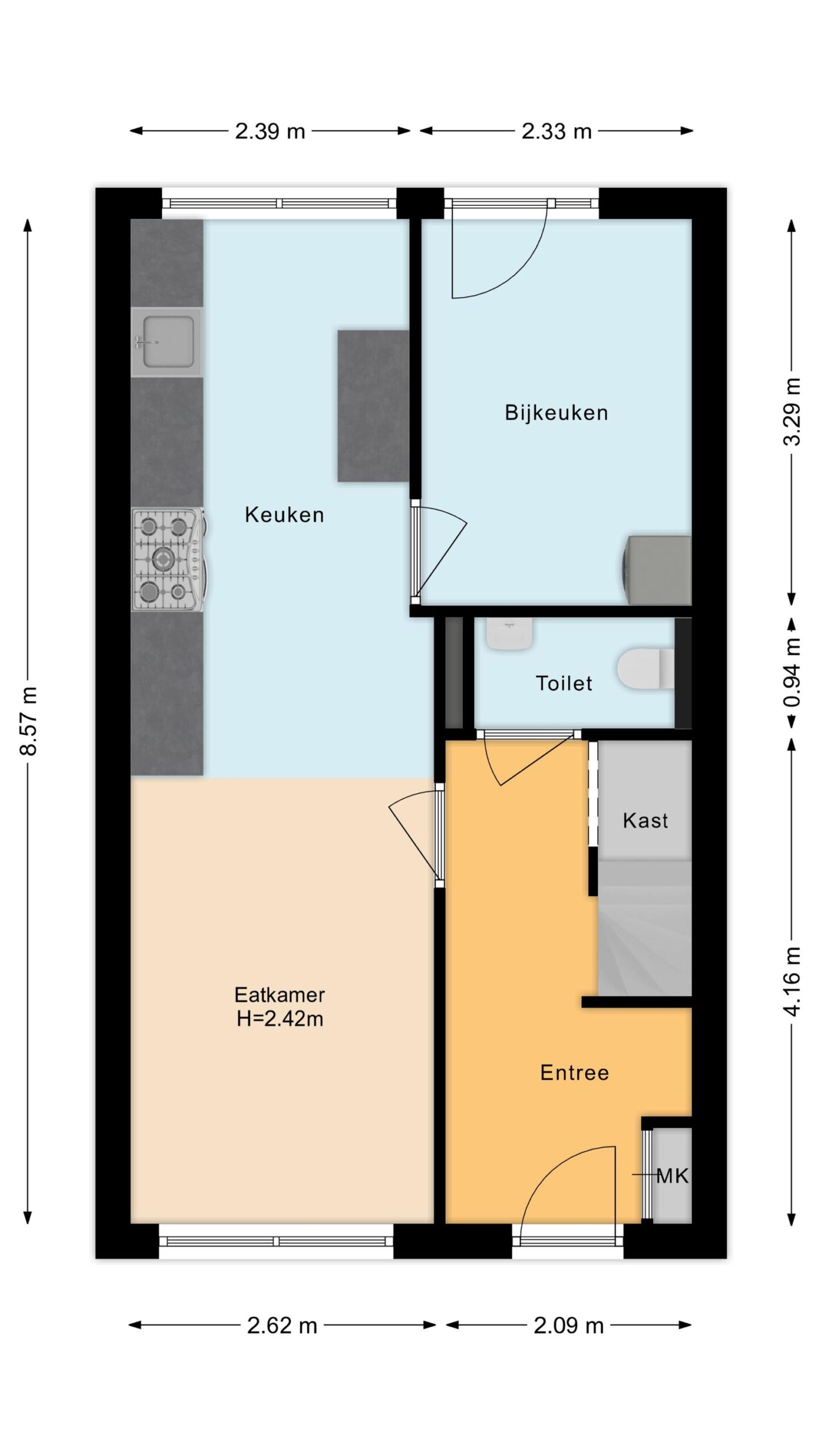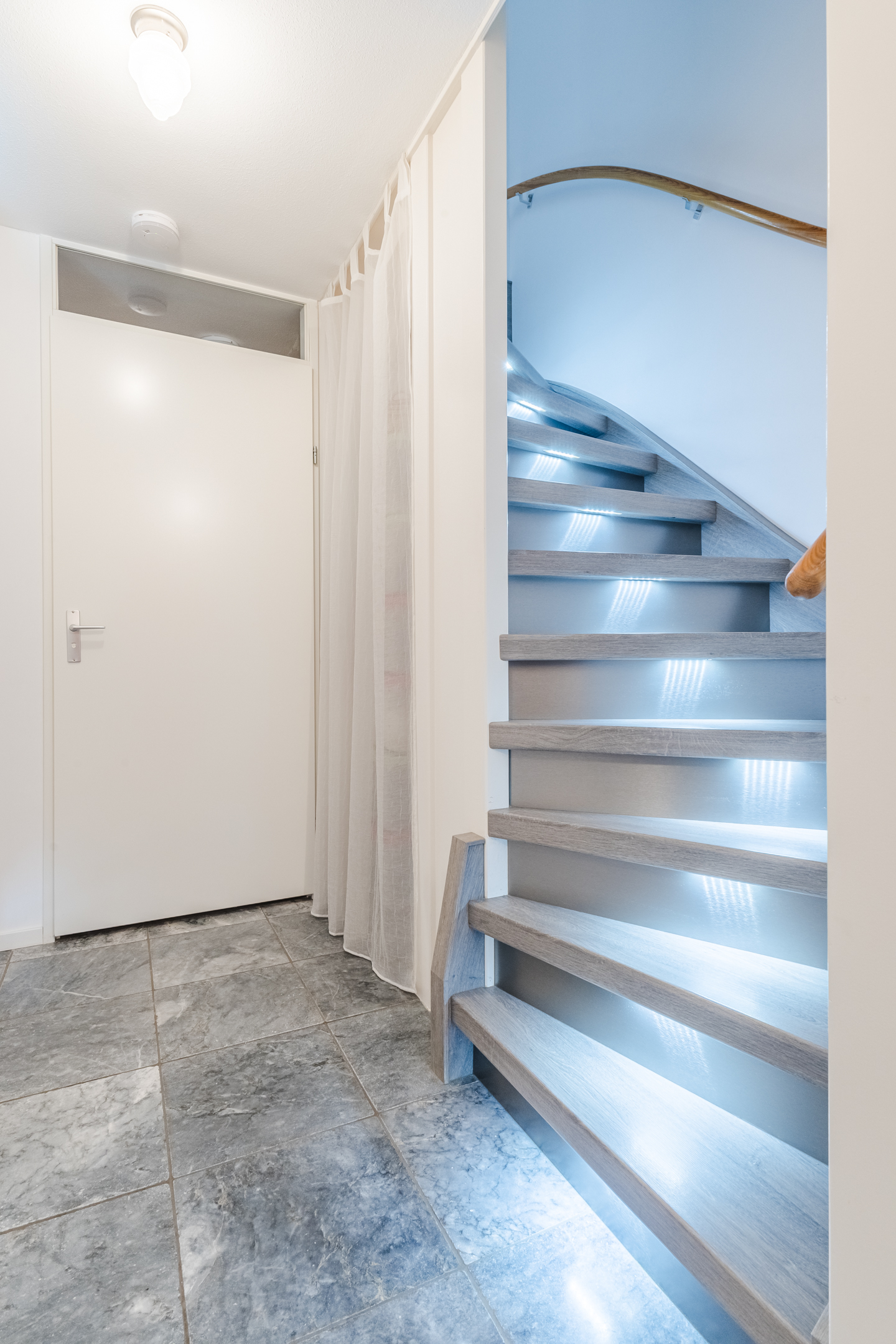 Achter de voordeur vinden we de entree met garderobe, meterkast, gastentoilet met fonteintje, trapopgang naar de eerste verdieping en de toegang tot de leefkeuken/eetkamer.