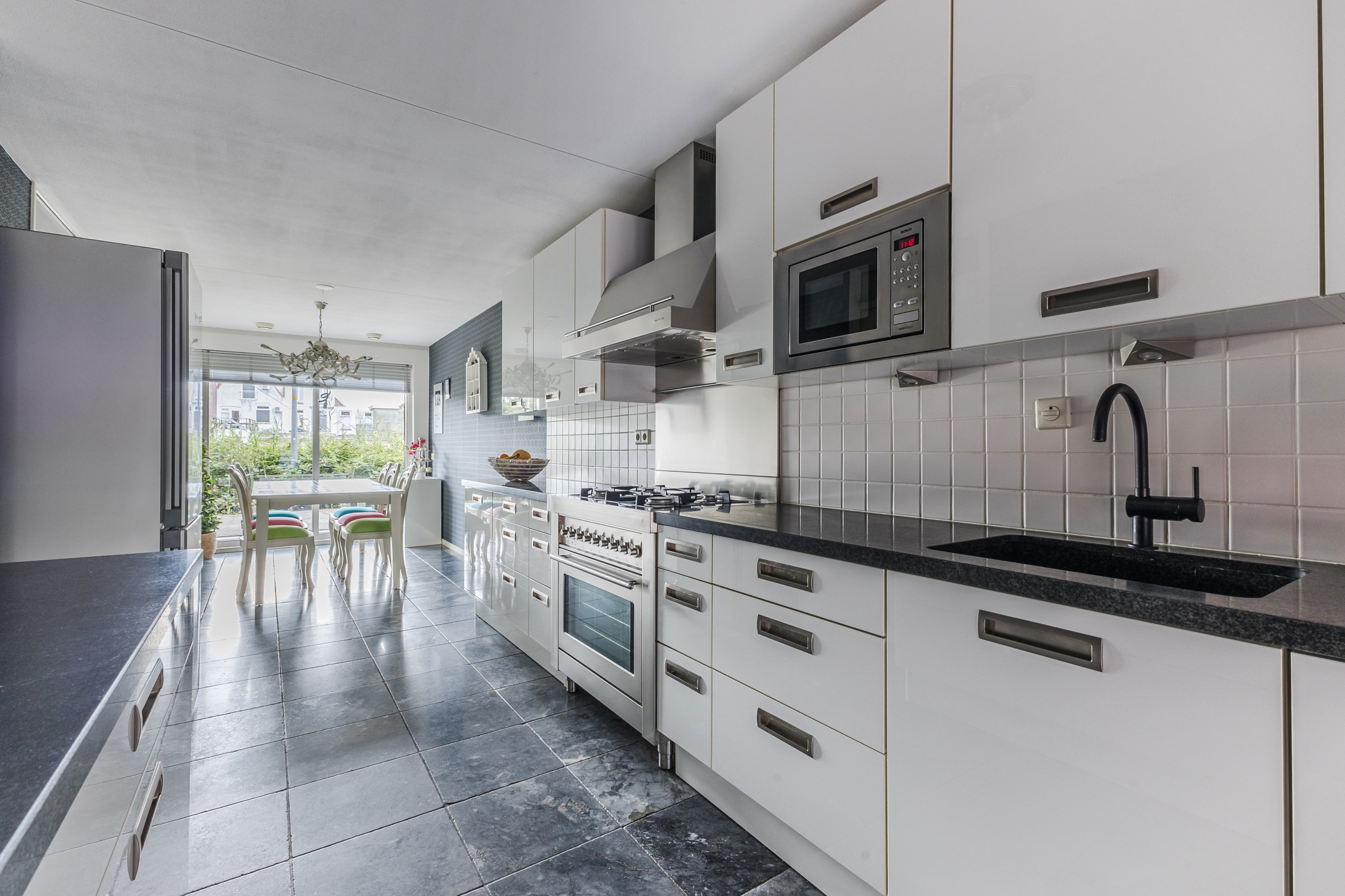 De moderne keuken beschikt over een gasfornuis, oven, magnetron, koelkast en een vaatwasser. Met in een separate ruimte de aansluitingen voor de witgoedopstelling en een achterdeur.