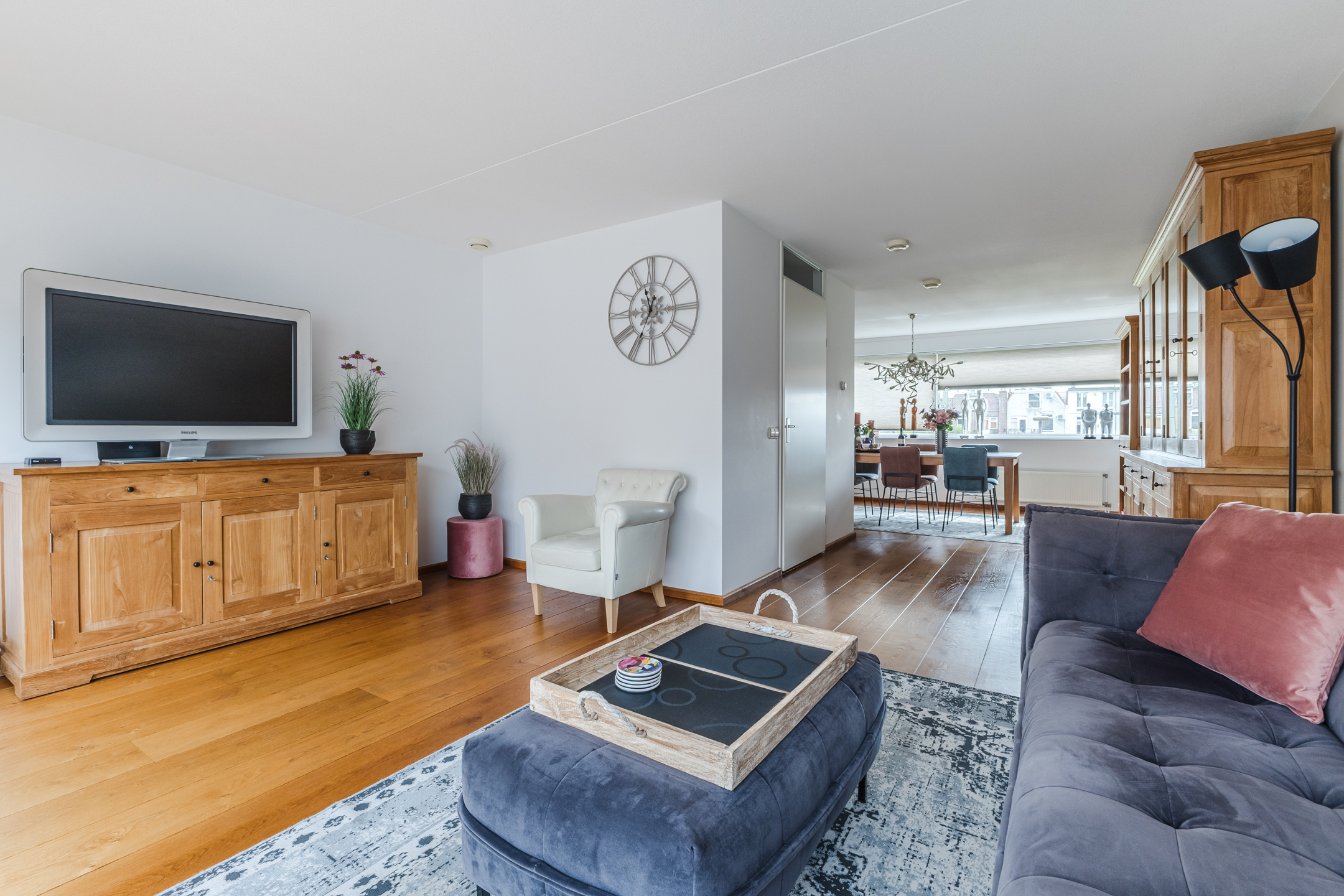 De zonnige woonkamer strekt zich uit over de gehele lengte van het huis en heeft aan de achterzijde openslaande deuren richting het dakterras. De grote ramen aan zowel de voor- als achterzijde zorgen voor een grote hoeveelheid lichtinval en het geheel is afgewerkt met een houten vloer.