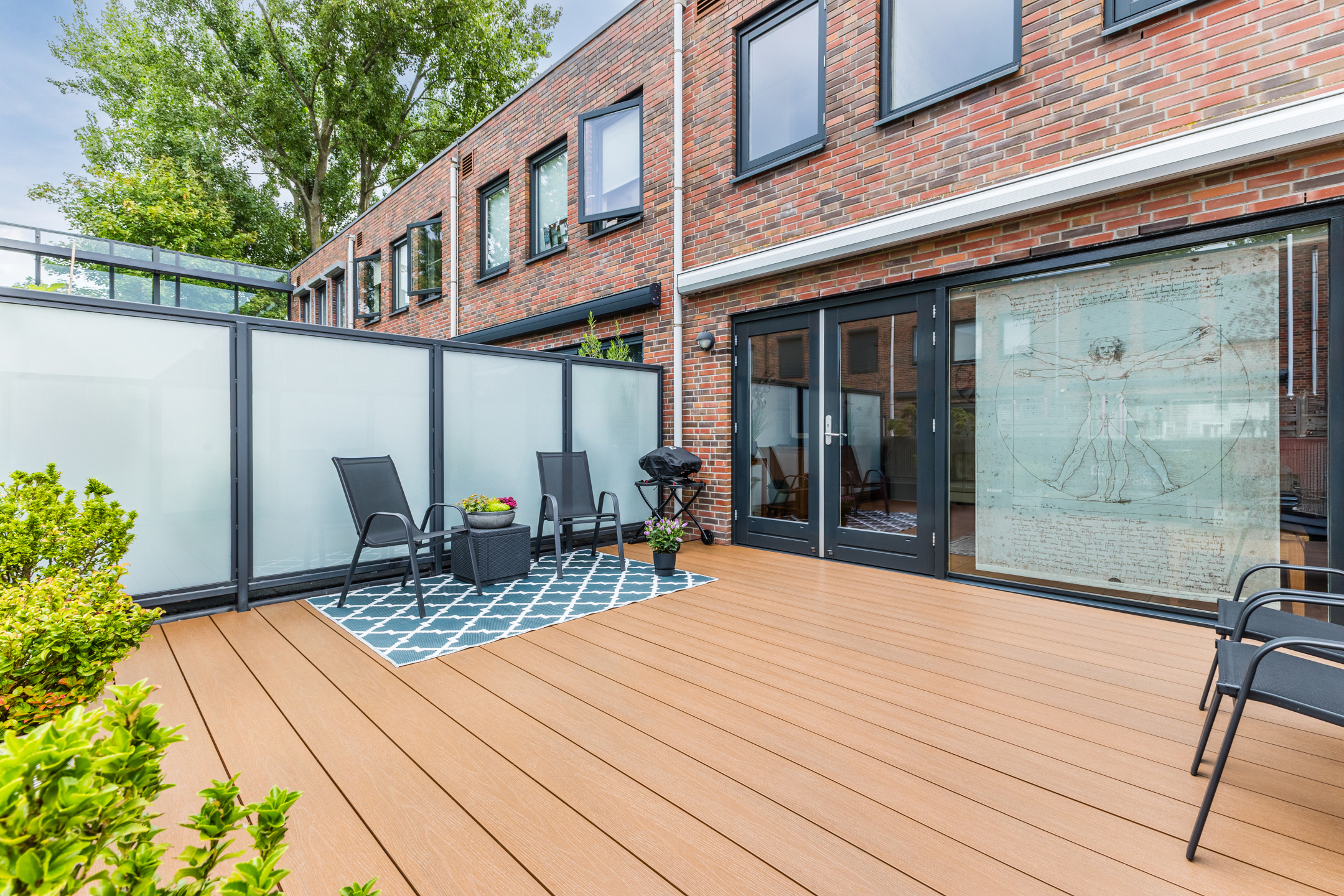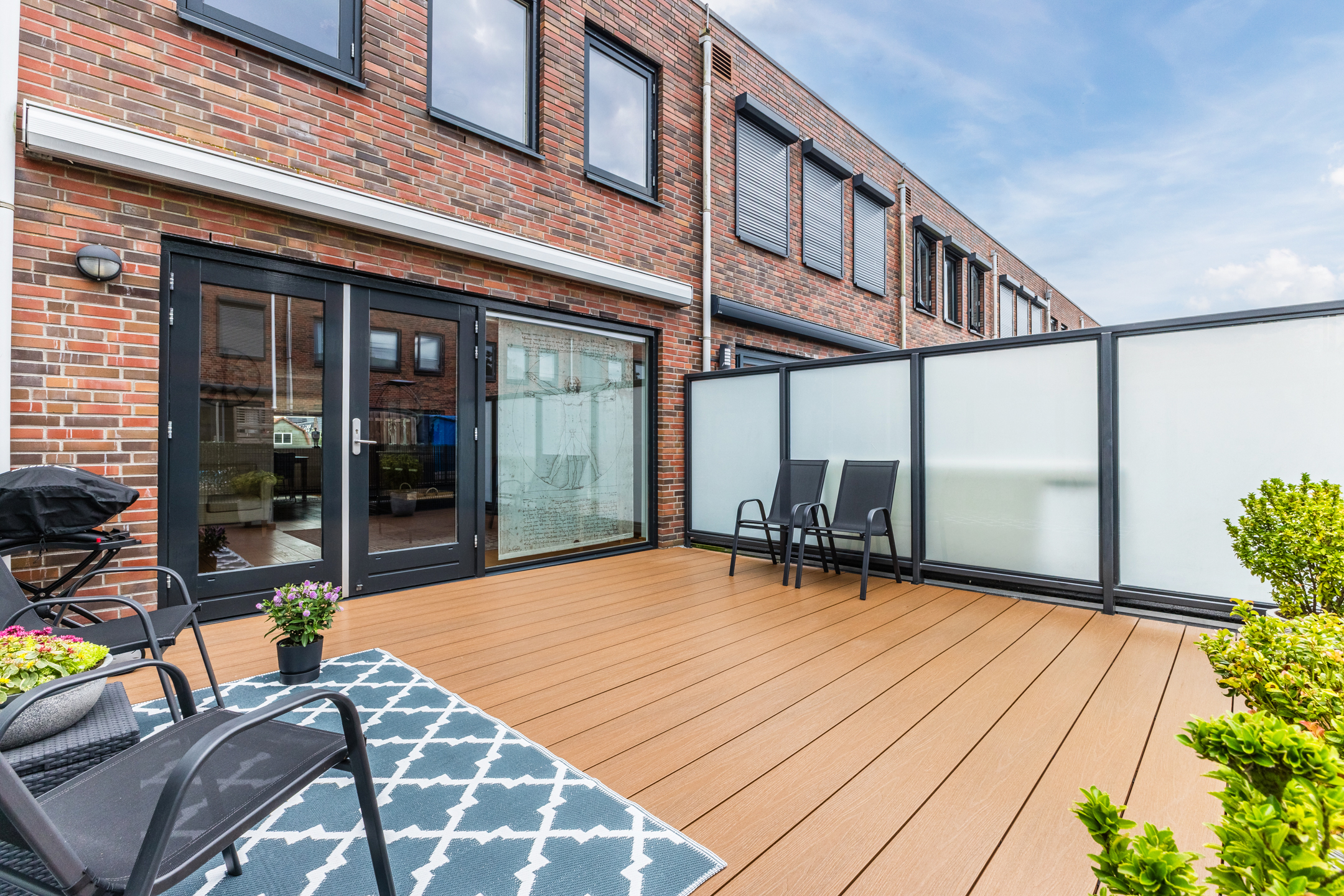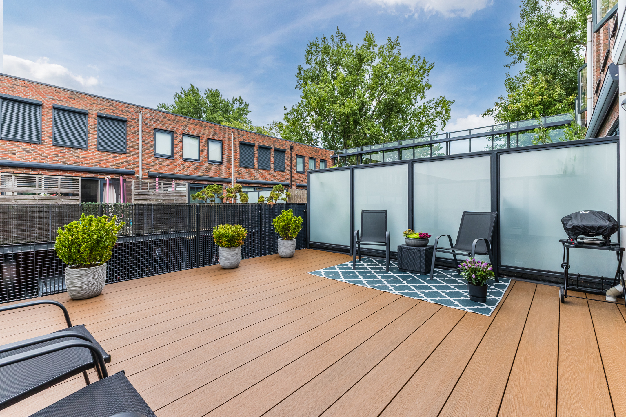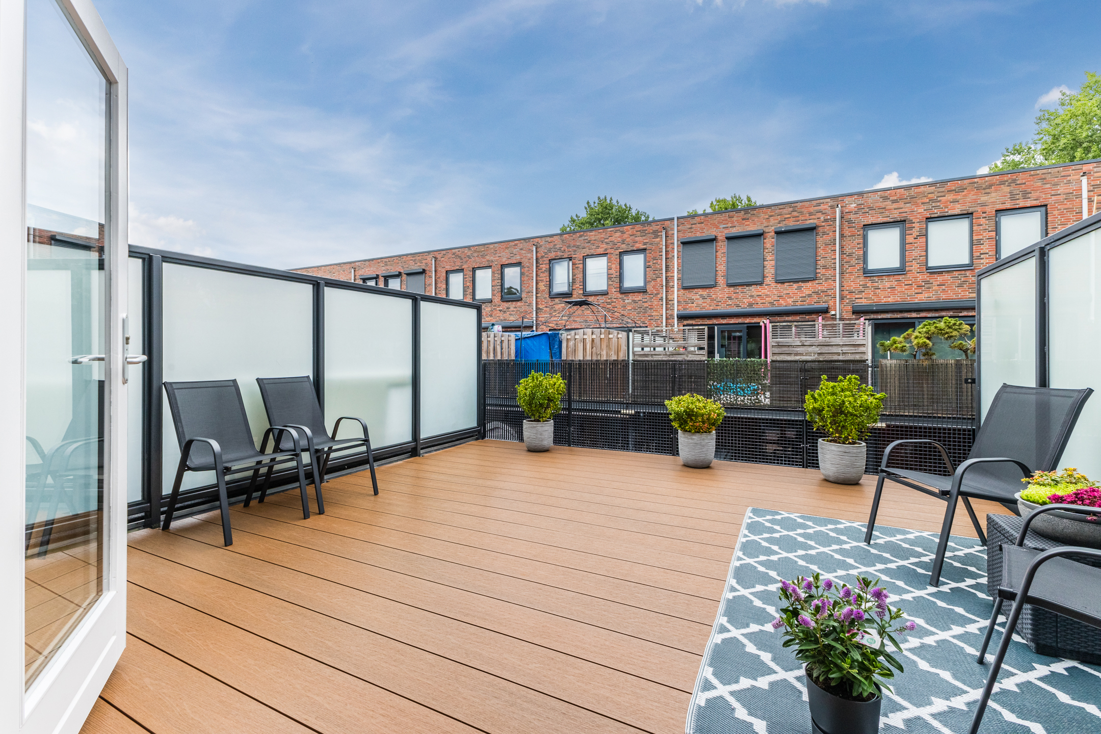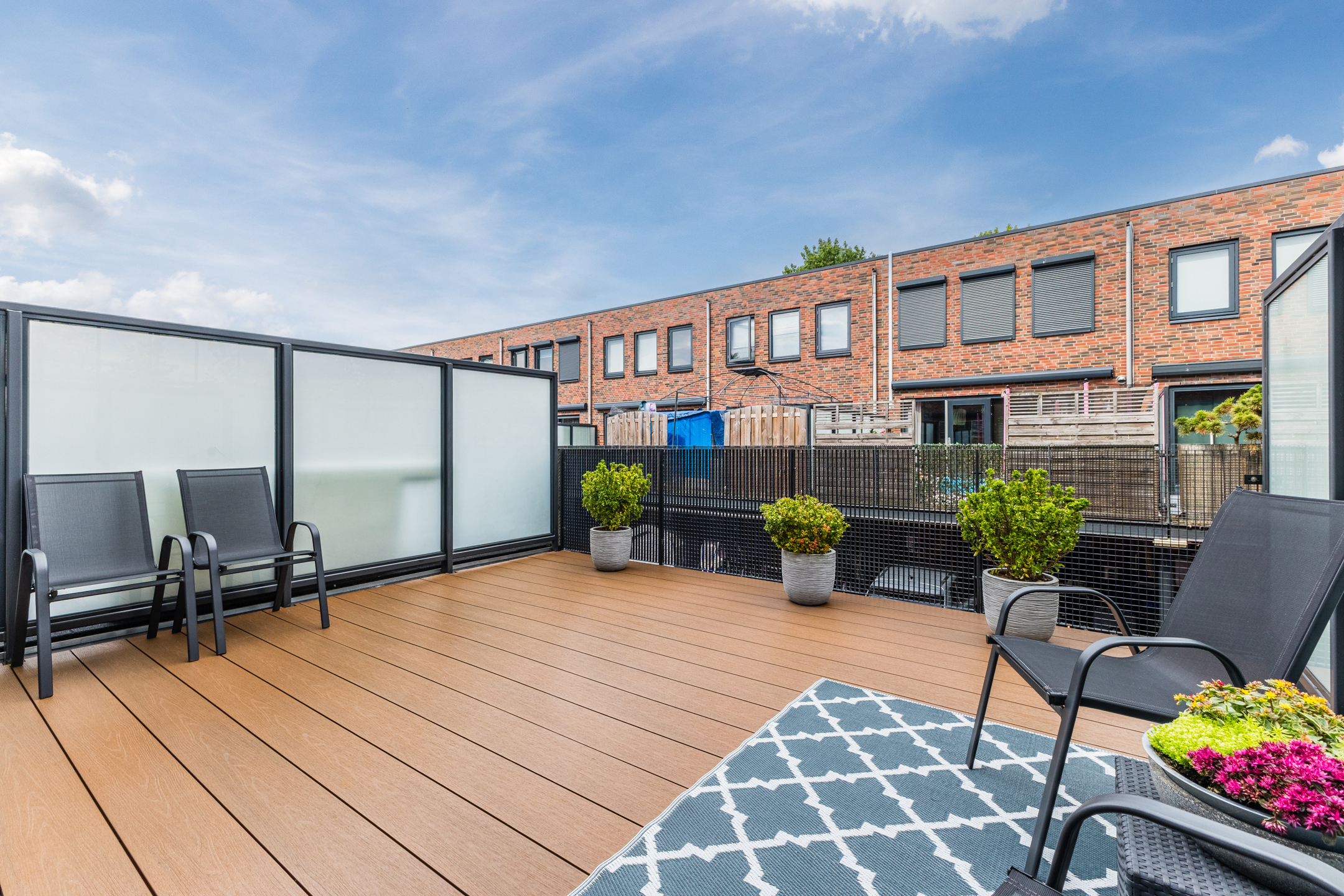 Het zonnige en ruime dakterras op het westen beschikt over een groot vlonderterras dat is vernieuwd in 2024 (tech wood).