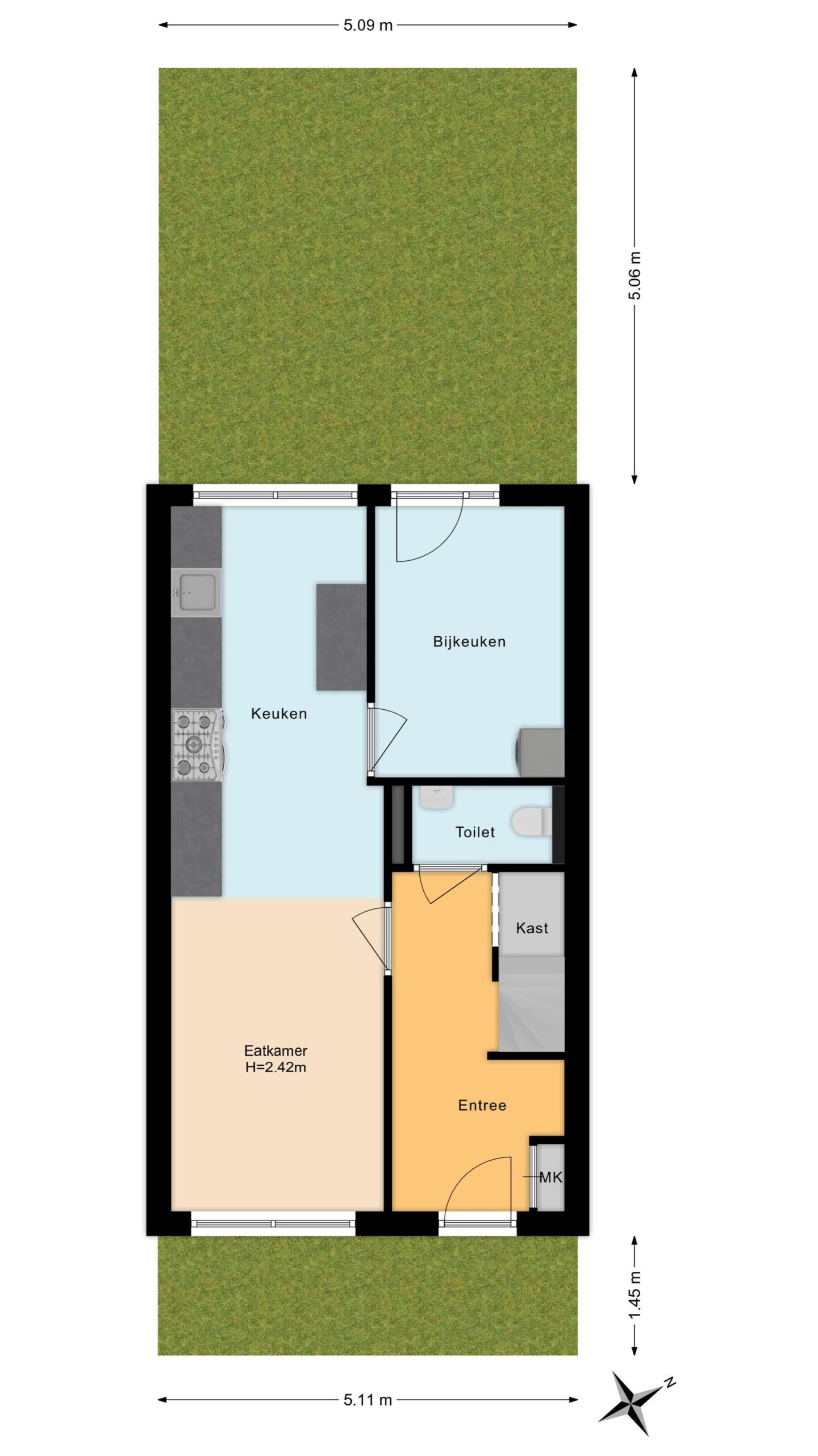 Behind the front door, we find the entrance with wardrobe, meter closet, guest toilet with hand basin, staircase to the first floor and access to kitchen / dining room.