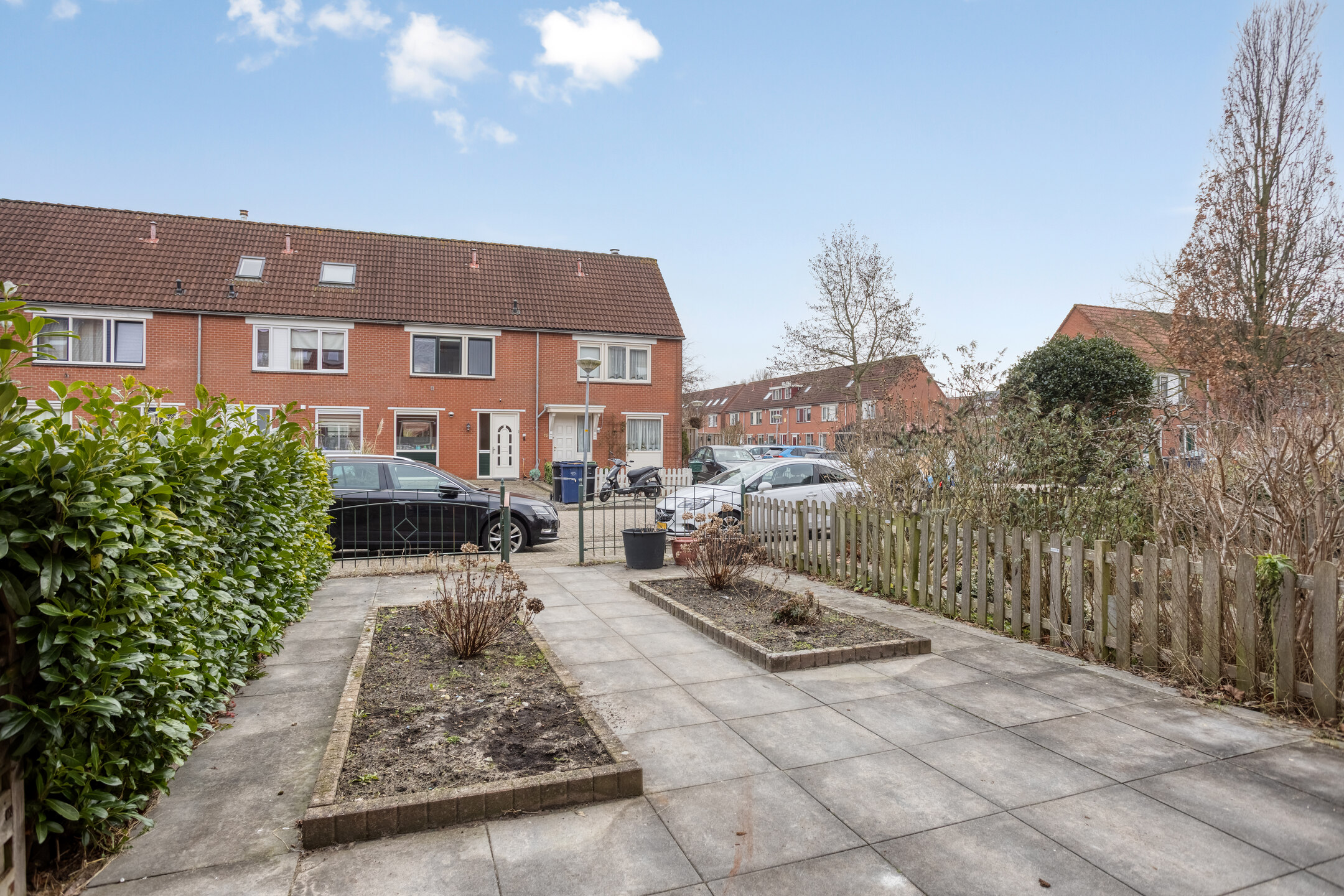 Achter de woning ligt een diepe, onderhoudsvriendelijk aangelegde tuin met bestrating en vaste beplanting. Er is ruimte voor meerdere zitplekken; de tuin is bereikbaar vanuit de woonkamer en via een achterom. Aan de voorzijde beschikt de woning eveneens over een diepe tuin, in het hard aangelegd met plantenvakken. Parkeren kan in de openbare parkeervakken direct voor de woning.
