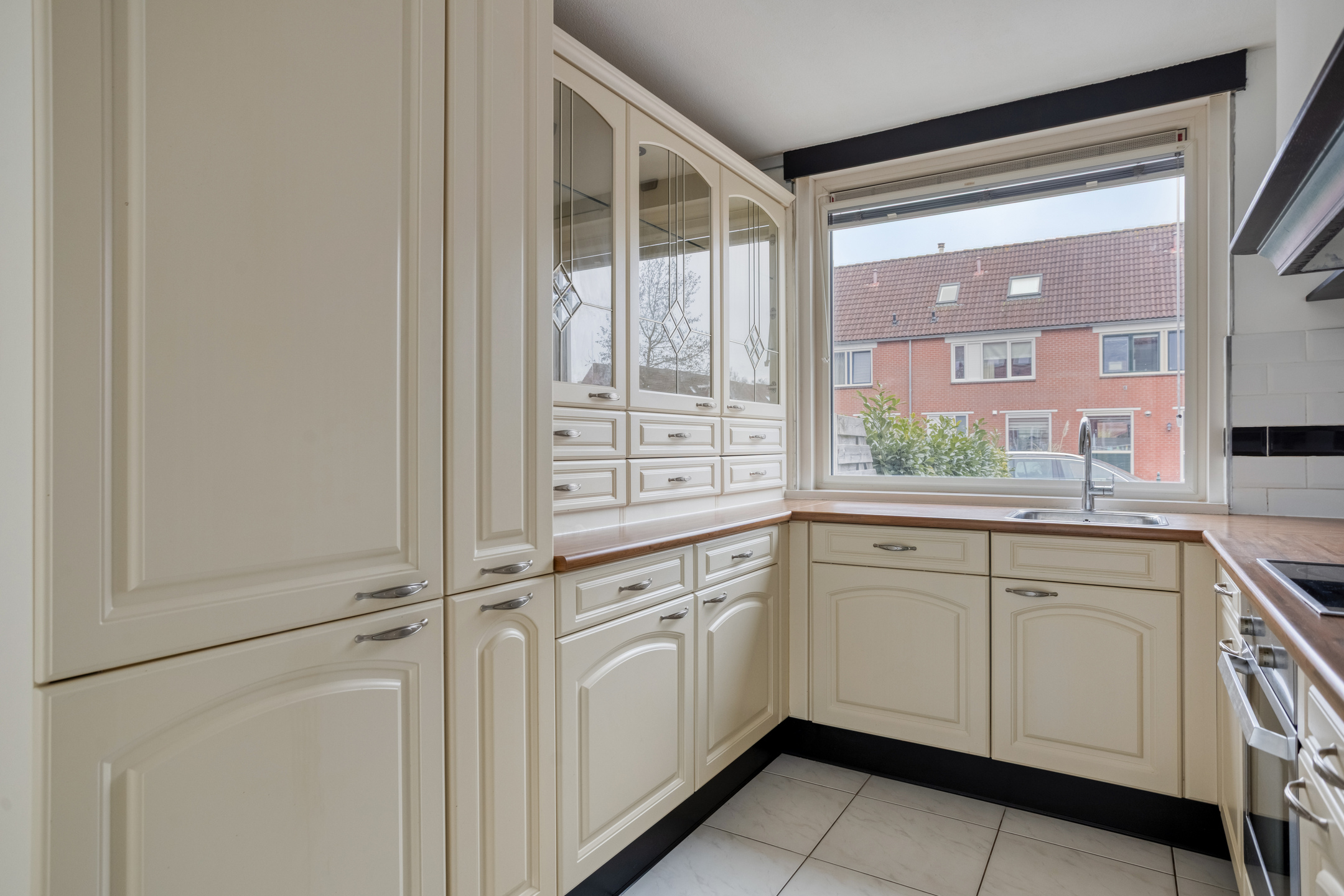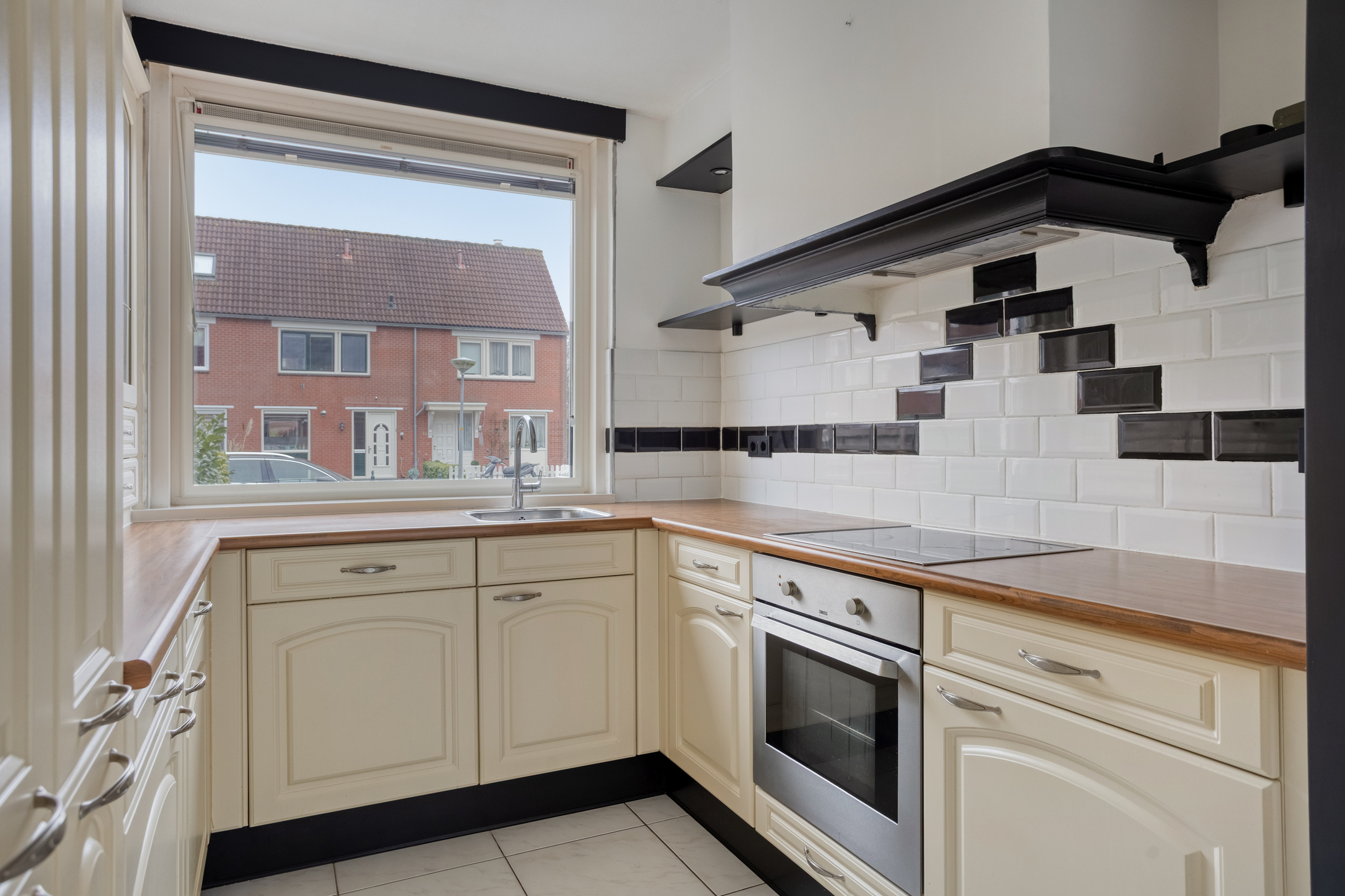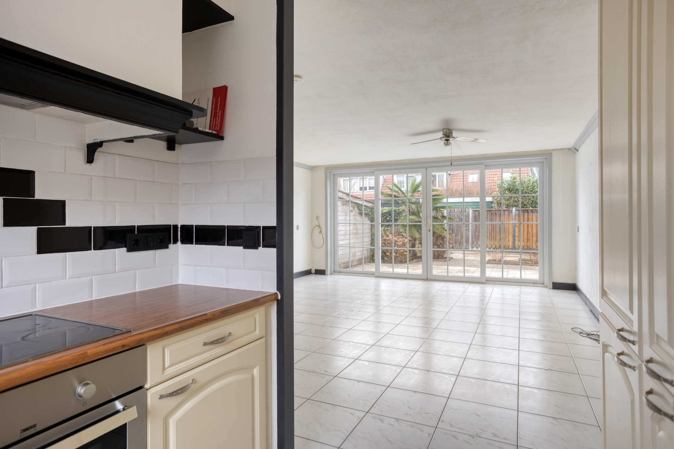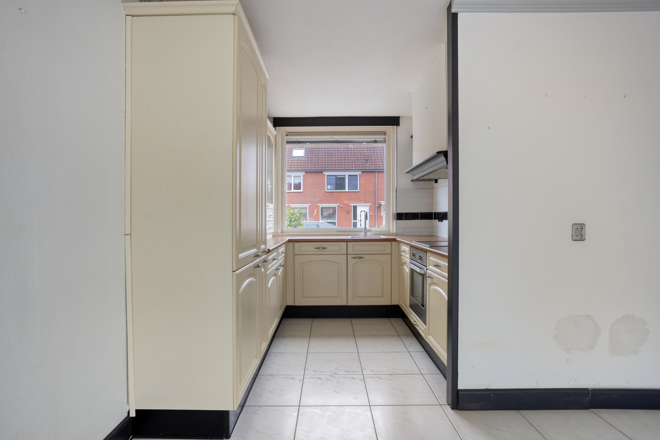 The property is accessed via the private front door on the street side. Immediately upon entering, there is access to the toilet, the meter cupboard, and the staircase to the upper floors. From the entrance hall, you proceed to the living room, which is situated at the rear of the property. This space extends across the full width and is characterized by wide sliding doors opening onto the garden, creating a clear and pleasant connection between indoor and outdoor living. Located at the front of the house, the kitchen is arranged in a practical layout with various base and wall units. The worktop is positioned in front of the window, allowing for enjoyable natural light while cooking. The kitchen is equipped with a hob, extractor hood, oven, fridge-freezer combination, and dishwasher.