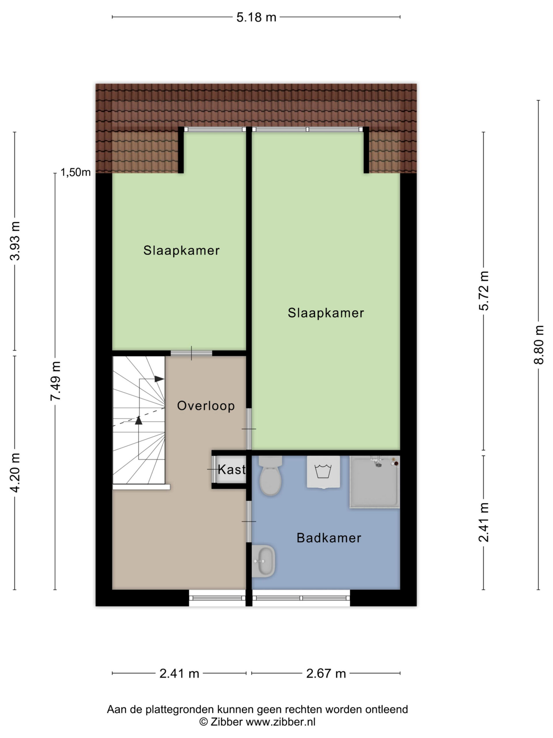 Op de eerste verdieping zijn twee ruime slaapkamers (3.93 x 2.41 en 5.72 x 2.67) aanwezig, beide geschikt voor gebruik als slaap-, werk- of kinderkamer en voorzien van dakkapel. De badkamer is centraal gesitueerd en uitgerust met een douche, wastafel, toilet en de witgoedaansluitingen. Qua afwerking is deze ruimte functioneel, met ruimte voor modernisering. Op de ruime overloop is er tevens genoeg plek voor een werkplek of een wandkast.