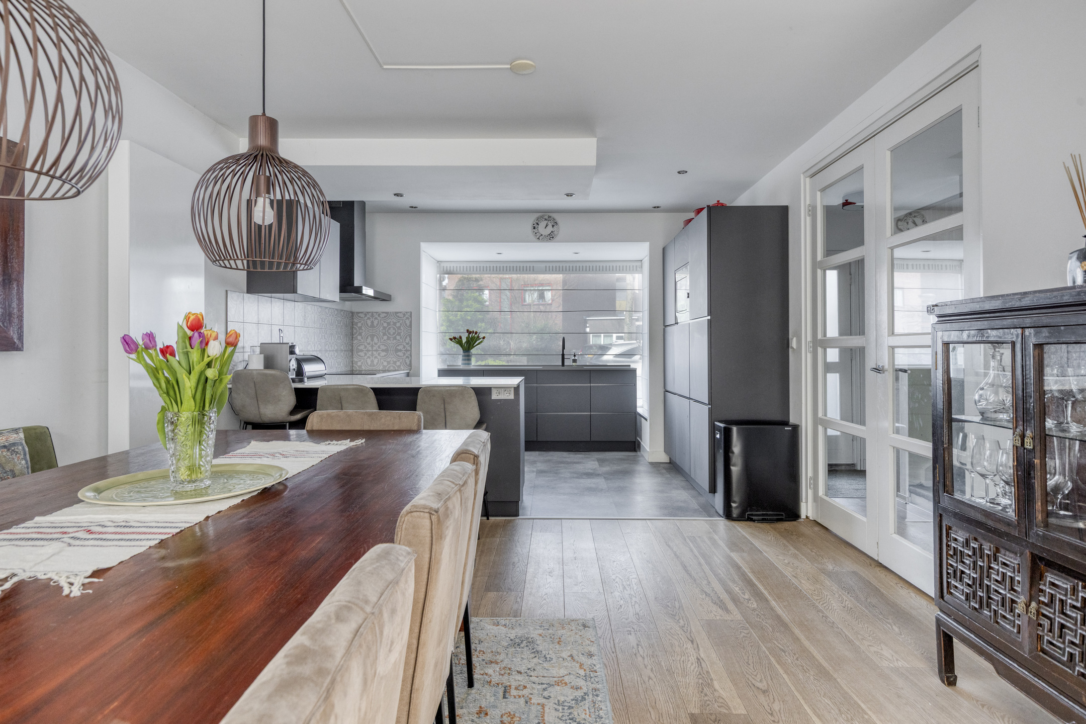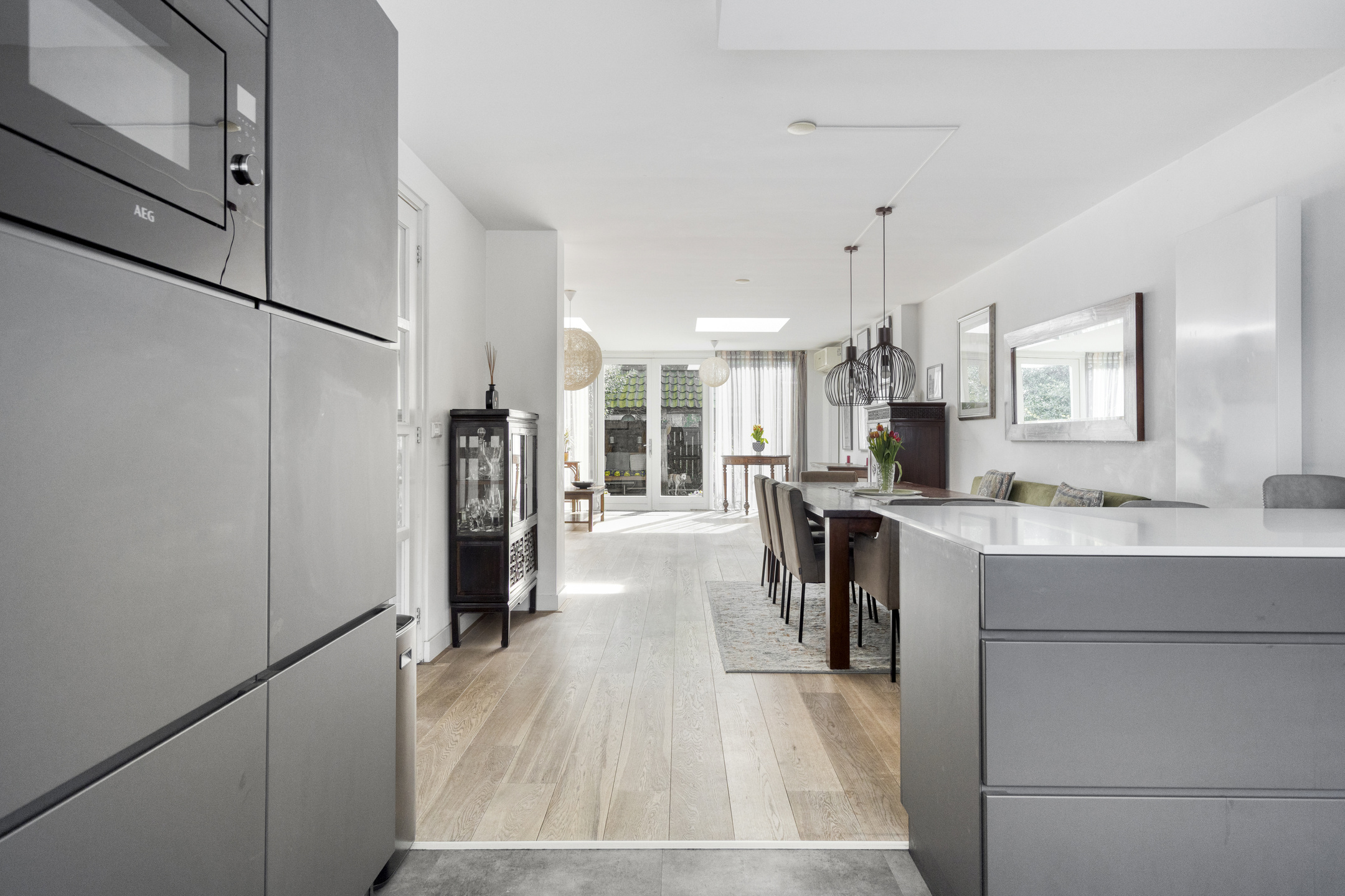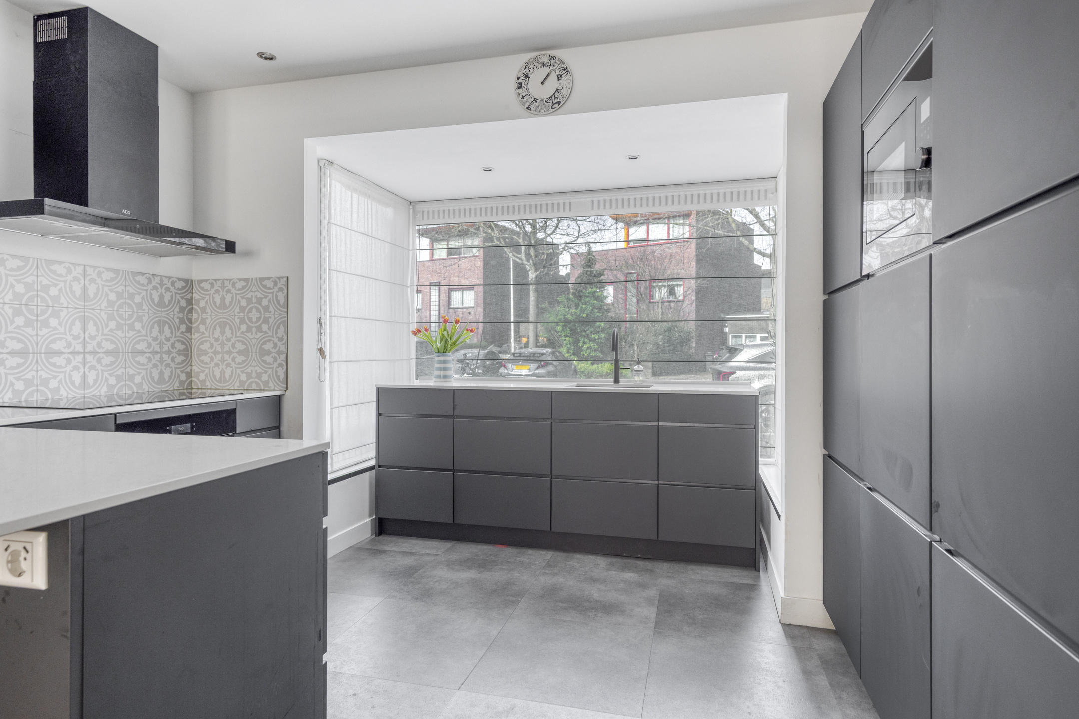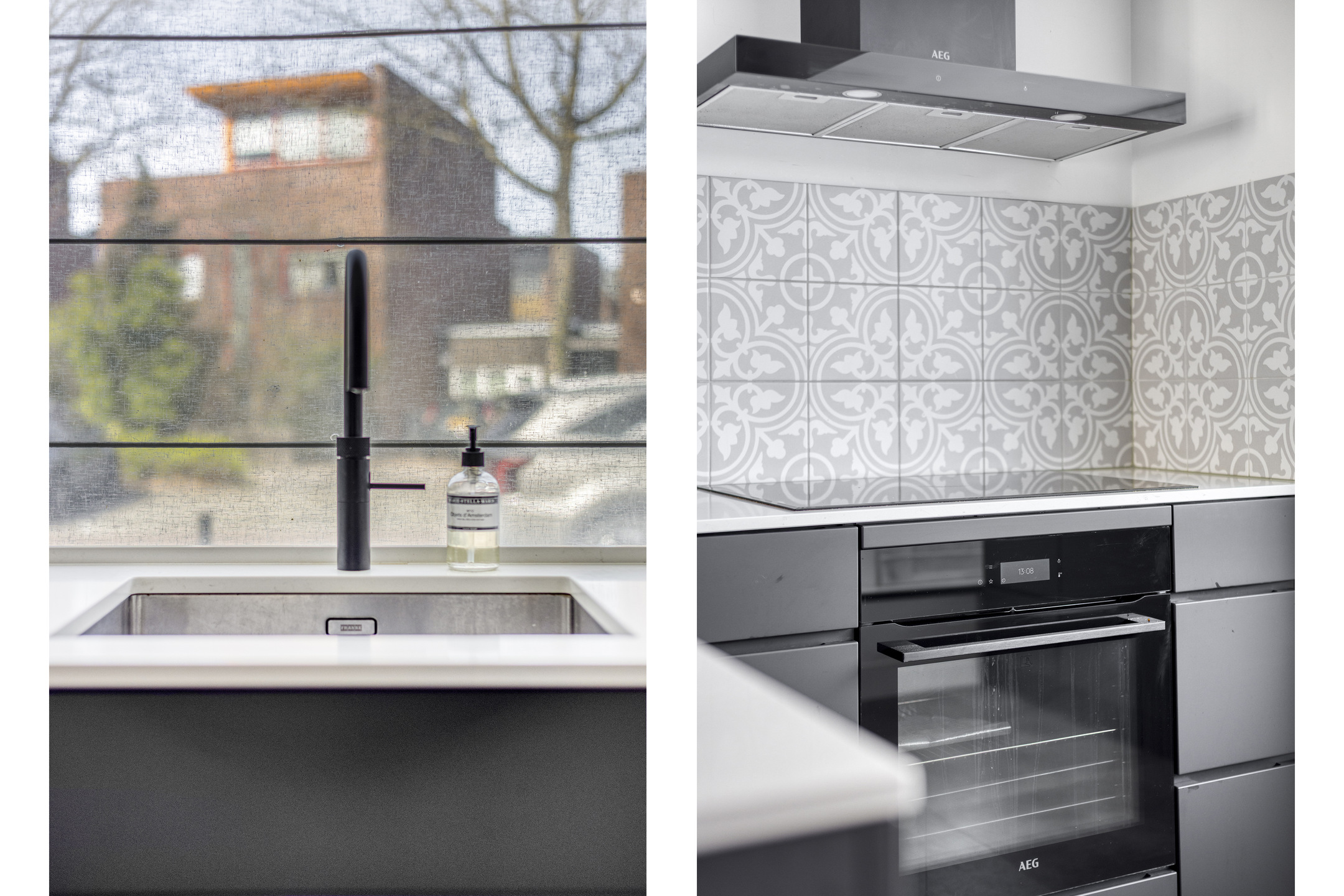 Aan de voorzijde van de woning bevindt zich de moderne open keuken, die in 2024 volledig is vernieuwd. De keuken is strak uitgevoerd en voorzien van hoogwaardige inbouwapparatuur, waaronder een inductiekookplaat, afzuigkap, Quooker, oven, magnetron, grote koelkast, vriezer en vaatwasser. Dankzij de praktische indeling en ruime opbergmogelijkheden is dit een heerlijke plek om te koken en samen te komen.