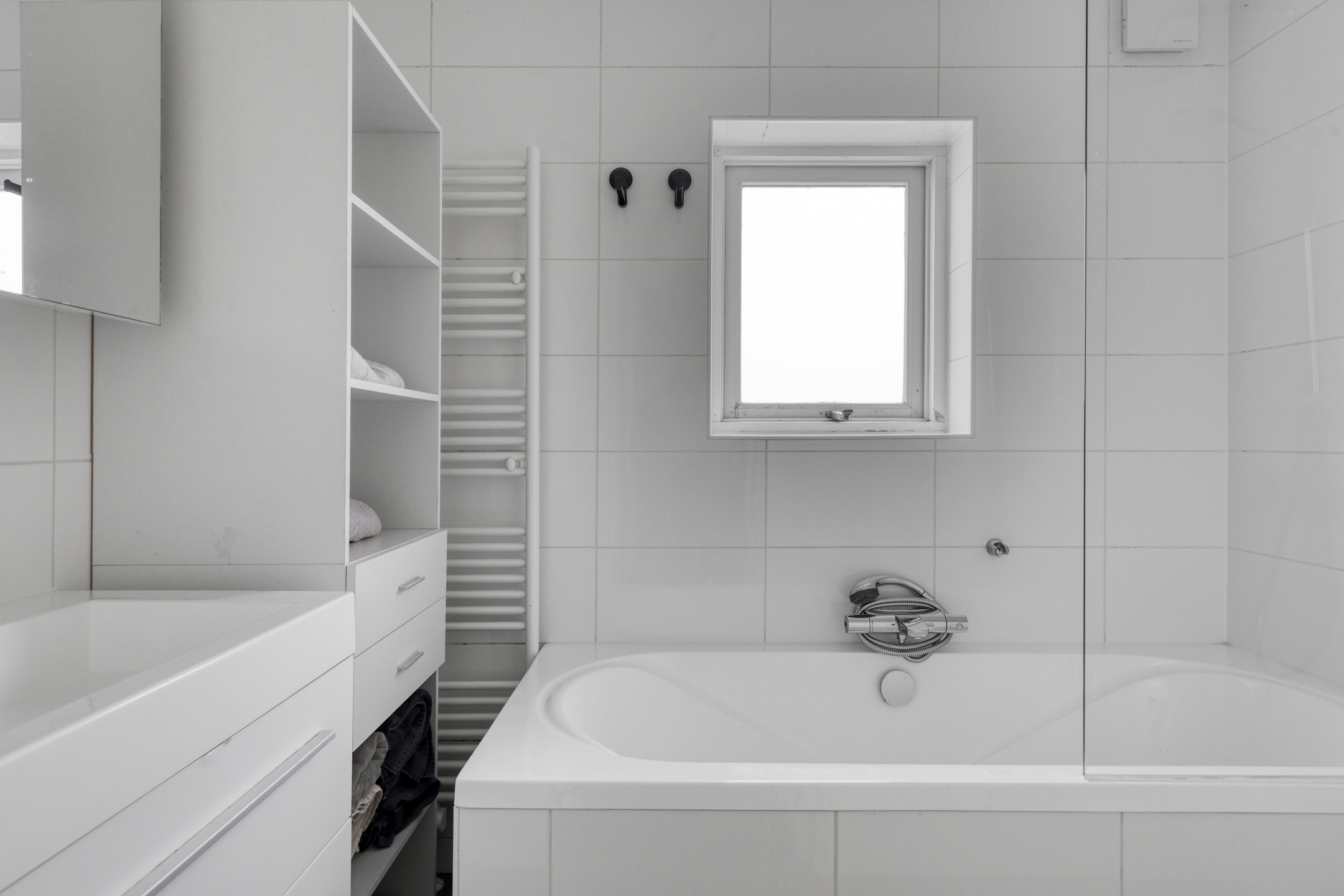 De moderne badkamer grenst aan de overloop en is volledig betegeld. Hier beschikt u over een comfortabel ligbad, een douche, een wastafel met spiegel en een praktisch opbergmeubel. Daarnaast is er een handdoekradiator aanwezig. De separate toiletruimte op deze verdieping zorgt voor extra gemak.