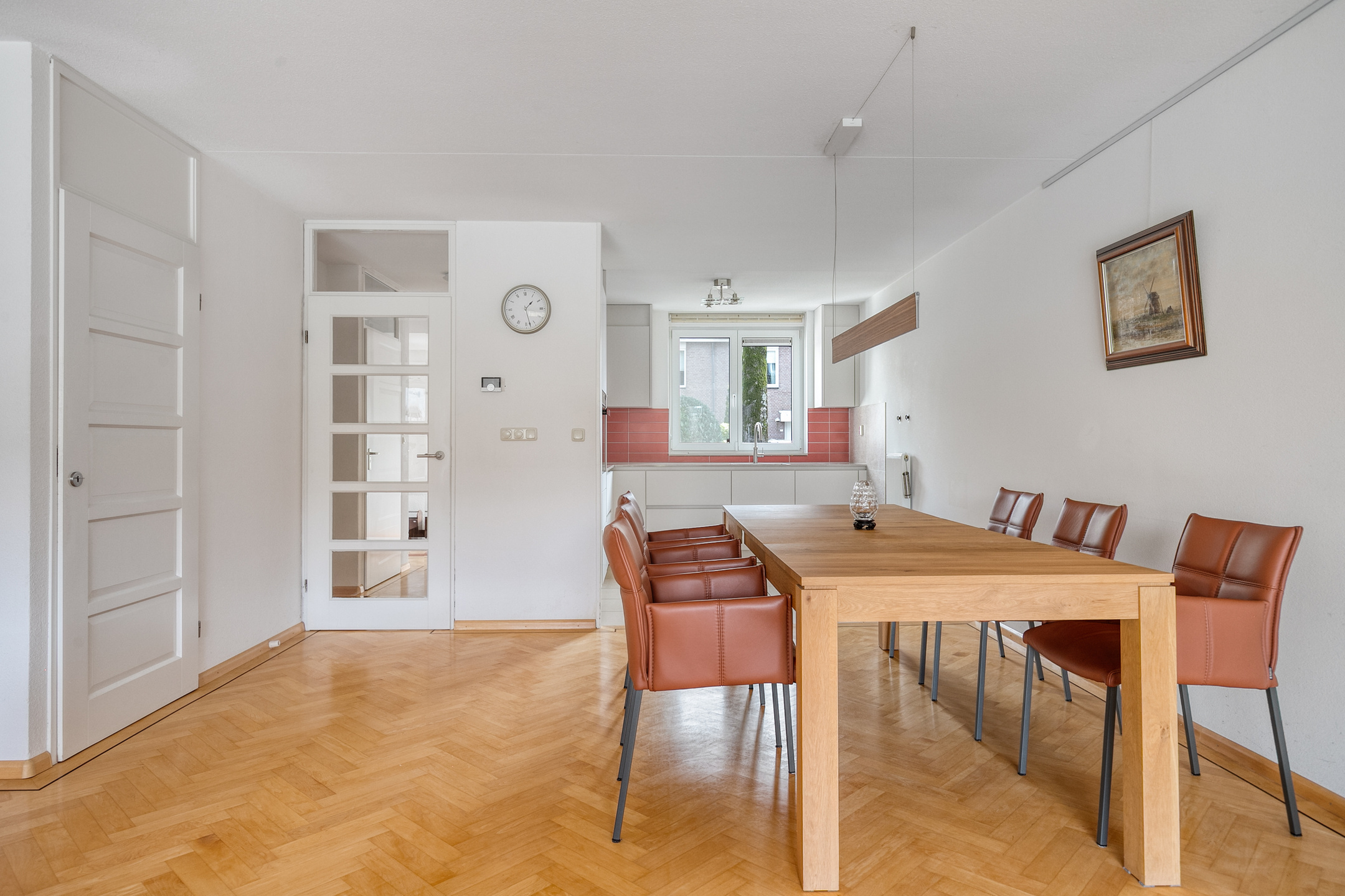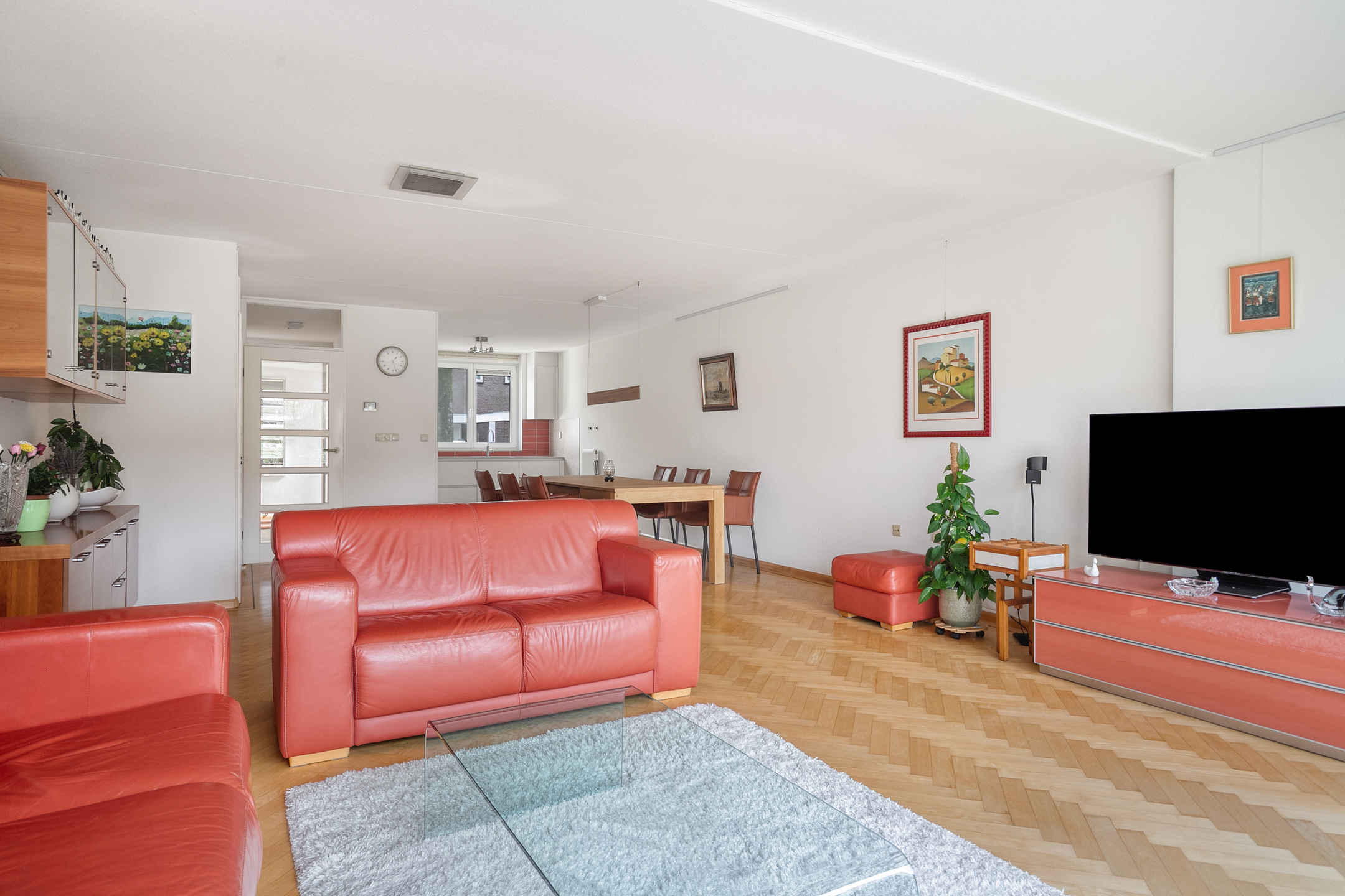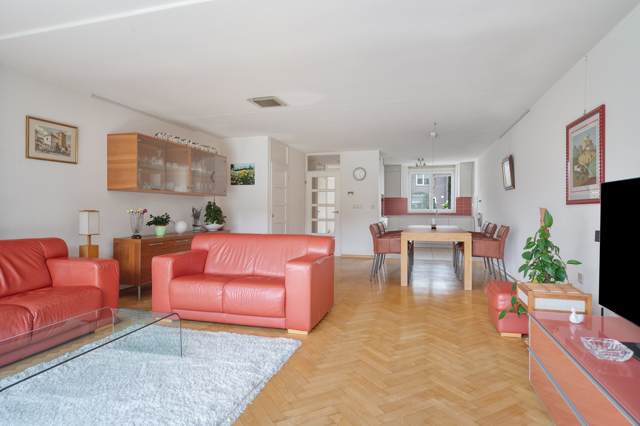 De woonkamer vormt het hart van de begane grond en kenmerkt zich door de open indeling en de prettige lichtinval. Grote raampartijen en de schuifdeur naar de tuin zorgen voor een ruimtelijk gevoel en een mooie verbinding met buiten. De parketvloer geeft het geheel een warme uitstraling. Hier heeft u alle ruimte voor een comfortabele zithoek en een gezellige eethoek.