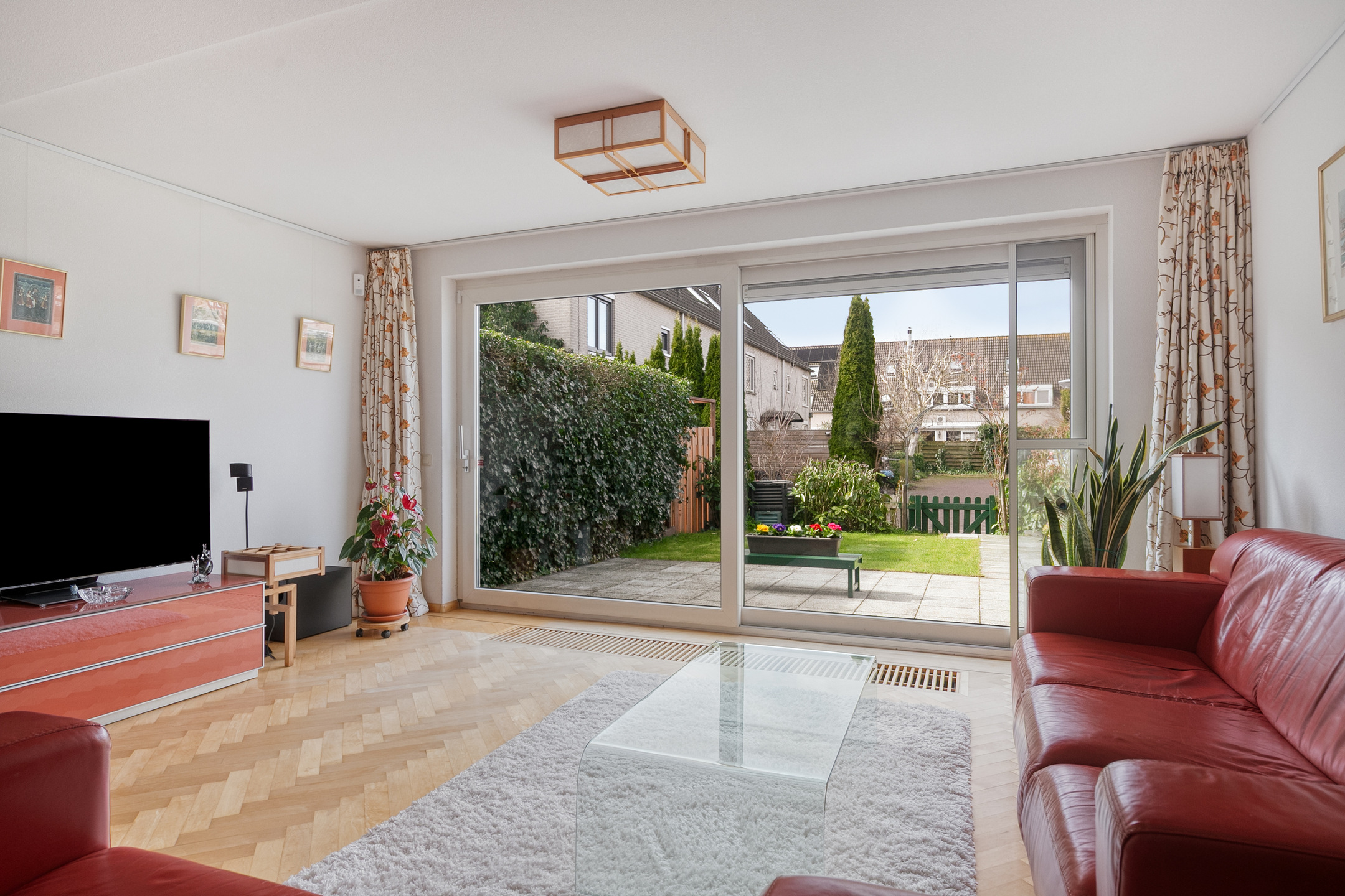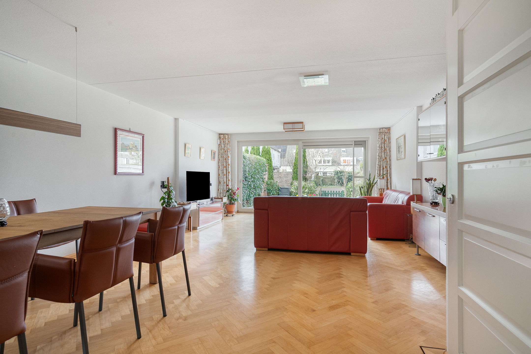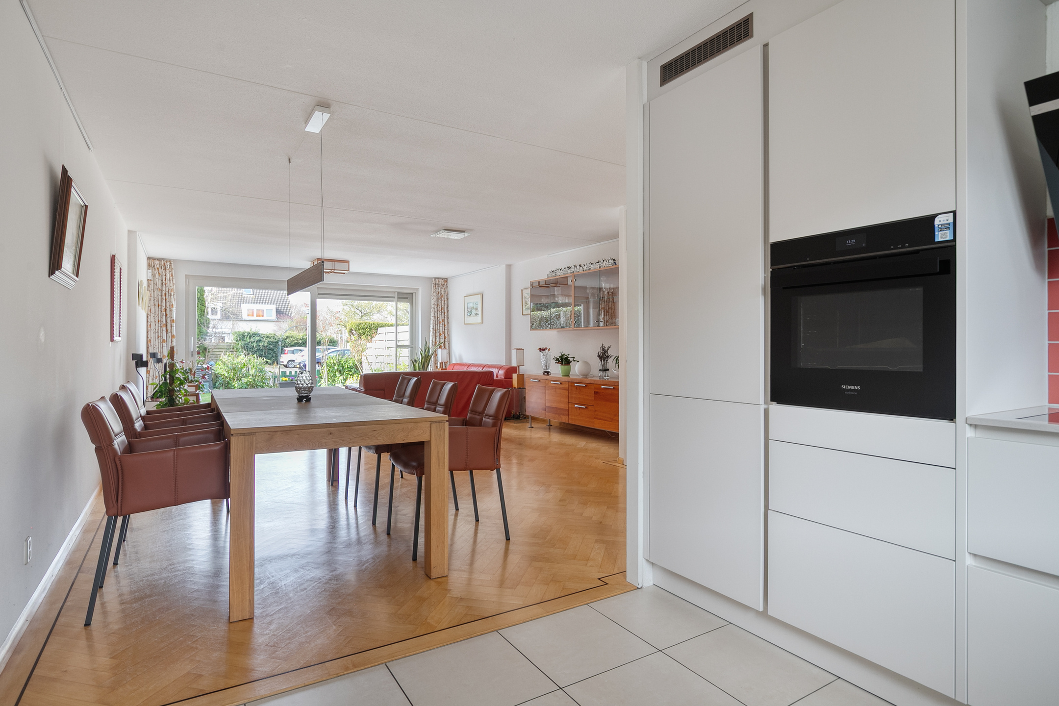 De woonkamer vormt het hart van de begane grond en kenmerkt zich door de open indeling en de prettige lichtinval. Grote raampartijen en de schuifdeur naar de tuin zorgen voor een ruimtelijk gevoel en een mooie verbinding met buiten. De parketvloer geeft het geheel een warme uitstraling. Hier heeft u alle ruimte voor een comfortabele zithoek en een gezellige eethoek.