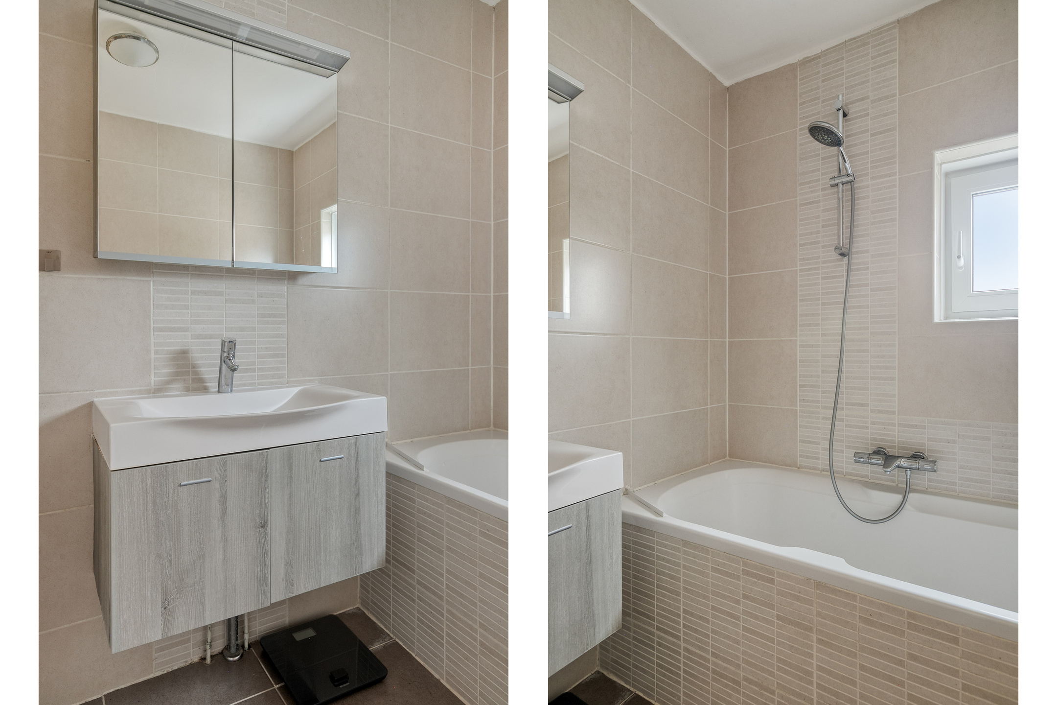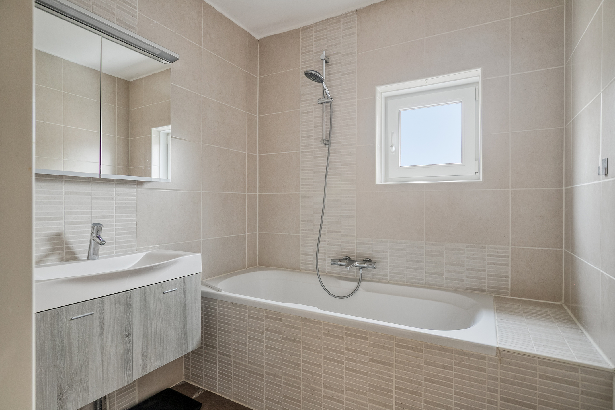 De badkamer grenst aan de overloop en is volledig betegeld en goed onderhouden. U beschikt hier over een comfortabel ligbad met douche, een wastafel met spiegel en een praktisch opbergmeubel. Daarnaast is er een separate toiletruimte aanwezig, wat extra comfort biedt in het dagelijks gebruik.