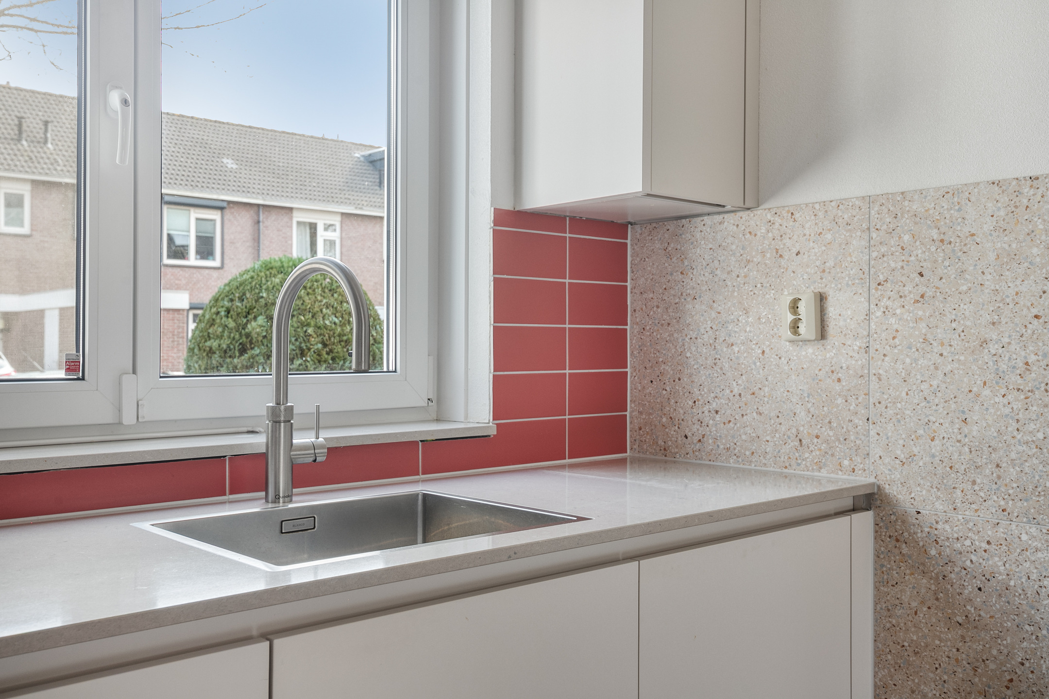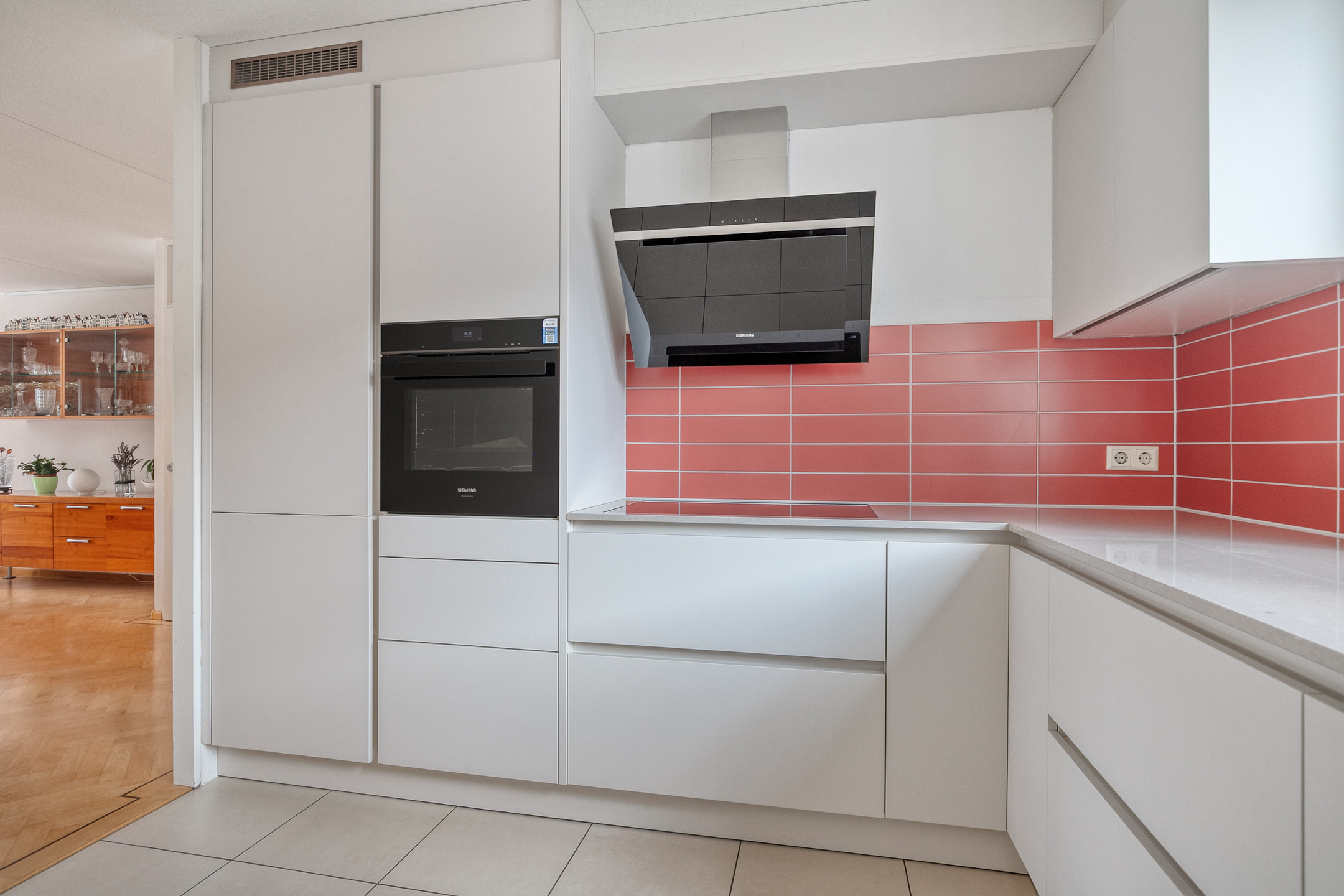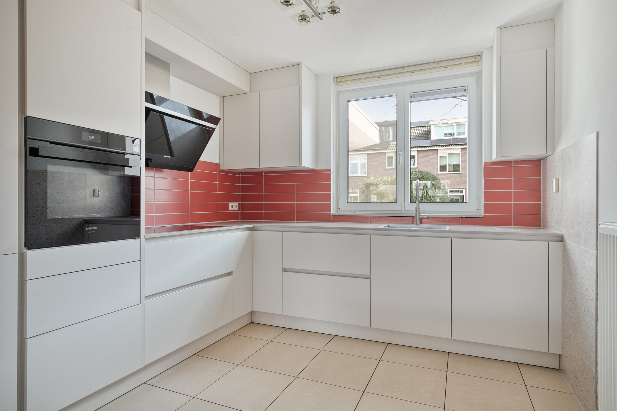 Aan de voorzijde van de woning bevindt zich de moderne open keuken (2023), uitgevoerd met een L-vormig aanrechtblad. De keuken is voorzien van diverse inbouwapparatuur, waaronder een inductiekookplaat met afzuigkap, een vaatwasser, spoelbak met quooker, stoom ovencombinatie en koelkast/vriezer en meer dan genoeg opbergruimte.