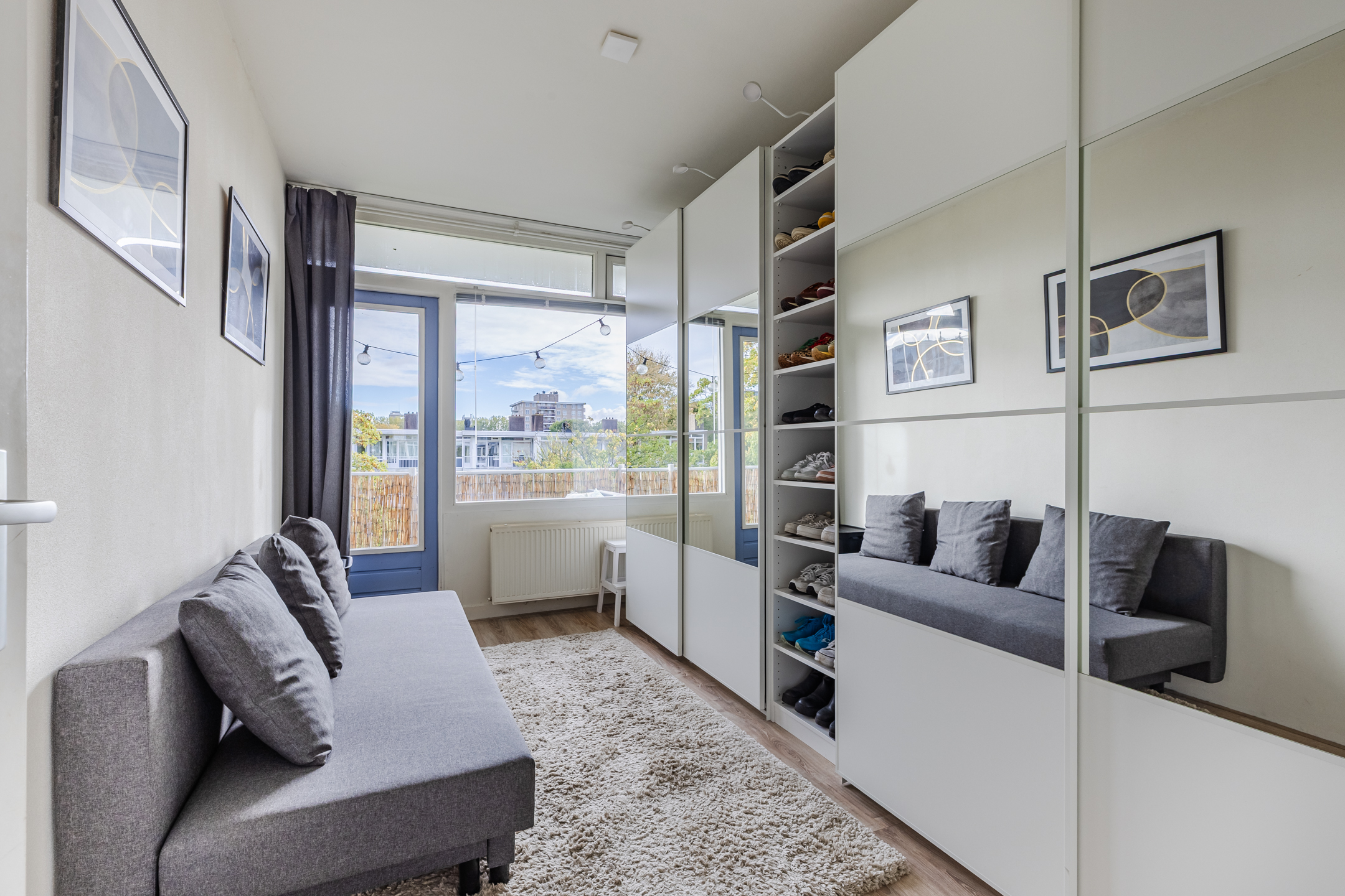 In the green neighborhood of Buitenveldert, in the popular Amsterdam South and near e.g. the Amstelpark and the Amsterdam forest, you will live here at a super central location near the Zuidas. From the Amsterdam South railway station, you can travel to any part of the city within no time (e.g. only 6 minutes to Schiphol Airport and 11 minutes to Amsterdam Central Station). For your daily shopping, you can go to the extensive shopping center at the Gelderlandplein, which is located within walking distance of the apartment. The roads are also easily accessible given the location at a very short distance from the ramp for the A10 ring road and A2.