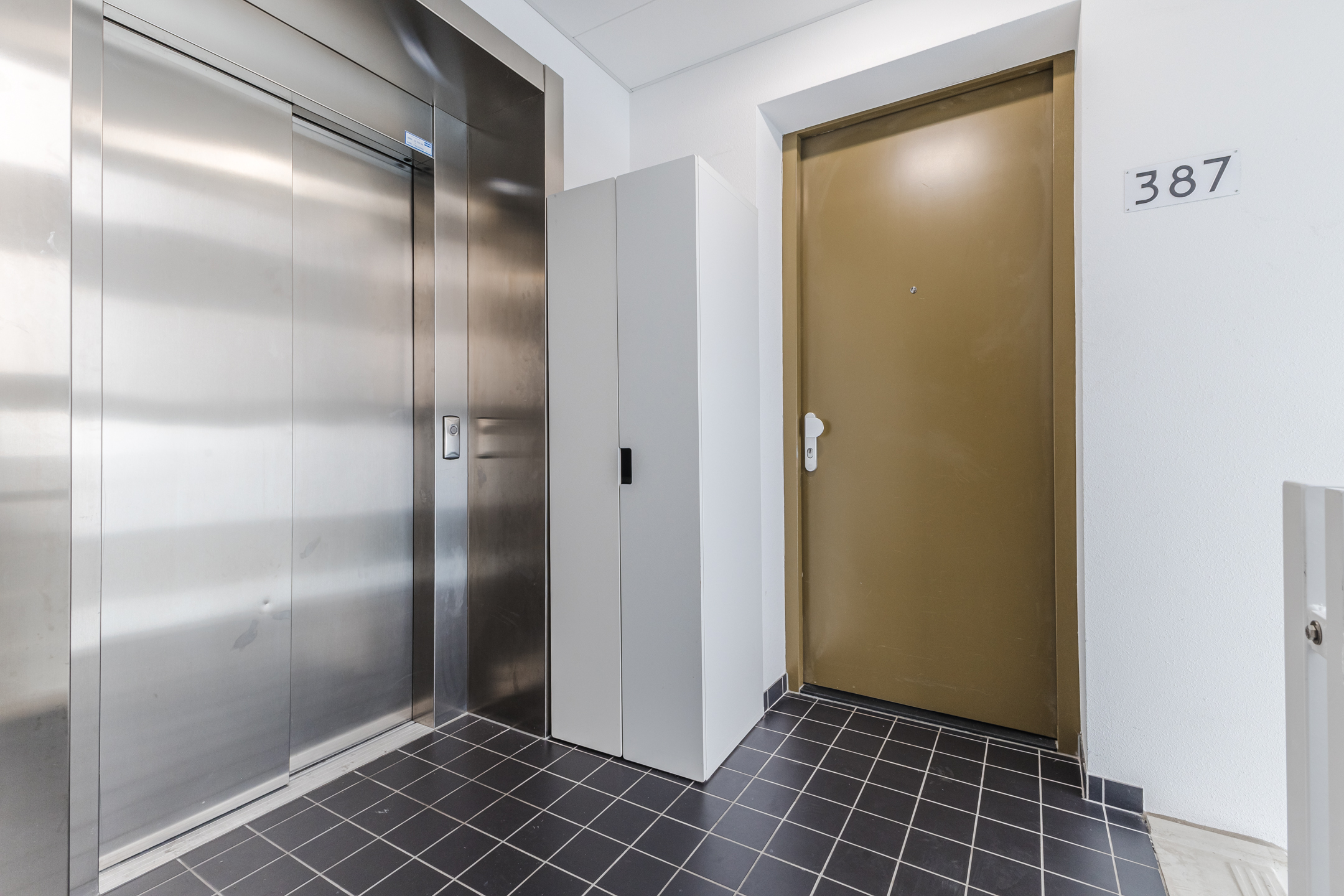 Closed entrance with bell/intercom, staircase and lift.