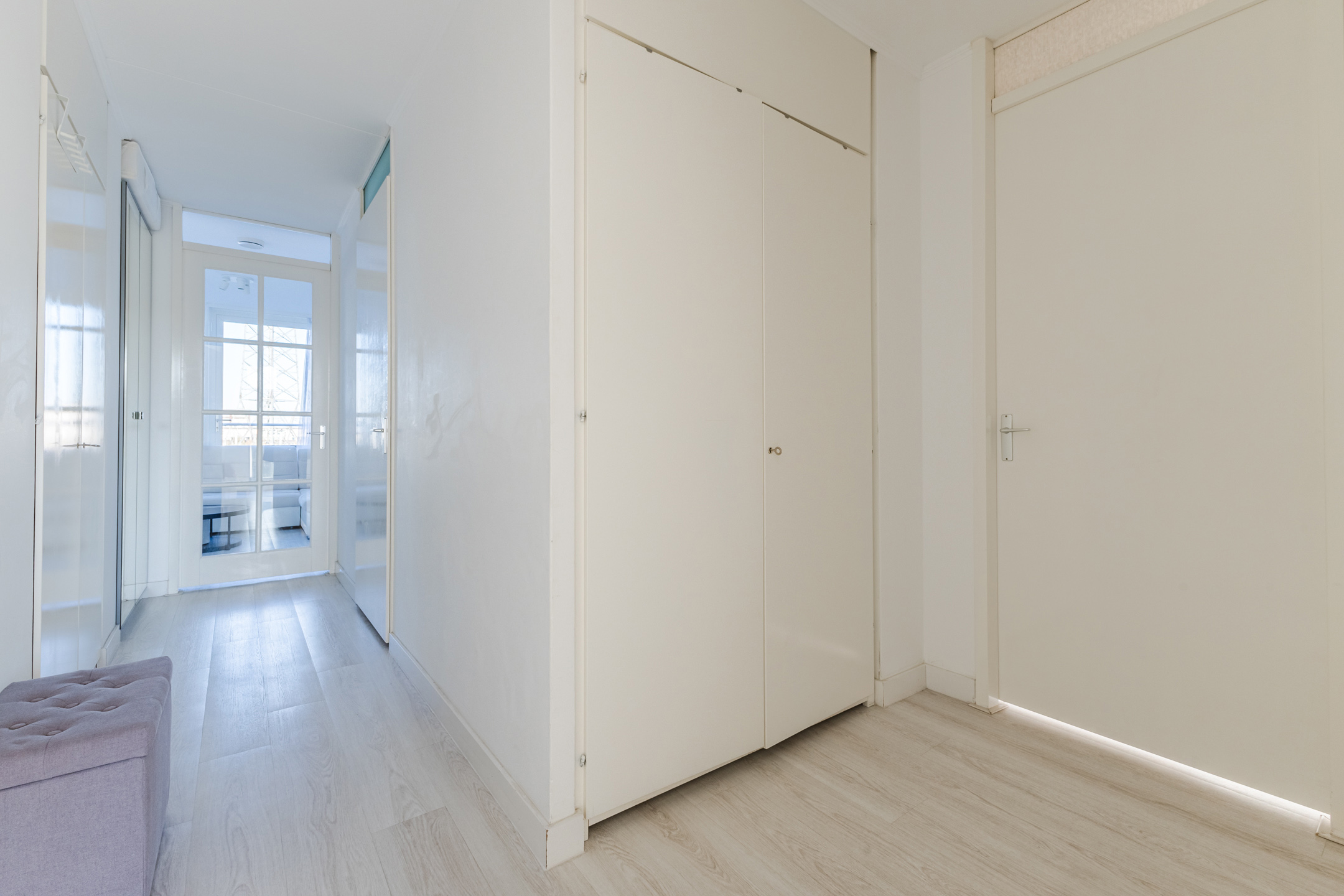 Achter de voordeur vinden we de entreehal die toegang biedt tot alle ruimtes van de woning. In de entreehal zijn meerdere handige inbouwwandkasten aanwezig ā waarvan in een ook de aansluitingen voor de witgoedopstelling zijn verwerkt.