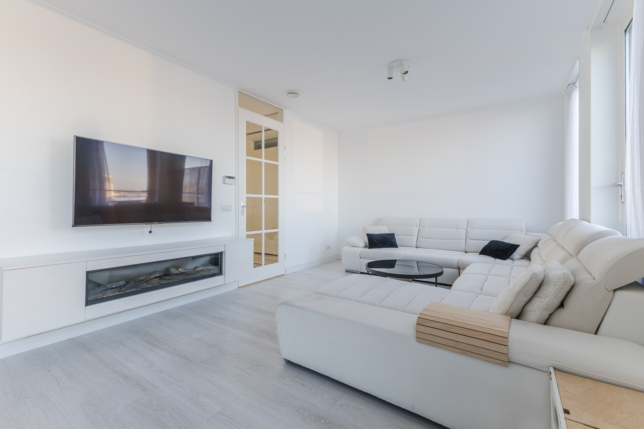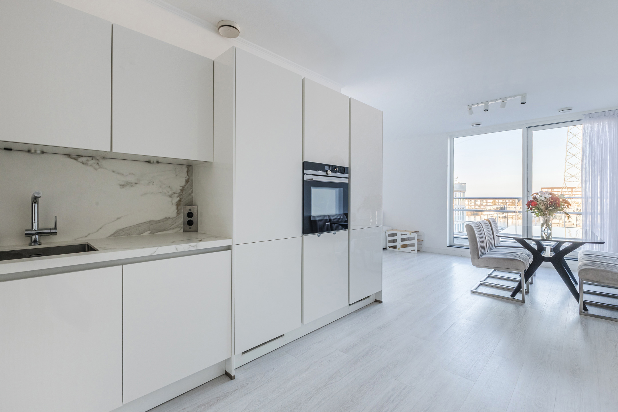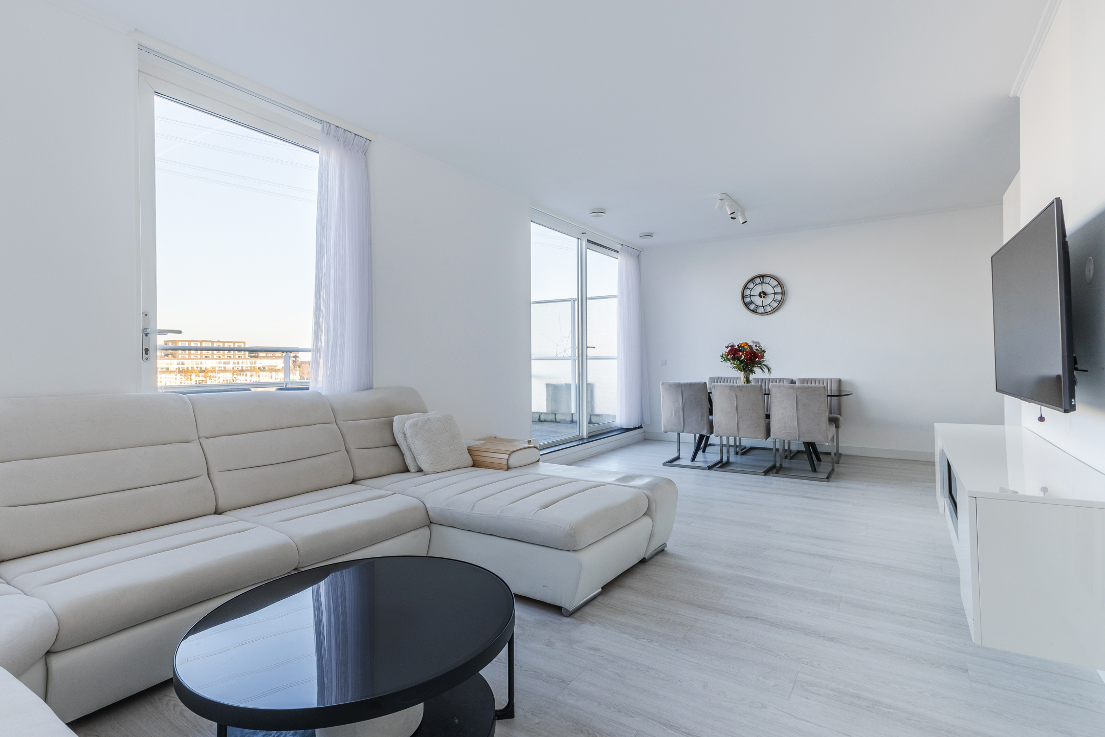 The spacious living room with an open kitchen enjoys plenty of natural light and offers access in two places to the wide balcony terrace with unobstructed views over the water.