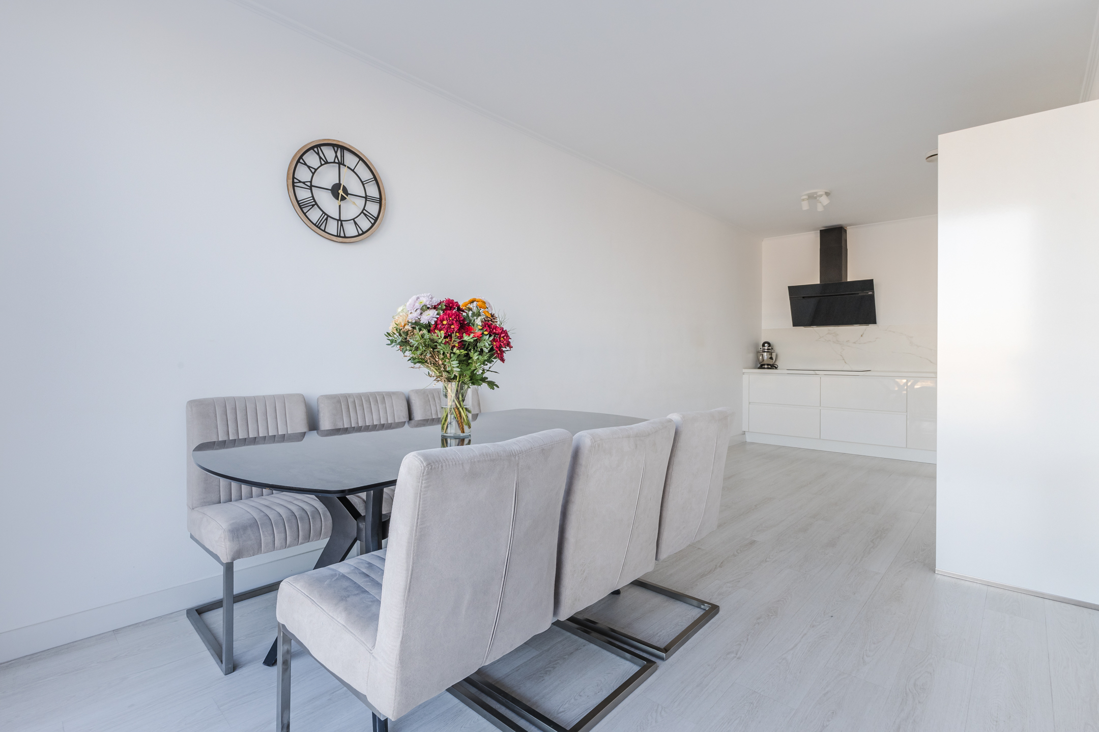 De woning is strak afgewerkt en voorzien van een PVC-laminaatvloer met vloerverwarming.