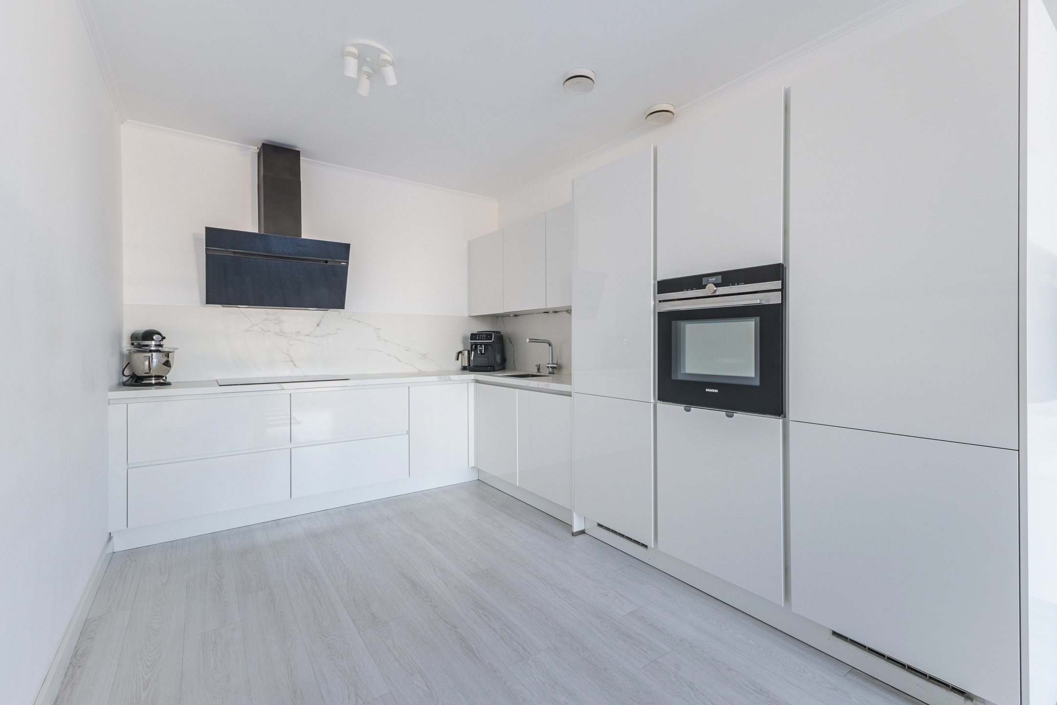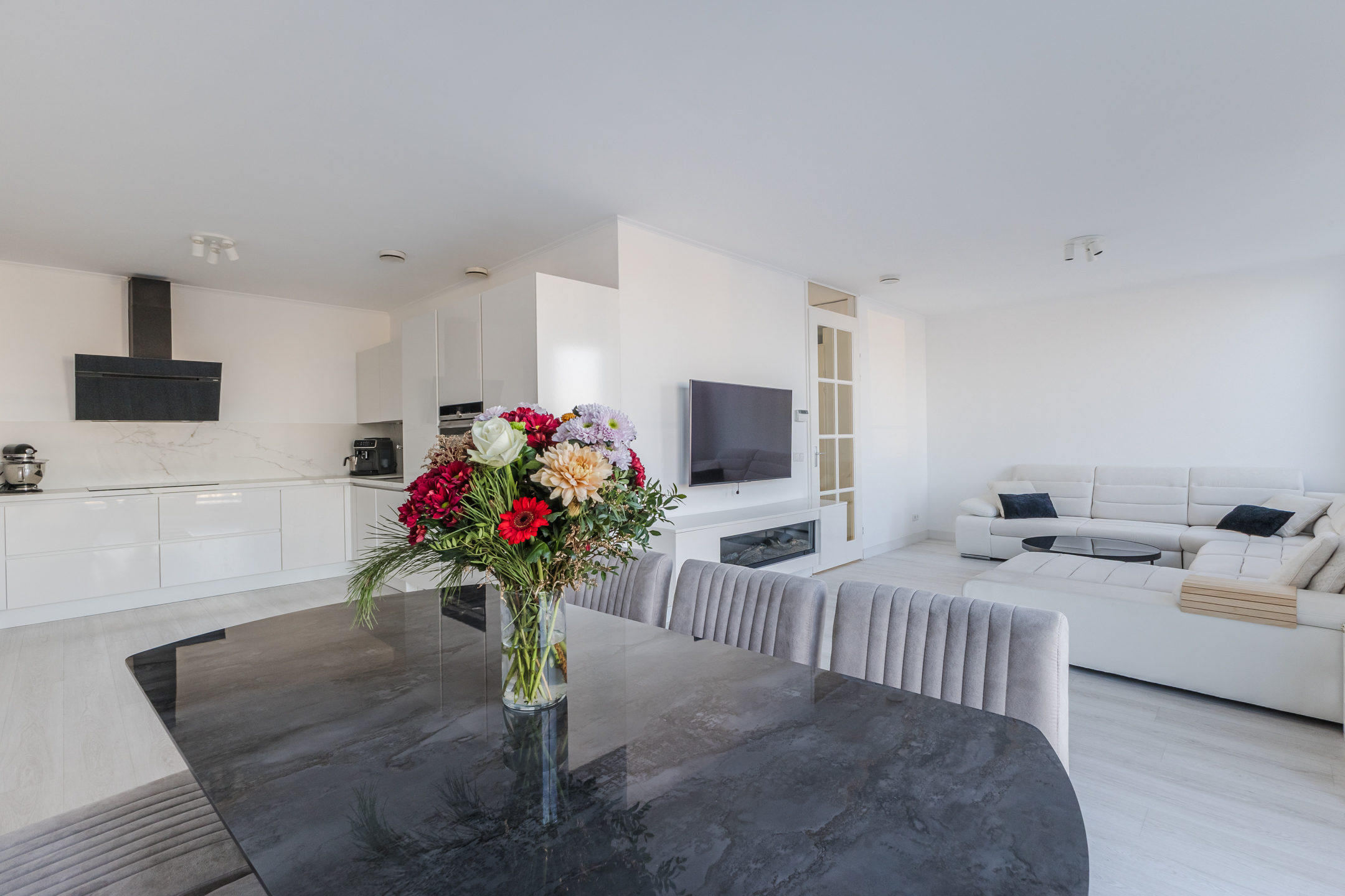 De luxe open keuken is voorzien van een inductiekookplaat, oven, magnetron, koelkast, vriezer en een vaatwasser.