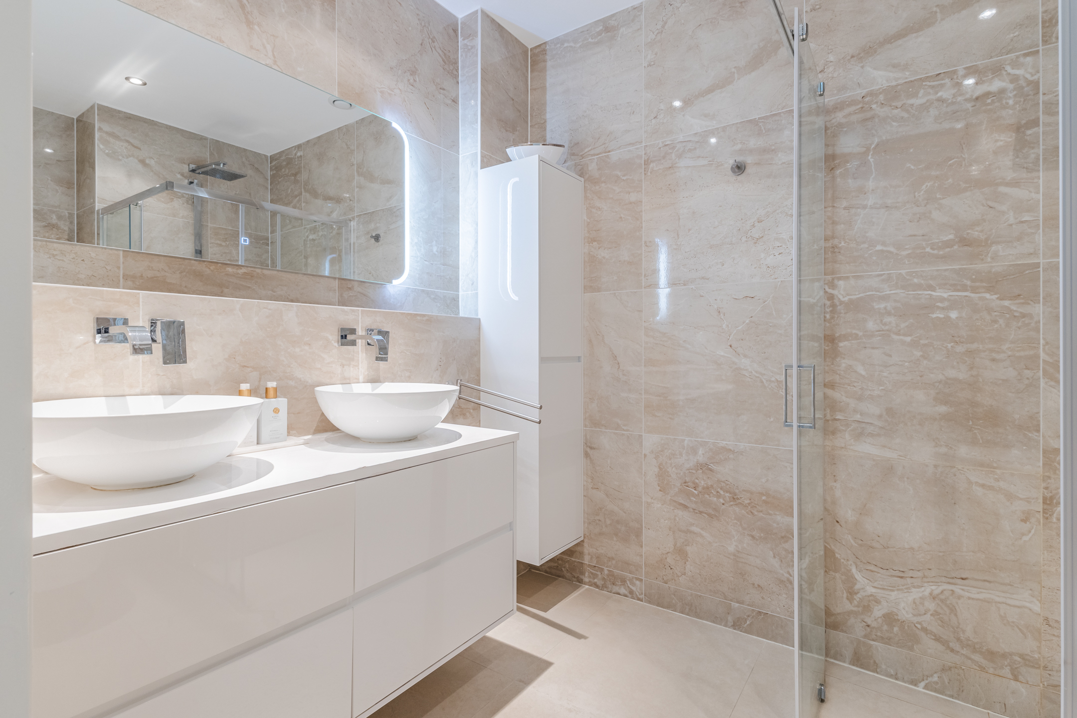 The luxurious bathroom features recessed spotlights, a wall-mounted toilet, double washbasin with vanity unit and a walk-in rain shower.