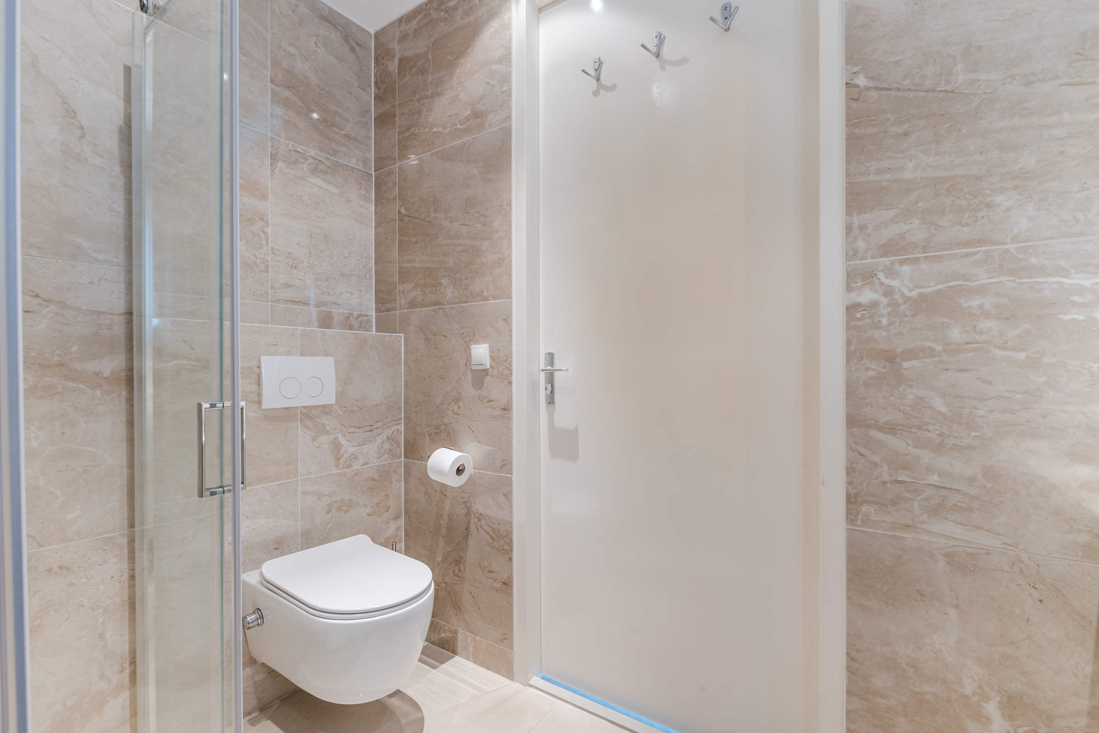 De luxe badkamer is voorzien van inbouwspots, zwevend toilet, dubbele wastafel met meubel en een inloopregendouche.