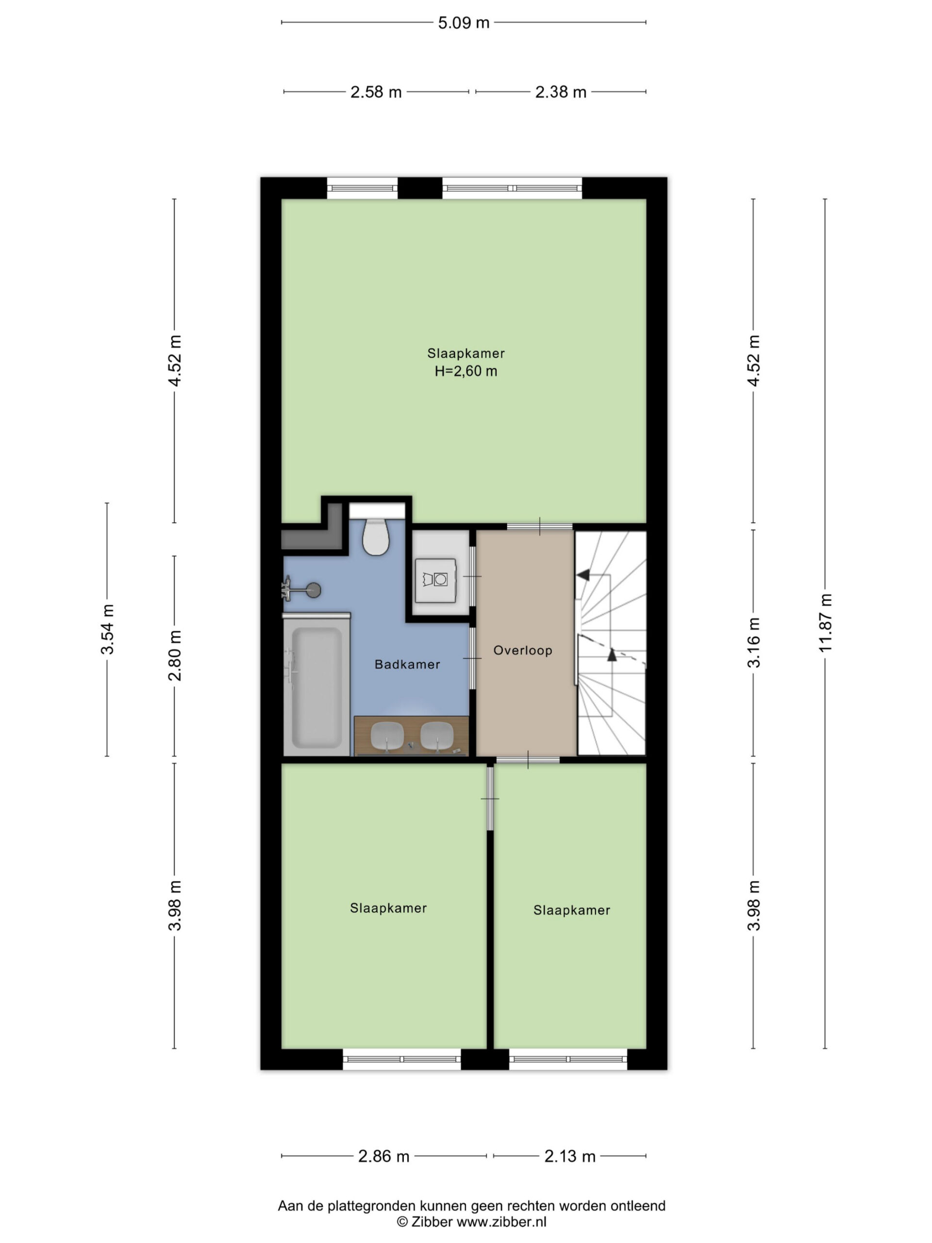 De overloop geeft toegang tot drie slaapkamers en de badkamer. Aan de achterzijde ligt de ruime hoofdslaapkamer, met voldoende plaats voor een groot bed en kastenwand. Aan de voorzijde bevinden zich twee slaapkamers die flexibel in te delen zijn.