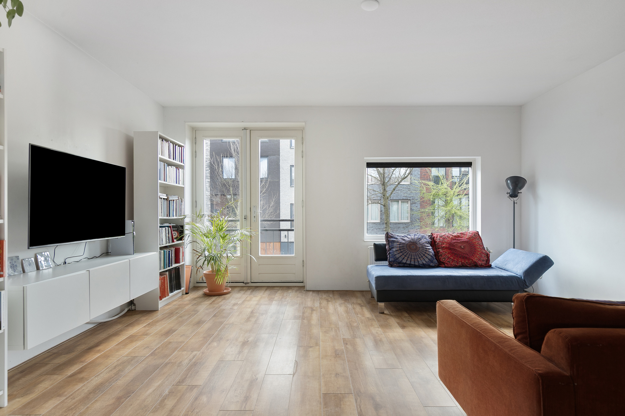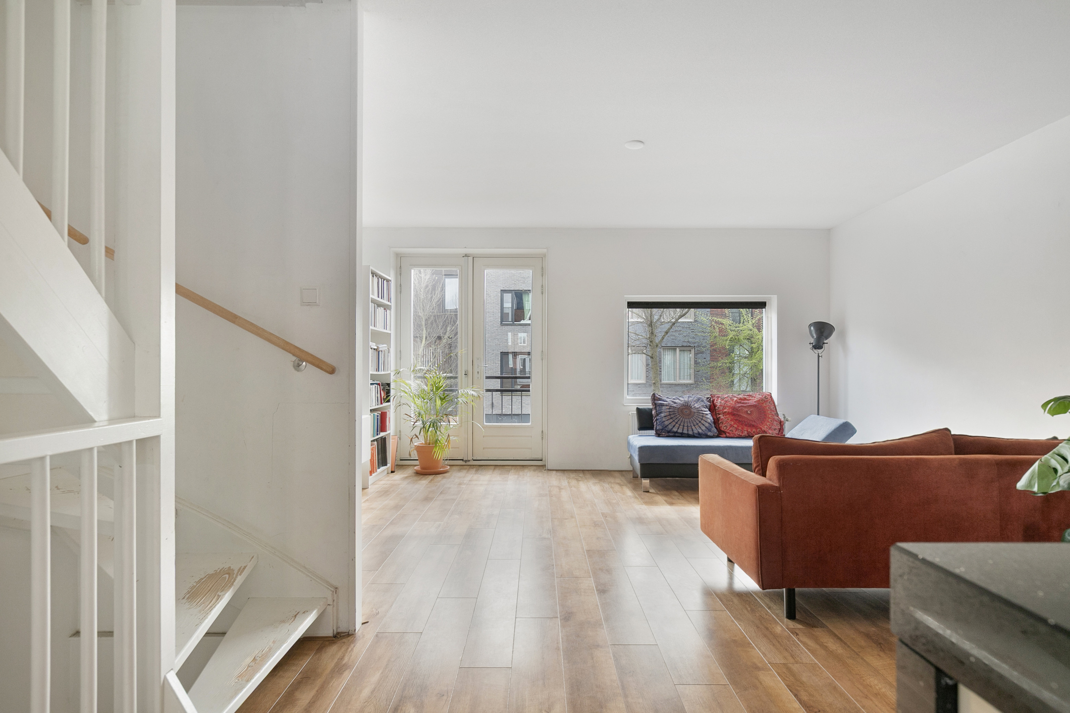 Via openslaande deuren is het terras op deze verdieping bereikbaar, waardoor je de woonkamer eenvoudig met buiten verbindt.