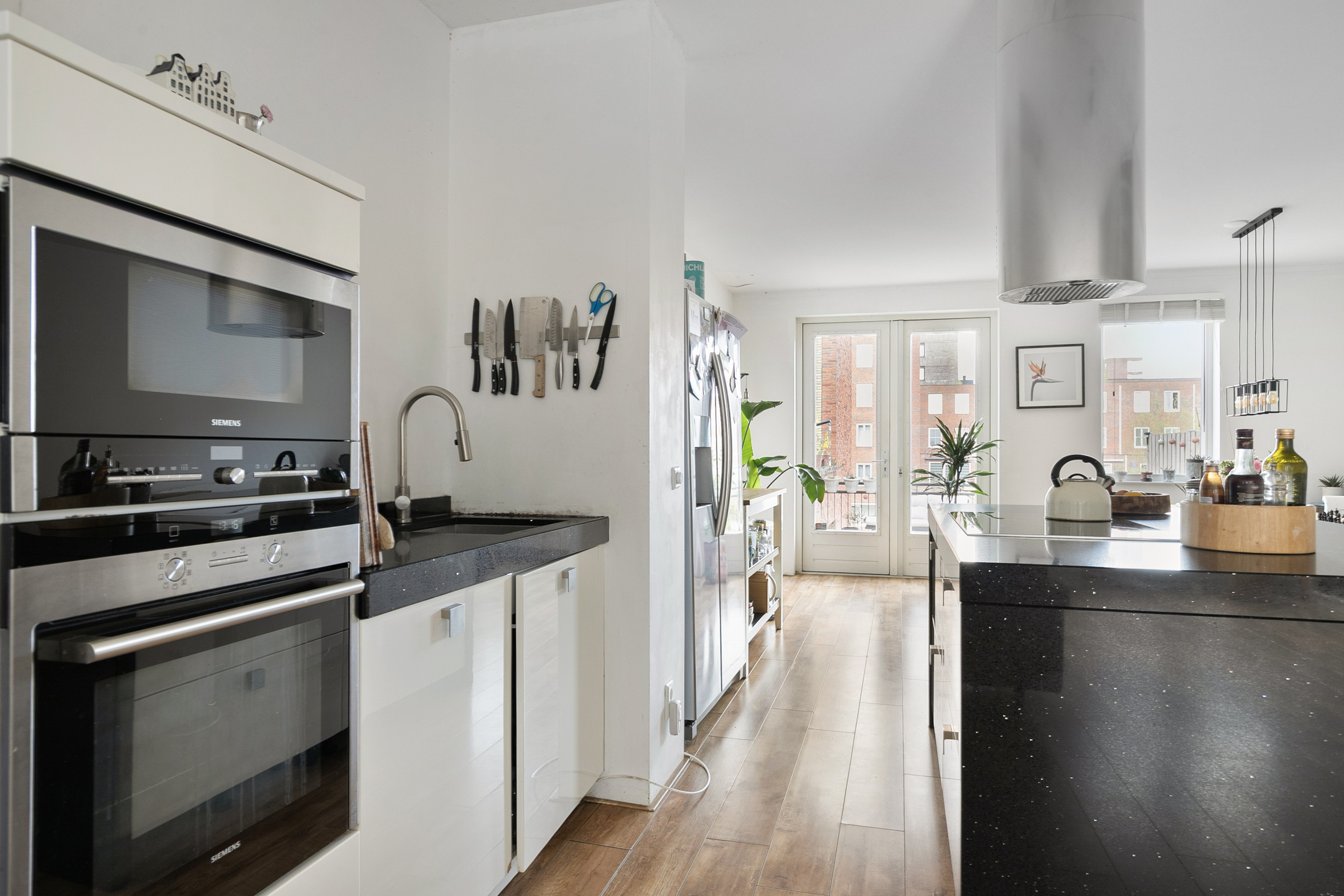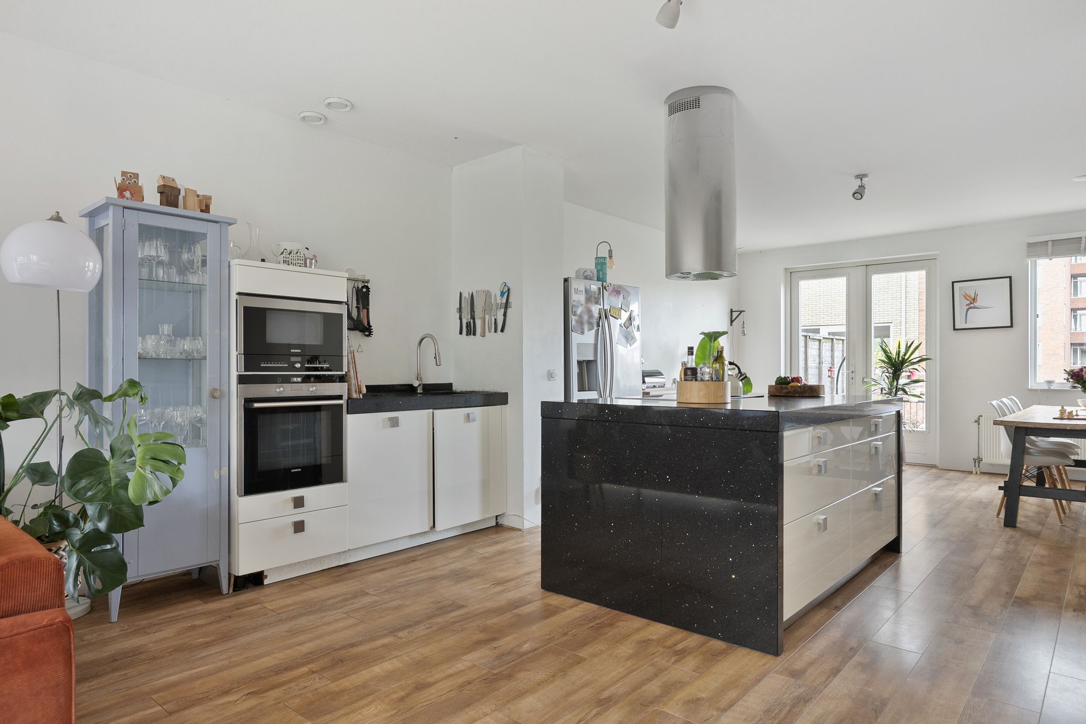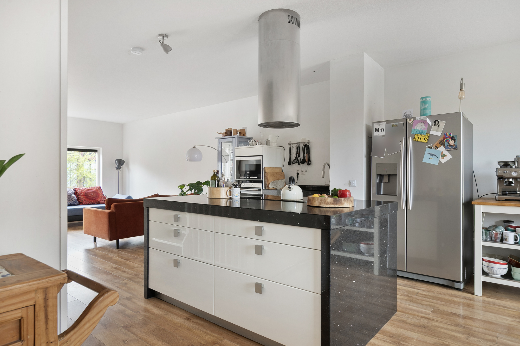Centraal in de ruimte staat het kookeiland, dat direct de aandacht trekt en zorgt voor een natuurlijke indeling zonder de openheid te verliezen. De keuken is uitgevoerd met diverse inbouwapparatuur (inductiekookplaat, afzuigkap, oven, combi-oven en vaatwasser) en biedt volop werk- en bergruimte.