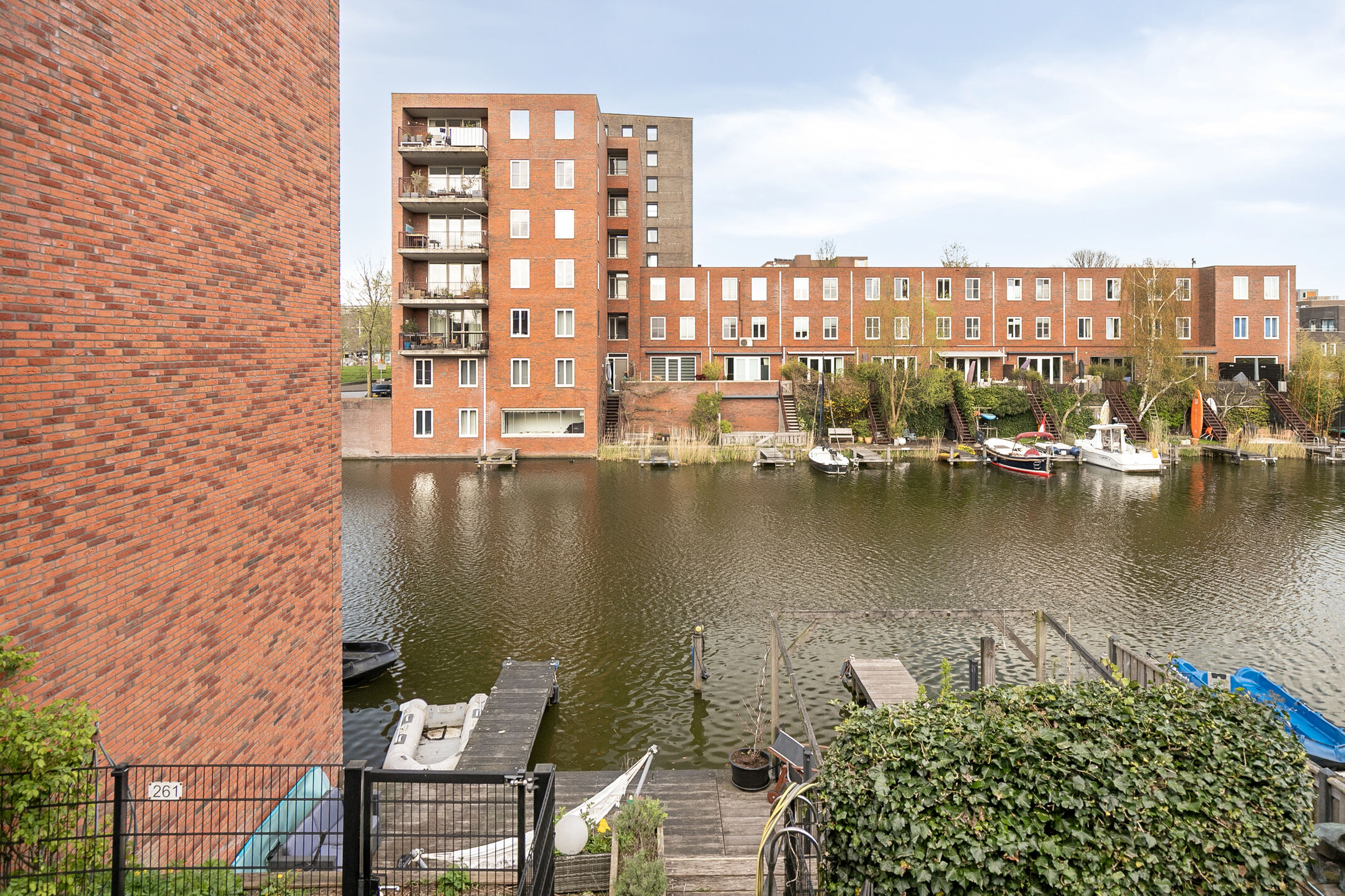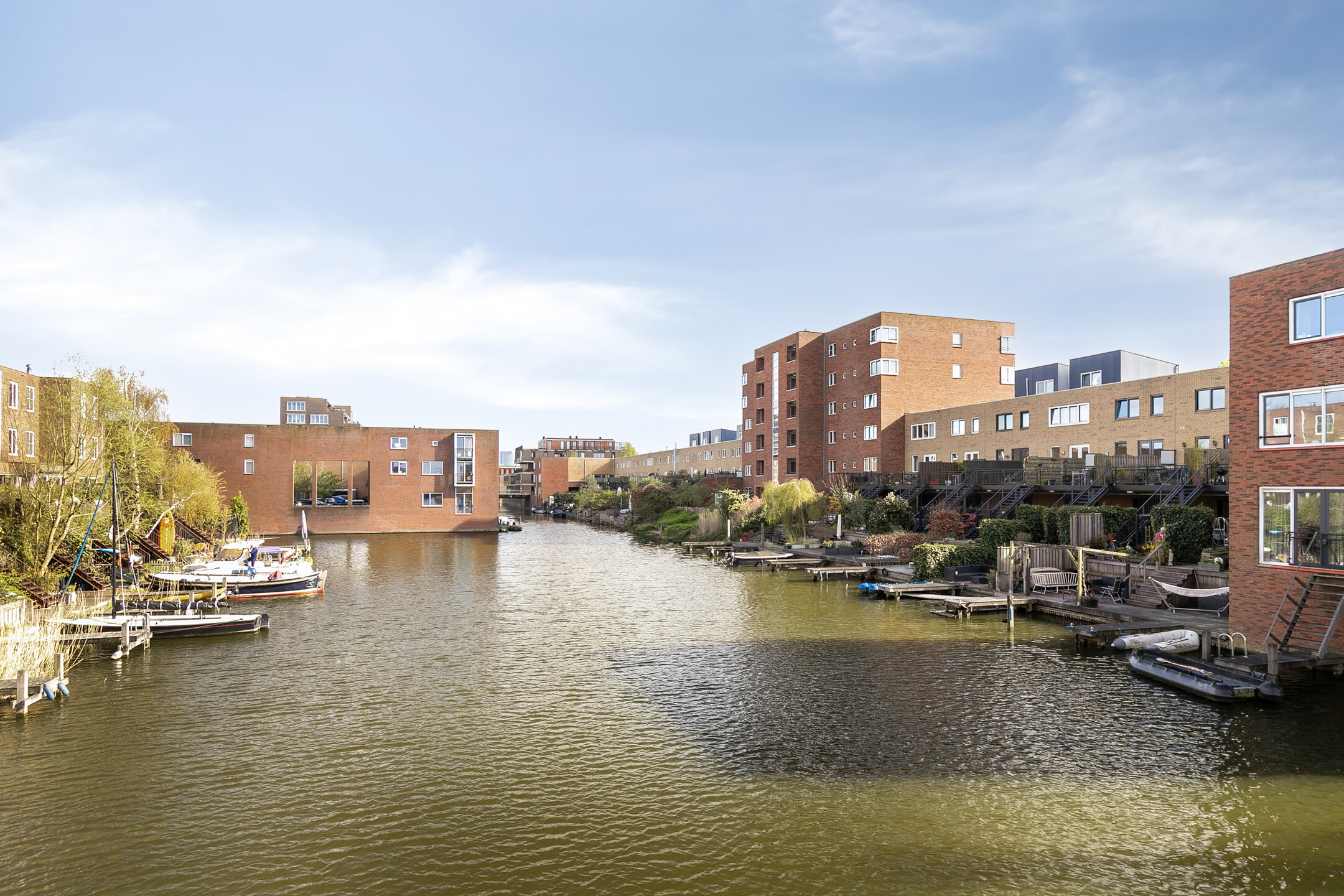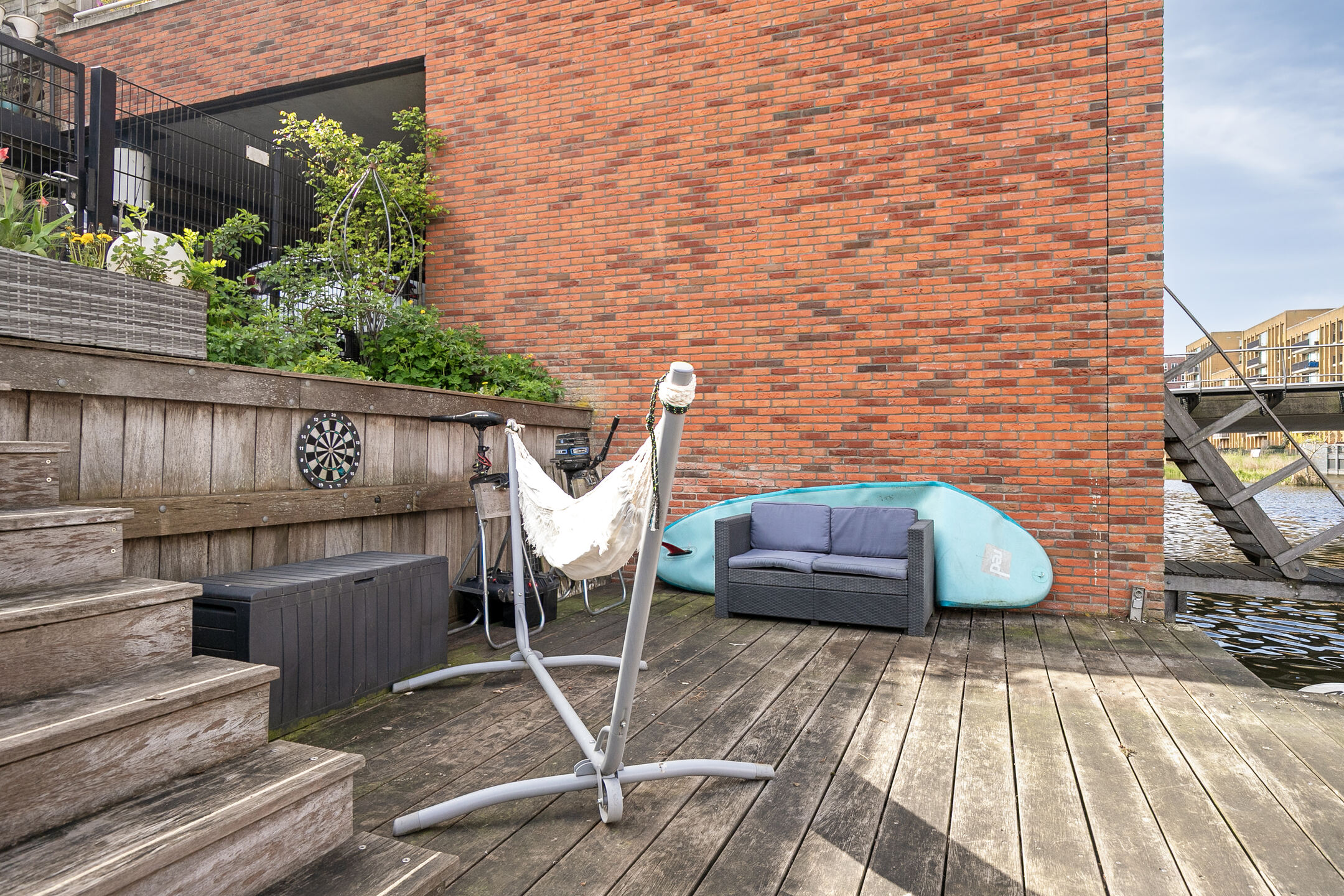 De woning beschikt over meerdere buitenruimtes. Op de eerste verdieping ligt een terras grenzend aan de leefruimte. Een trap omlaag brengt een ruim vlonderterras direct aan het water, waar in alle rust buiten gezeten kan worden. Daarnaast is er nog een ruim dakterras aanwezig op de derde verdieping.