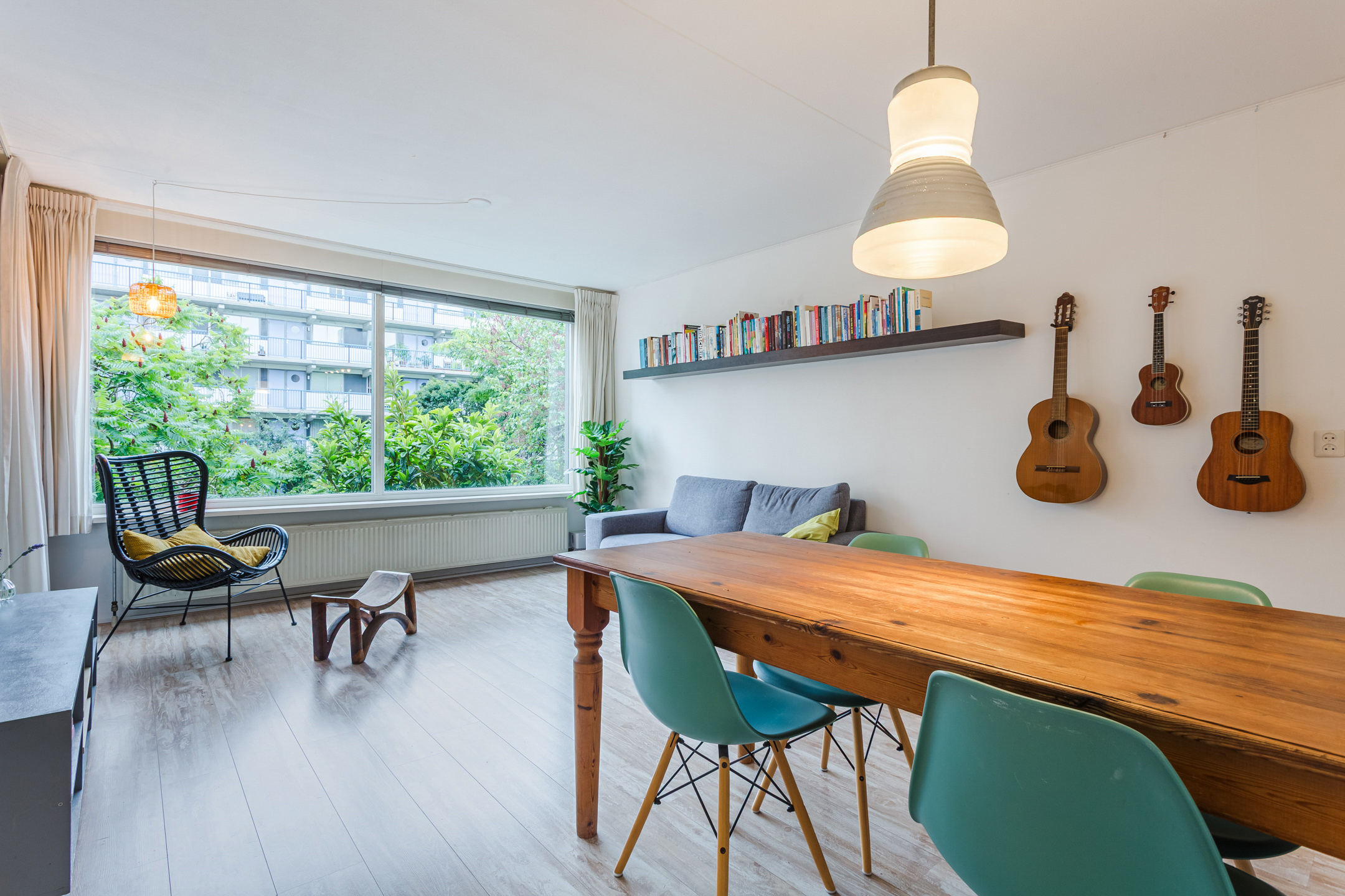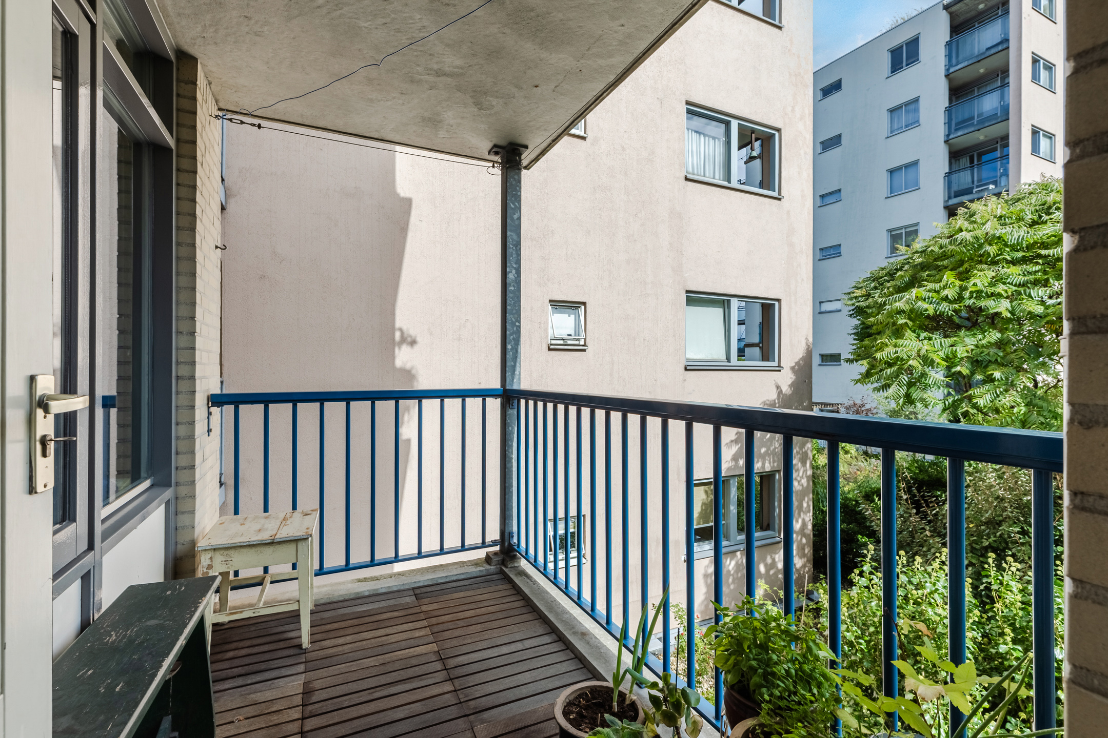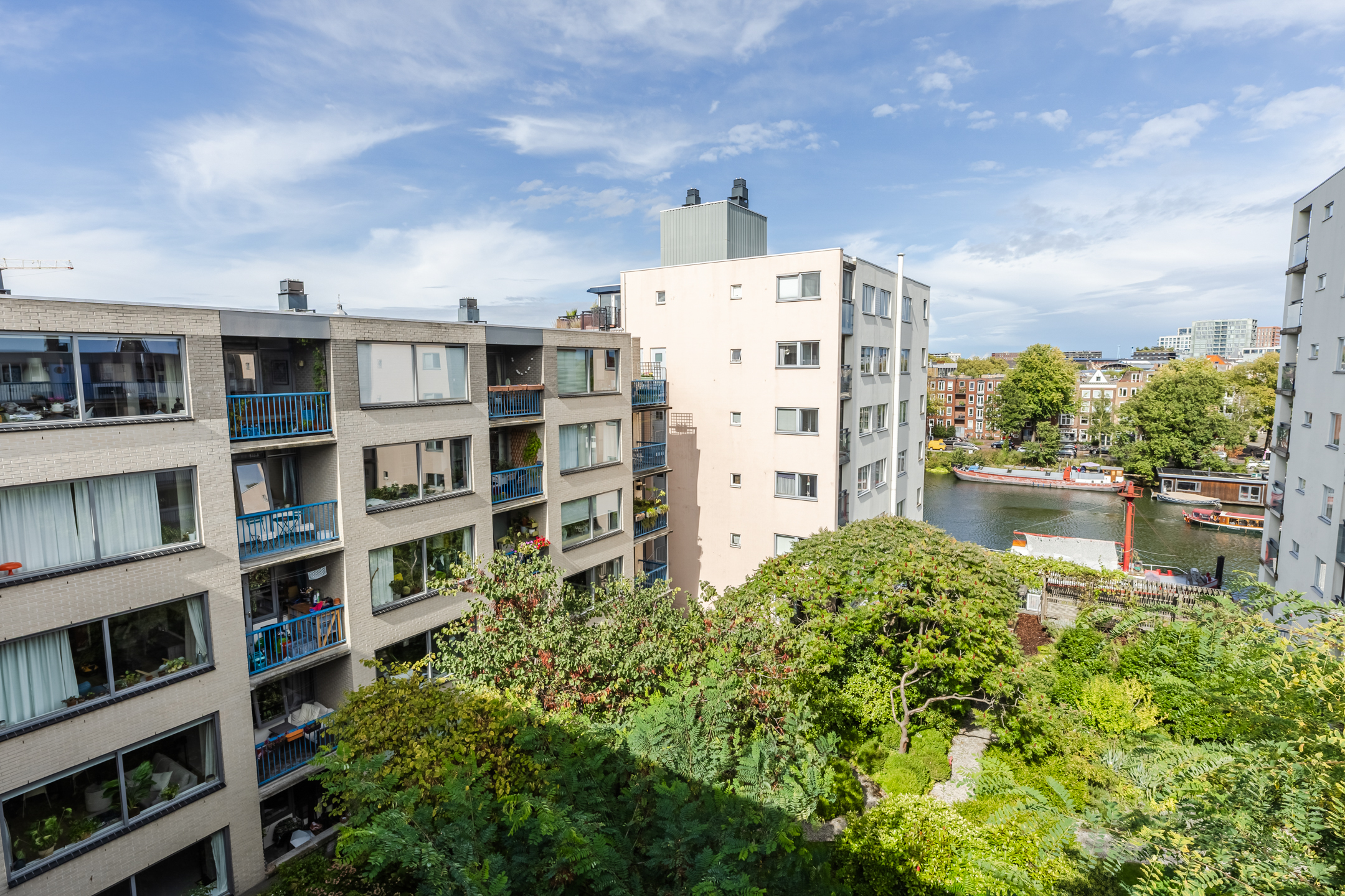 The living room provides access to the sheltered balcony with a view of the green courtyard garden and a glimpse of the Nieuwe Vaart canal.