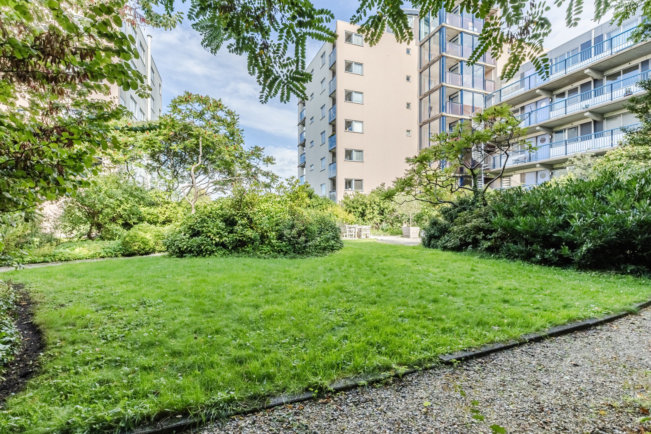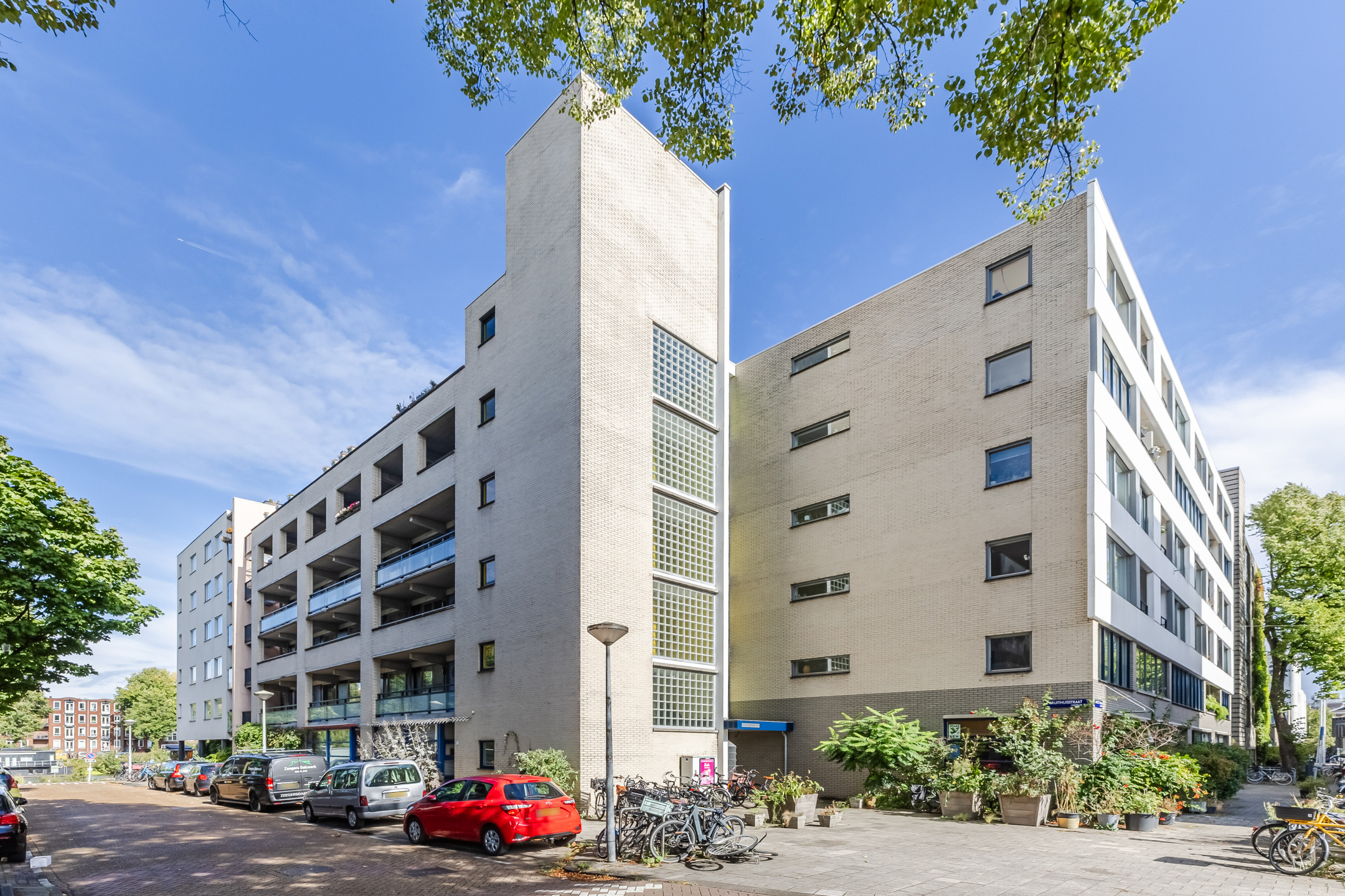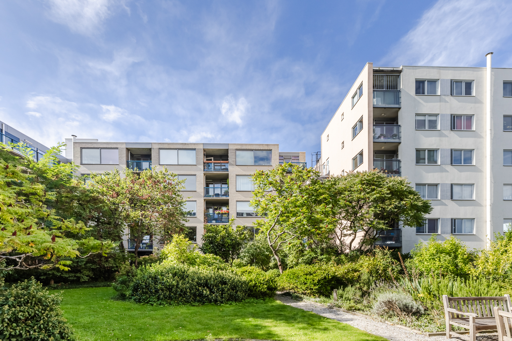 The living room provides access to the sheltered balcony with a view of the green courtyard garden and a glimpse of the Nieuwe Vaart canal.