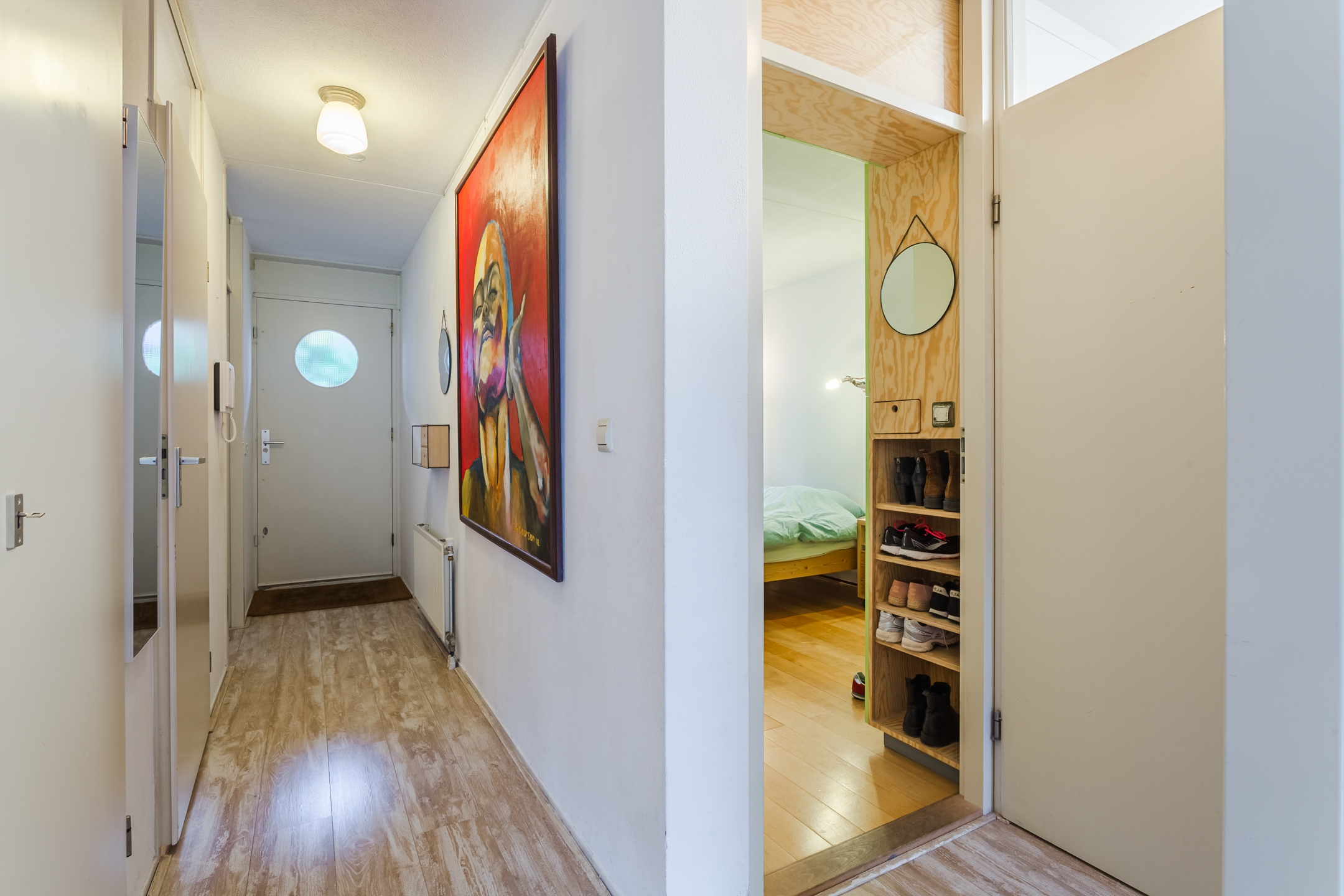 Behind the front door, we find the elongated entrance hall that provides access to all areas of the apartment.