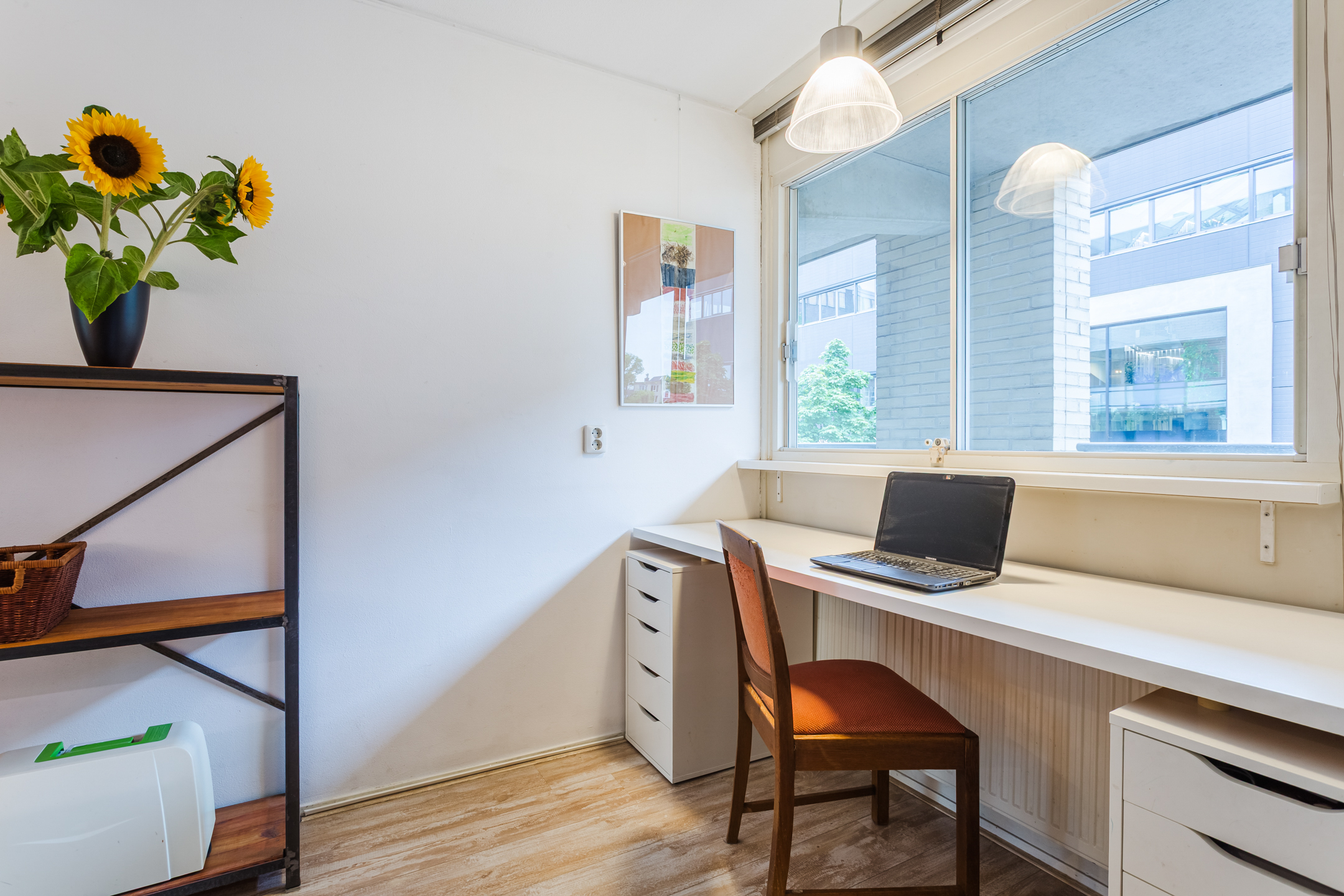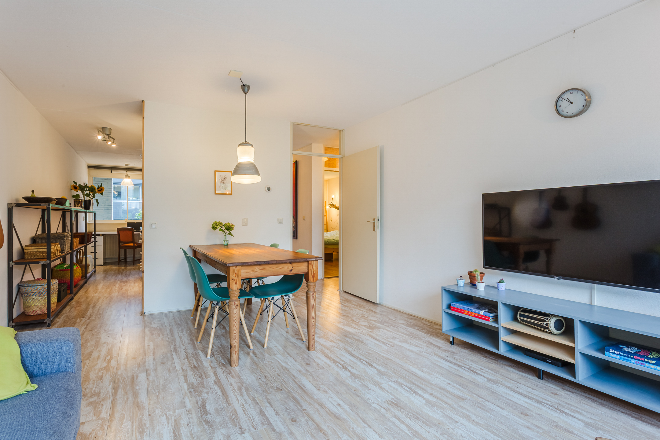 The cosy living room with an open kitchen extends across the entire length of the property and enjoys plenty of natural light thanks to the large windows on both sides. Because the kitchen is located in the middle of the room, a convenient layout has been created with separate living and dining areas. With a simple renovation, you could also create a separate bedroom/office here.