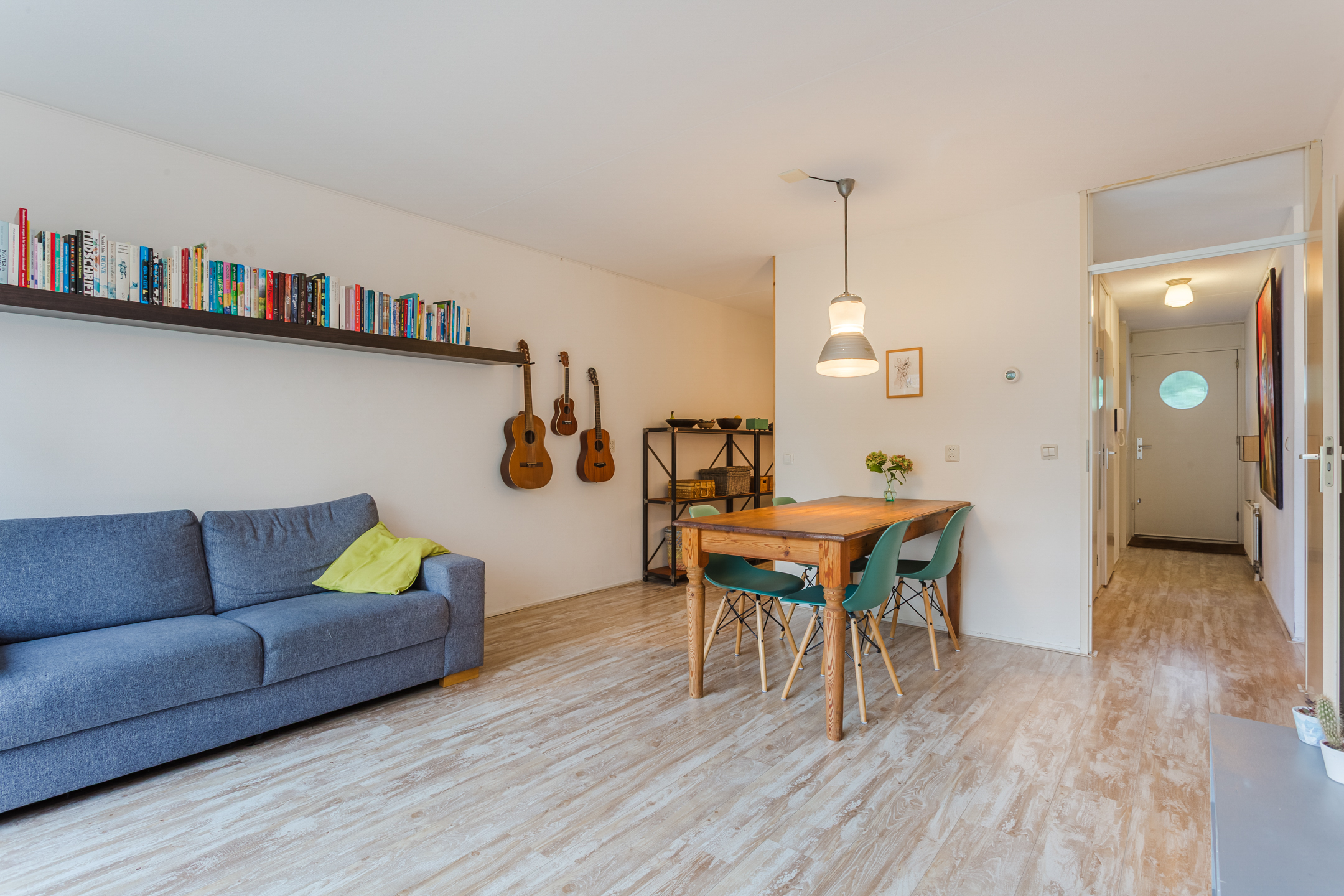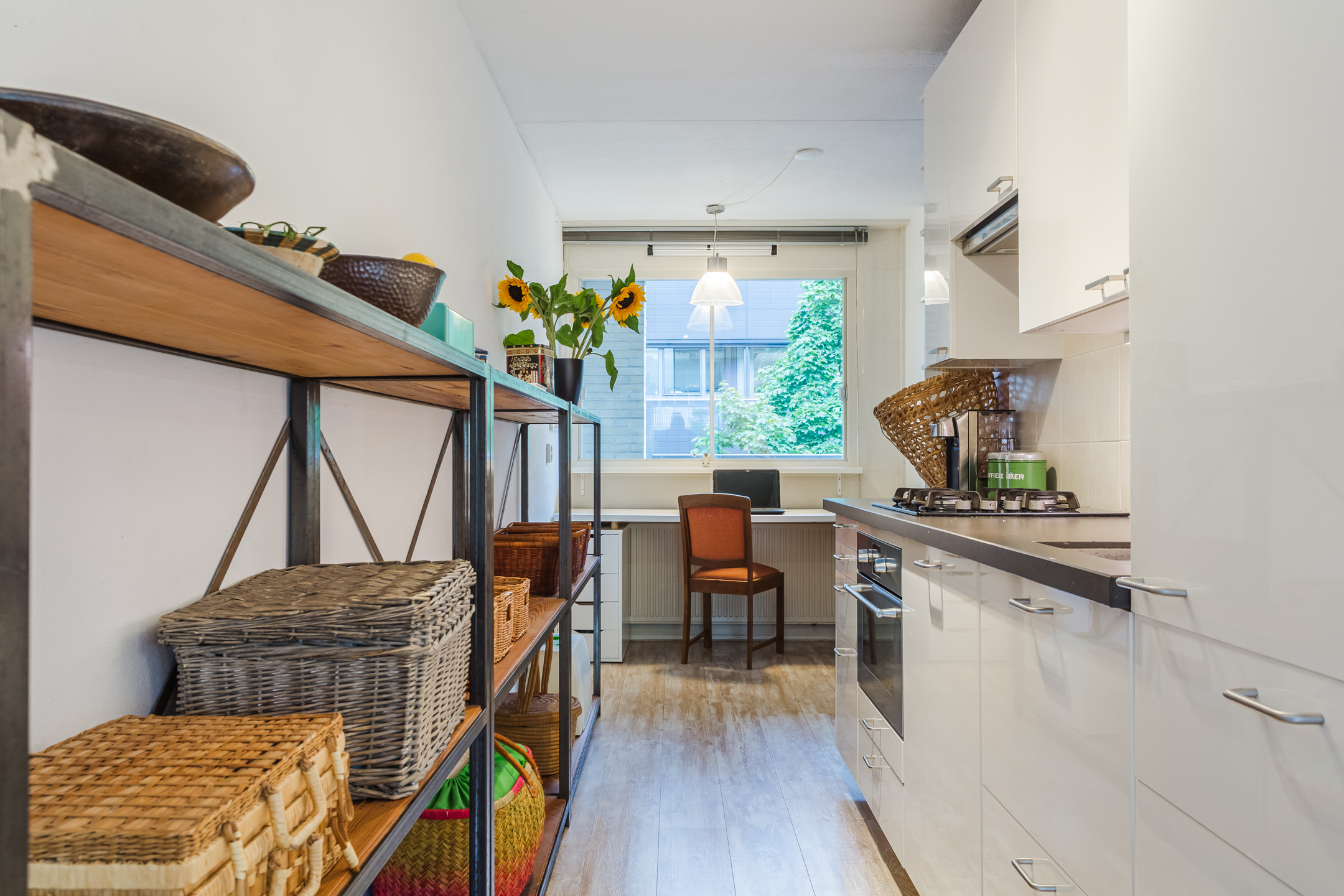 De sfeervolle doorzonwoonkamer met open keuken strekt zich uit over de volledige lengte van de woning en geniet door de grote raampartijen aan beide zijden van lekker veel lichtinval. Omdat de keuken in het midden van de ruimte is geplaatst, is er een handige indeling ontstaan met een aparte woon- en eetkamergedeelte. Met een simpele verbouwing zou je ook een aparte (slaap/werk)kamer kunnen creƫren hier.