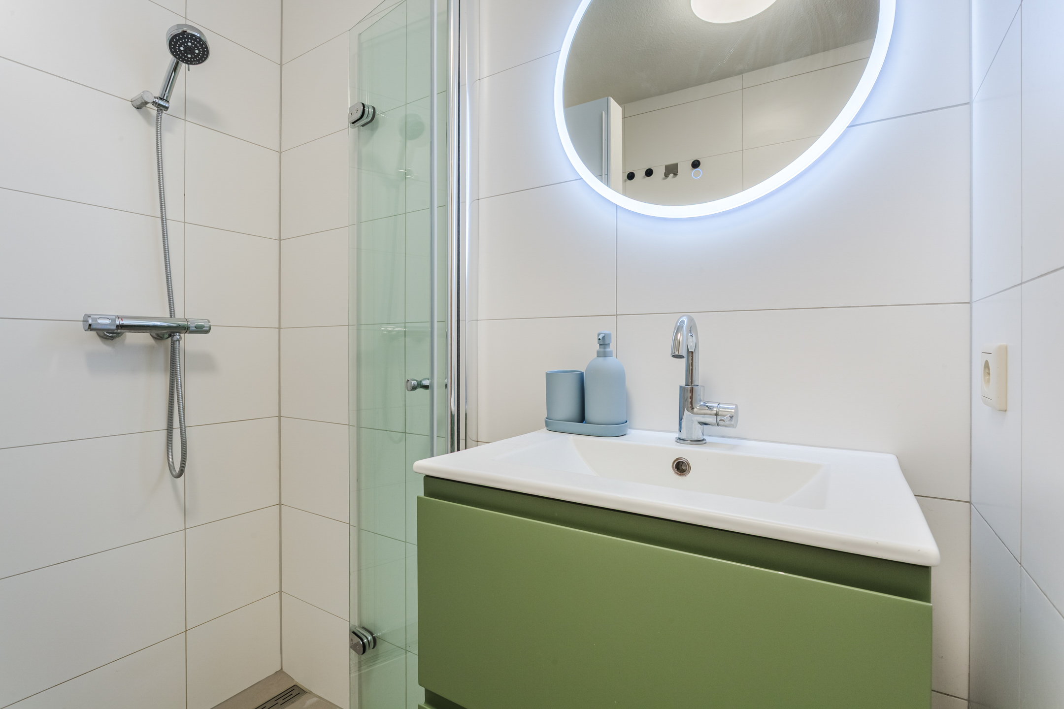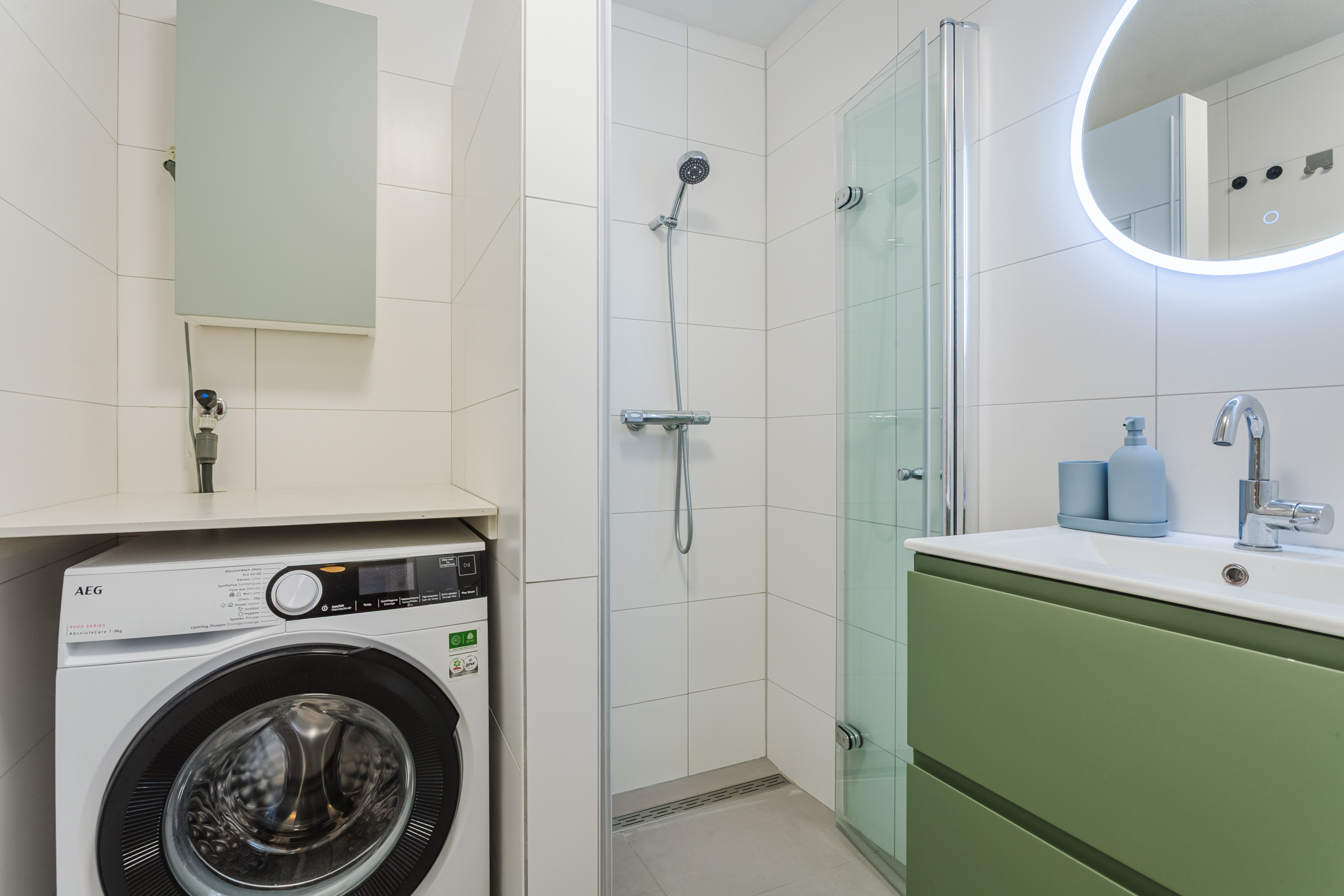 De eenvoudige nette en complete badkamer is in 2023 volledig gerenoveerd en voorzien van een wastafel met meubel, inloopdouche en de aansluitingen voor de witgoedopstelling. Het toilet met fonteintje bevindt zich in een aparte ruimte.
