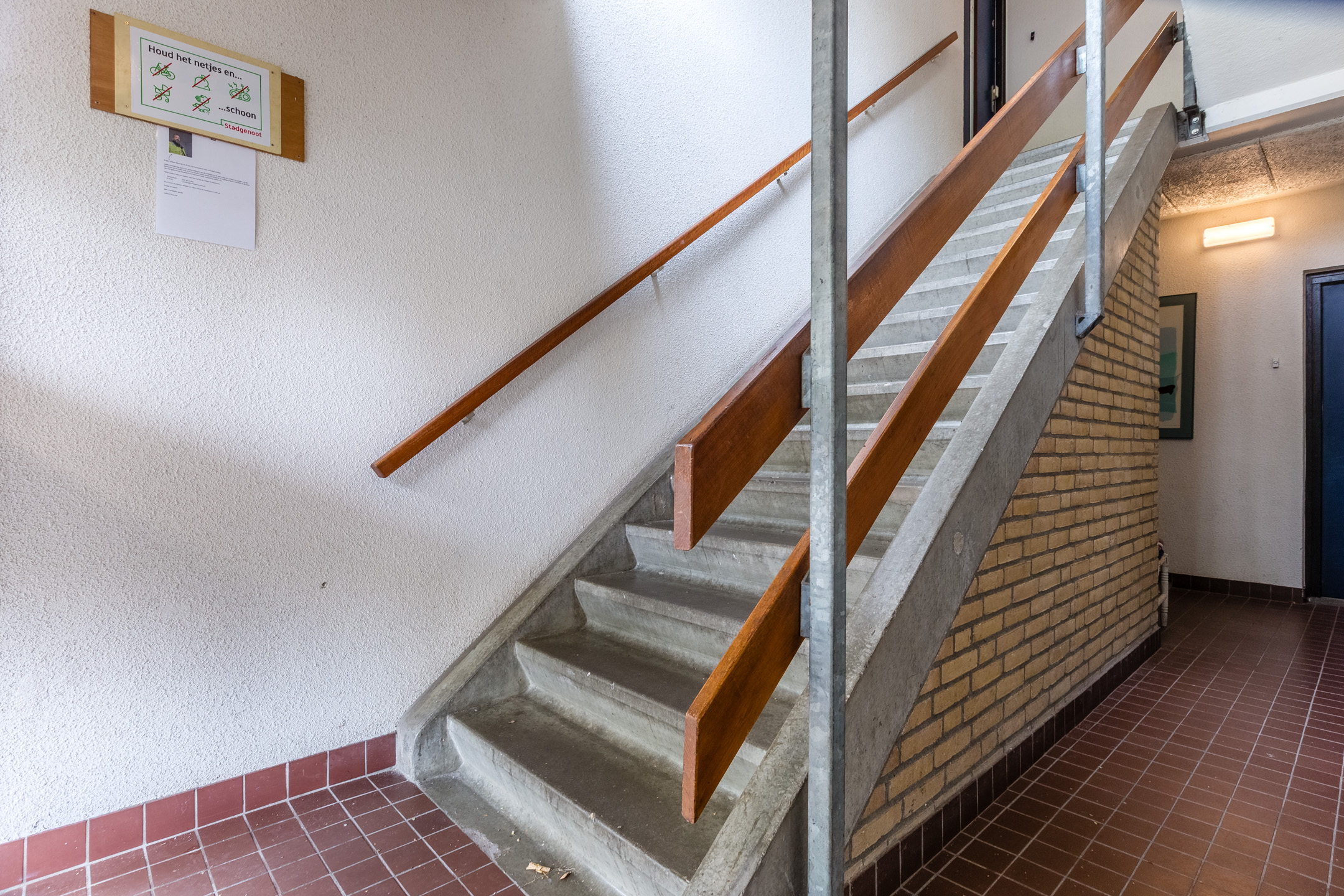 Beneden is er een gezamenlijke entree die je deelt met de bewoners van zeven andere appartementen. Er is hier sprake van een intercomsysteem en een licht trappenhuis. Bovendien beschik je beneden in het gebouw over een eigen (fietsen)berging van zoān 4,5 vierkante meter.
