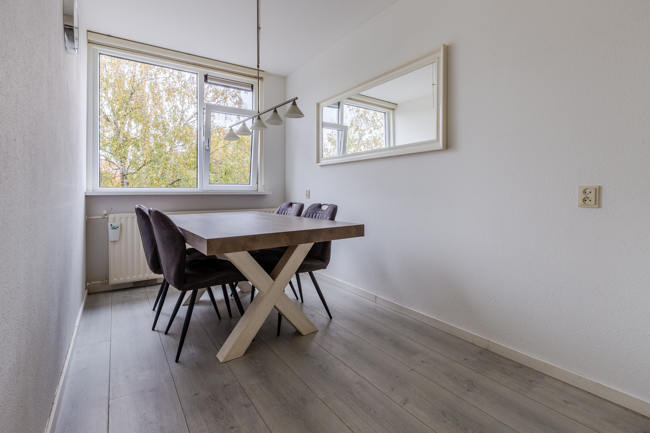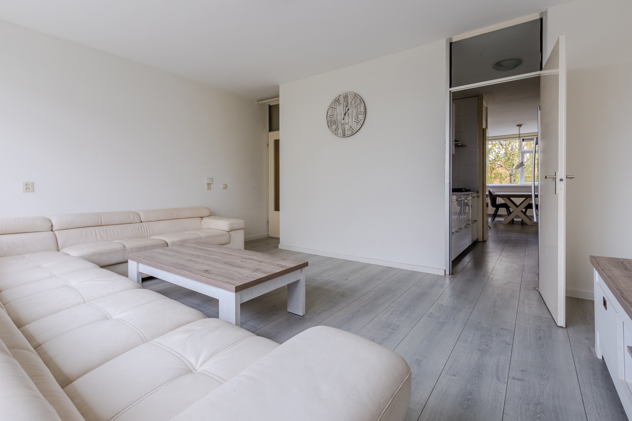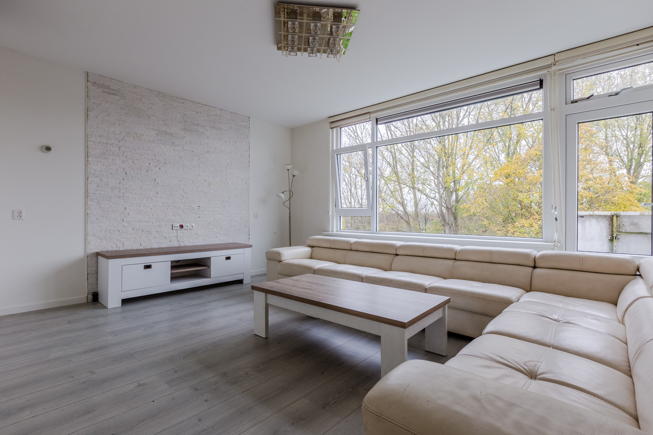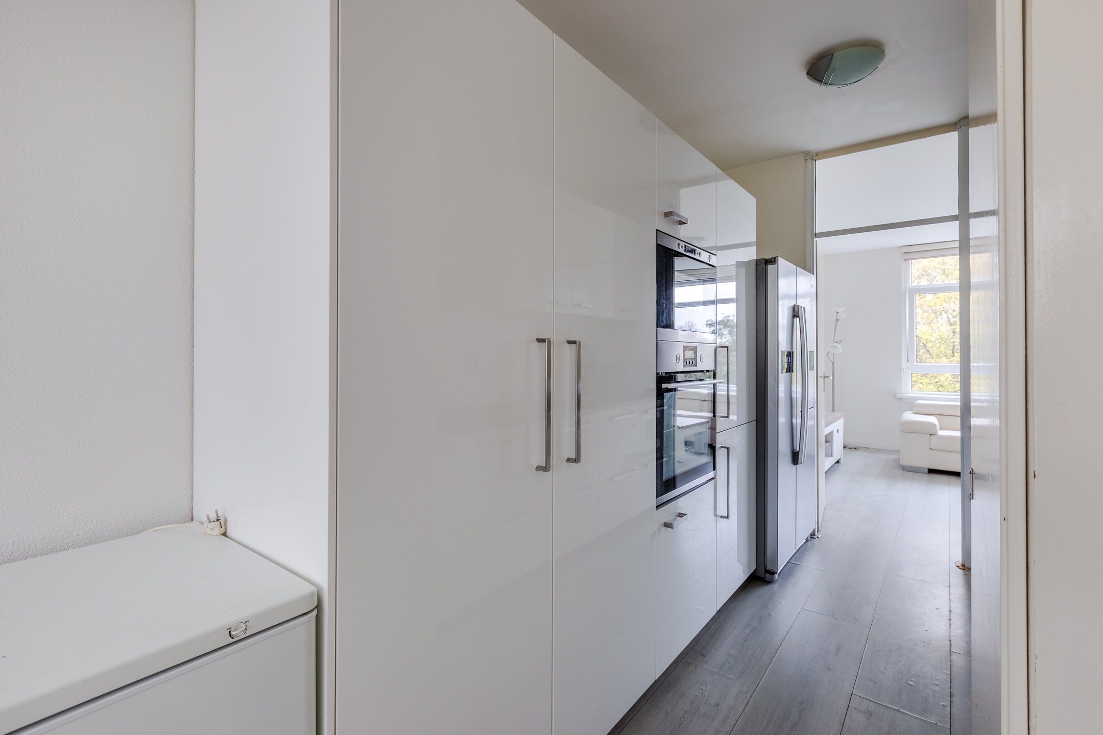 Dit appartement heeft een sfeervolle woonkamer, die is voorzien van een fraaie laminaatvloer. Vanuit deze ruime woonkamer heb je een heerlijk uitzicht over het park naast het wooncomplex.