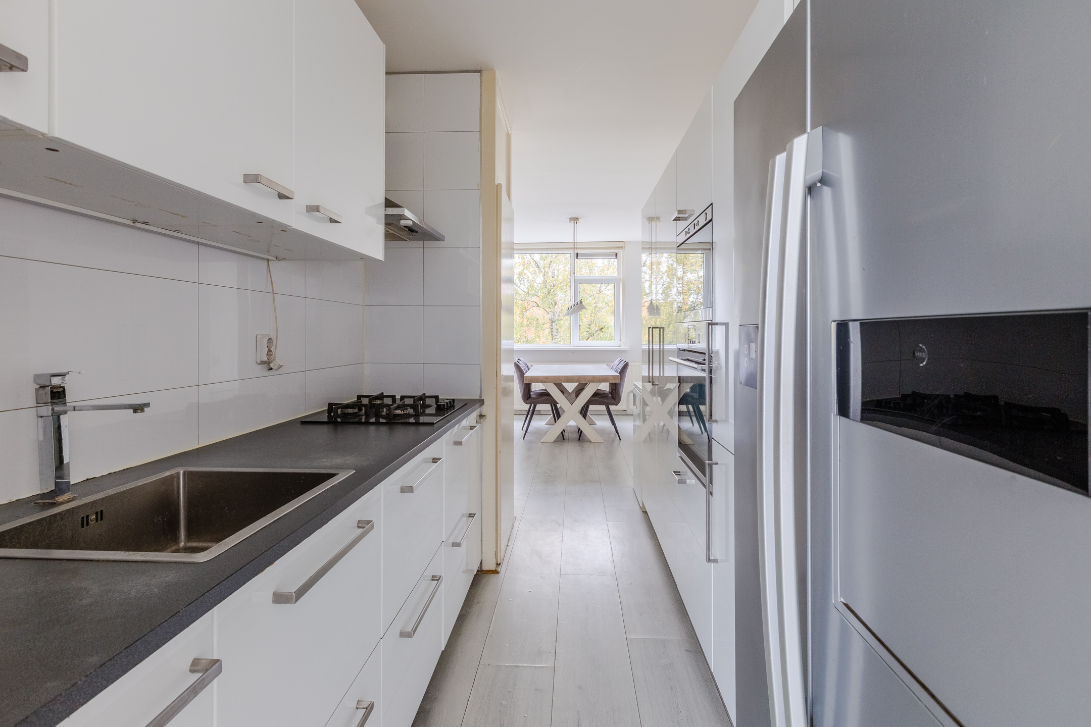 Vanuit de entreehal Ʃn de woonkamer heb je ook toegang tot een prachtige woonkeuken met aangrenzende eetkamer. De keukeninrichting is verspreid over twee moderne keukenblokken, die allebei in wandopstelling zijn aangebracht. Hoogwaardige inbouwapparatuur als een vaatwasser, oven, magnetron, gasfornuis, koelkast en vriezer is voorhanden. Daarnaast vind je in de keuken een grote inloopkast.