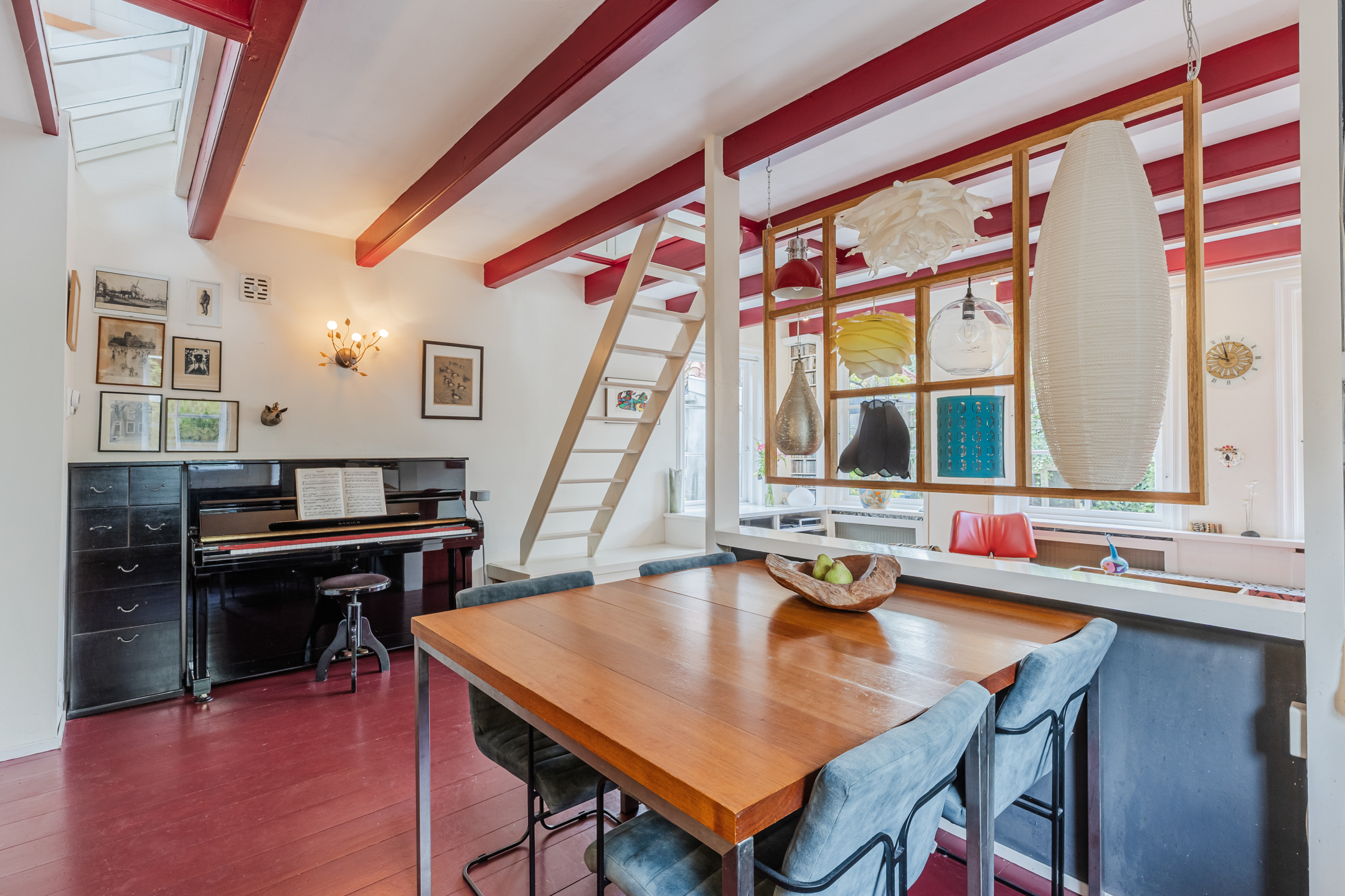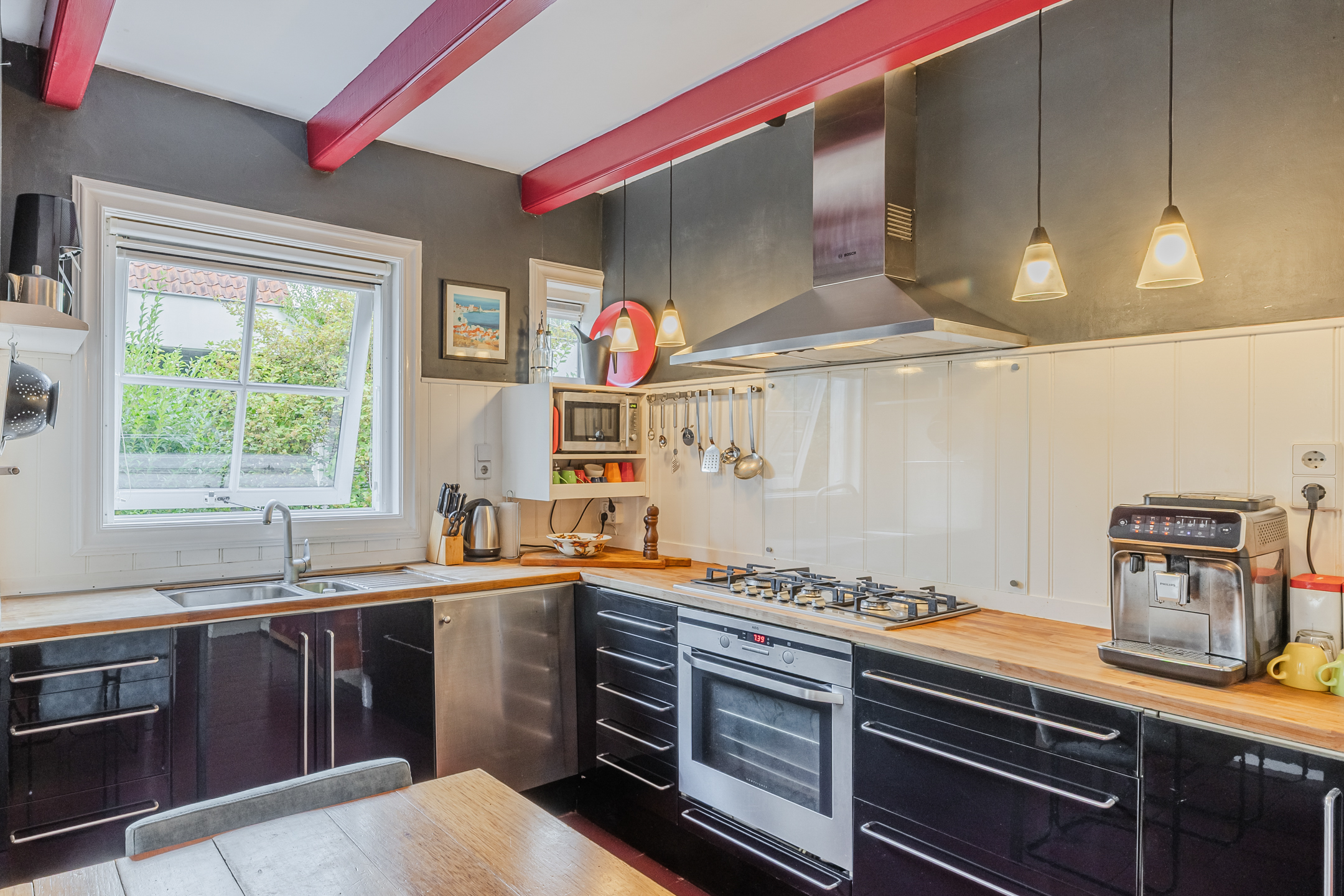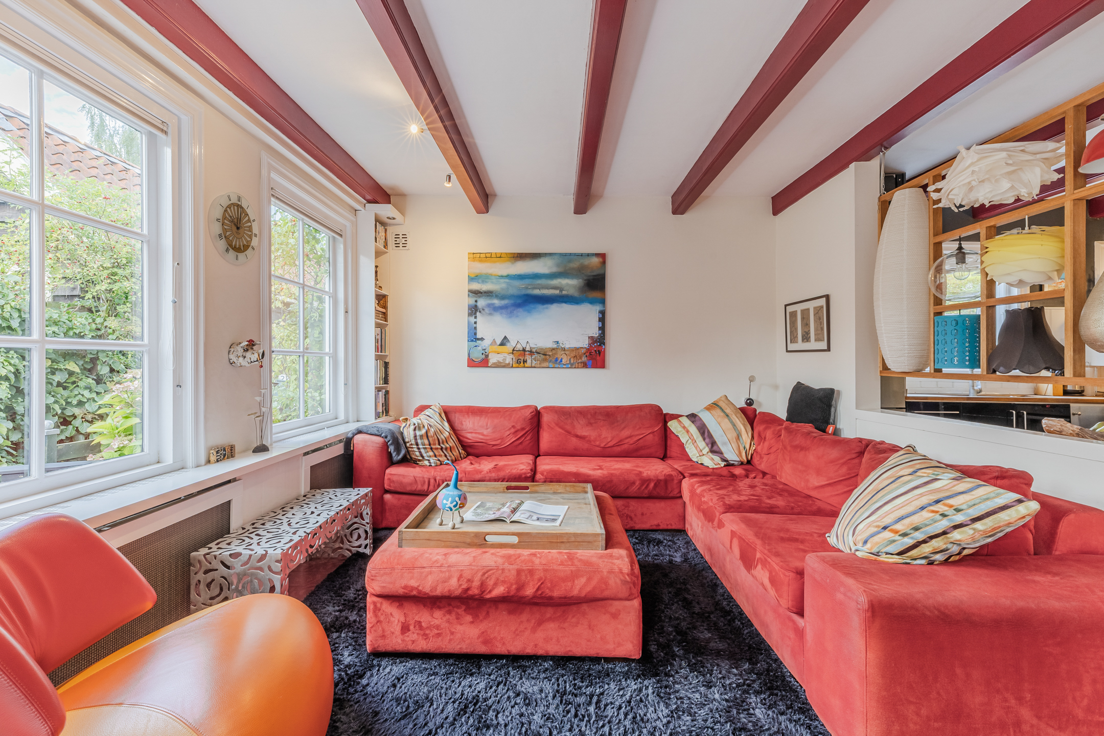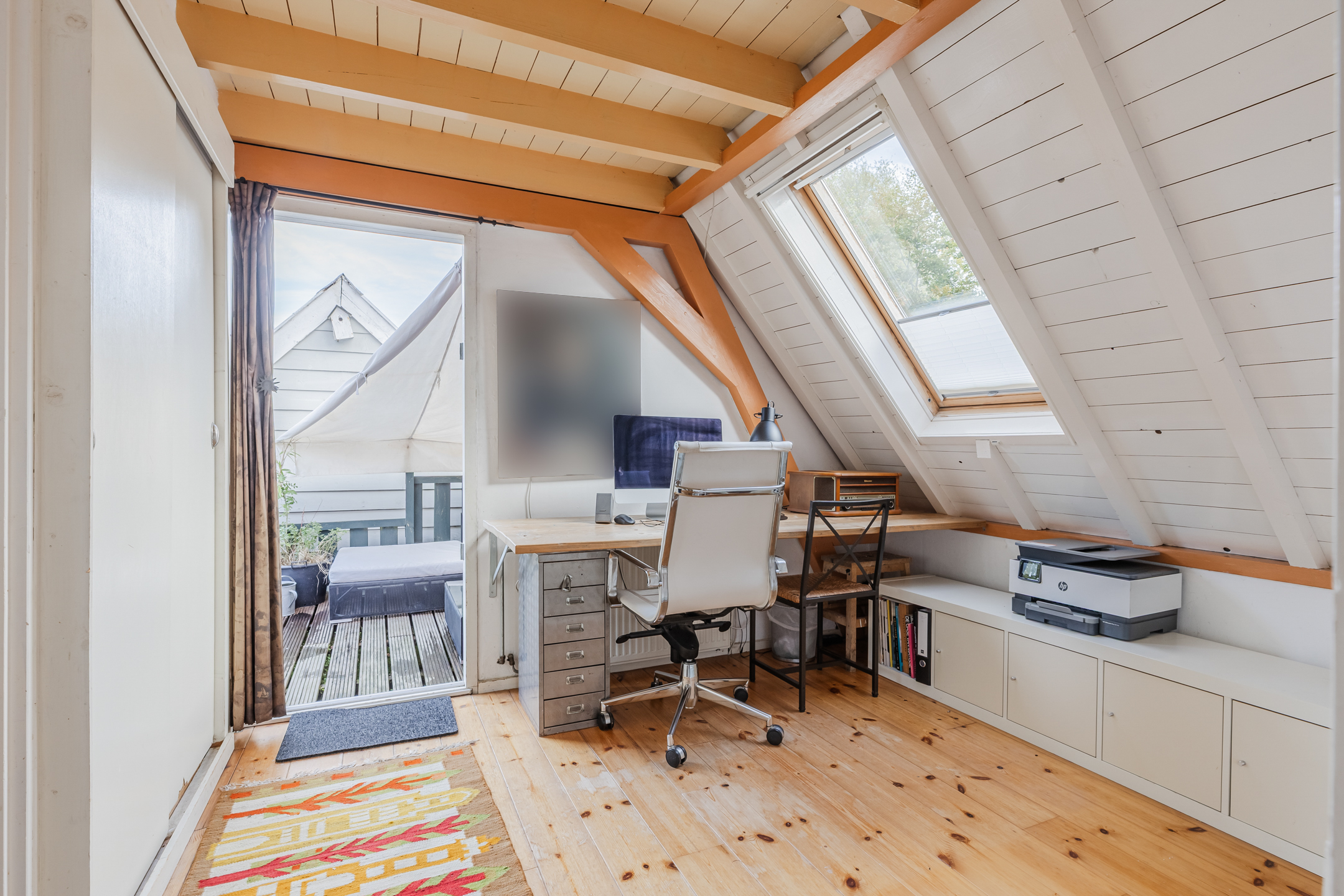 The wooden beamed ceiling, in combination with the wooden floor, gives the room a lot of character.