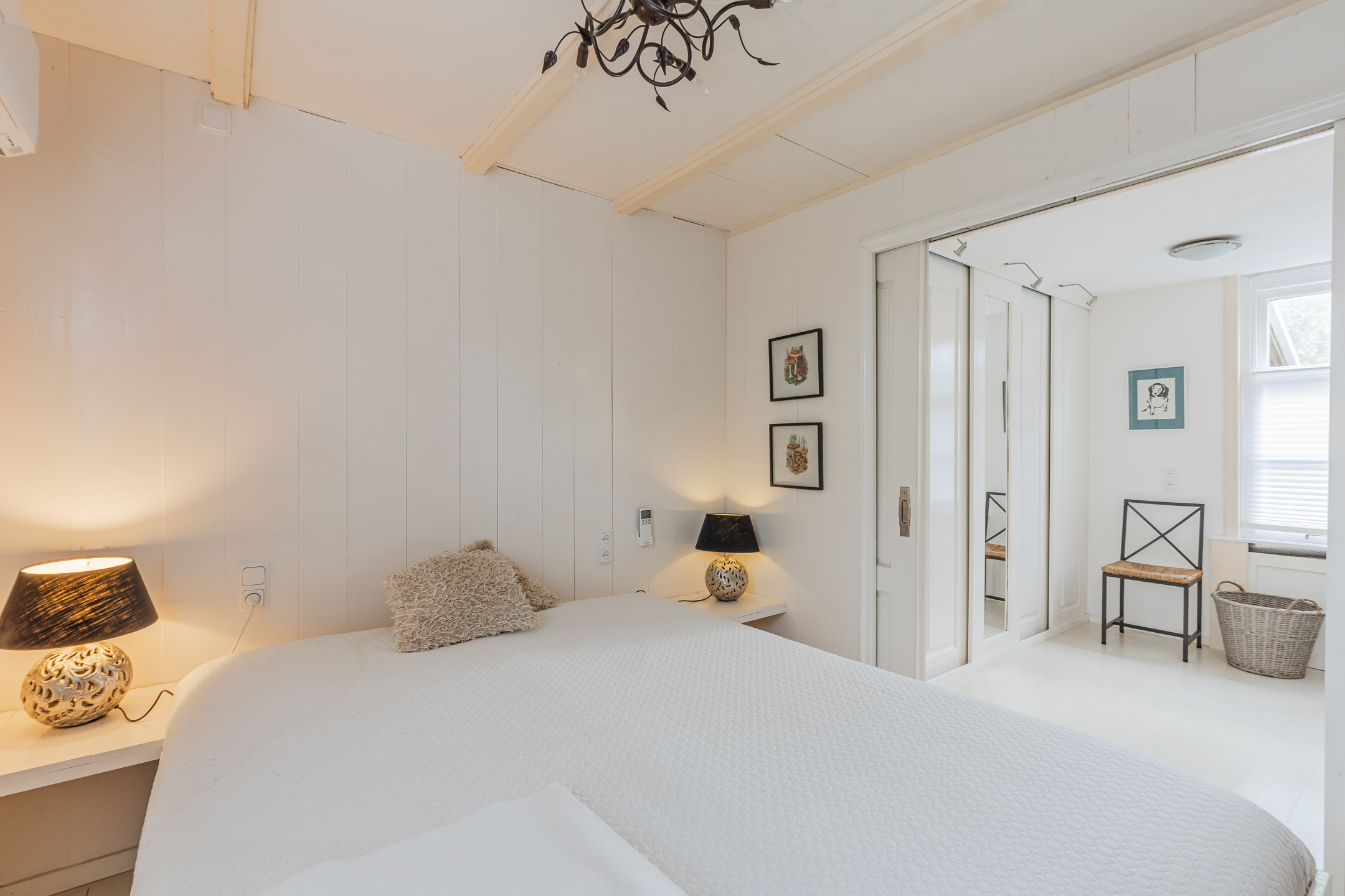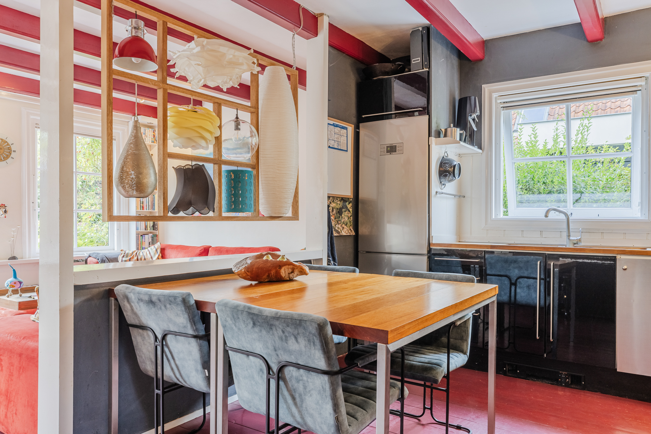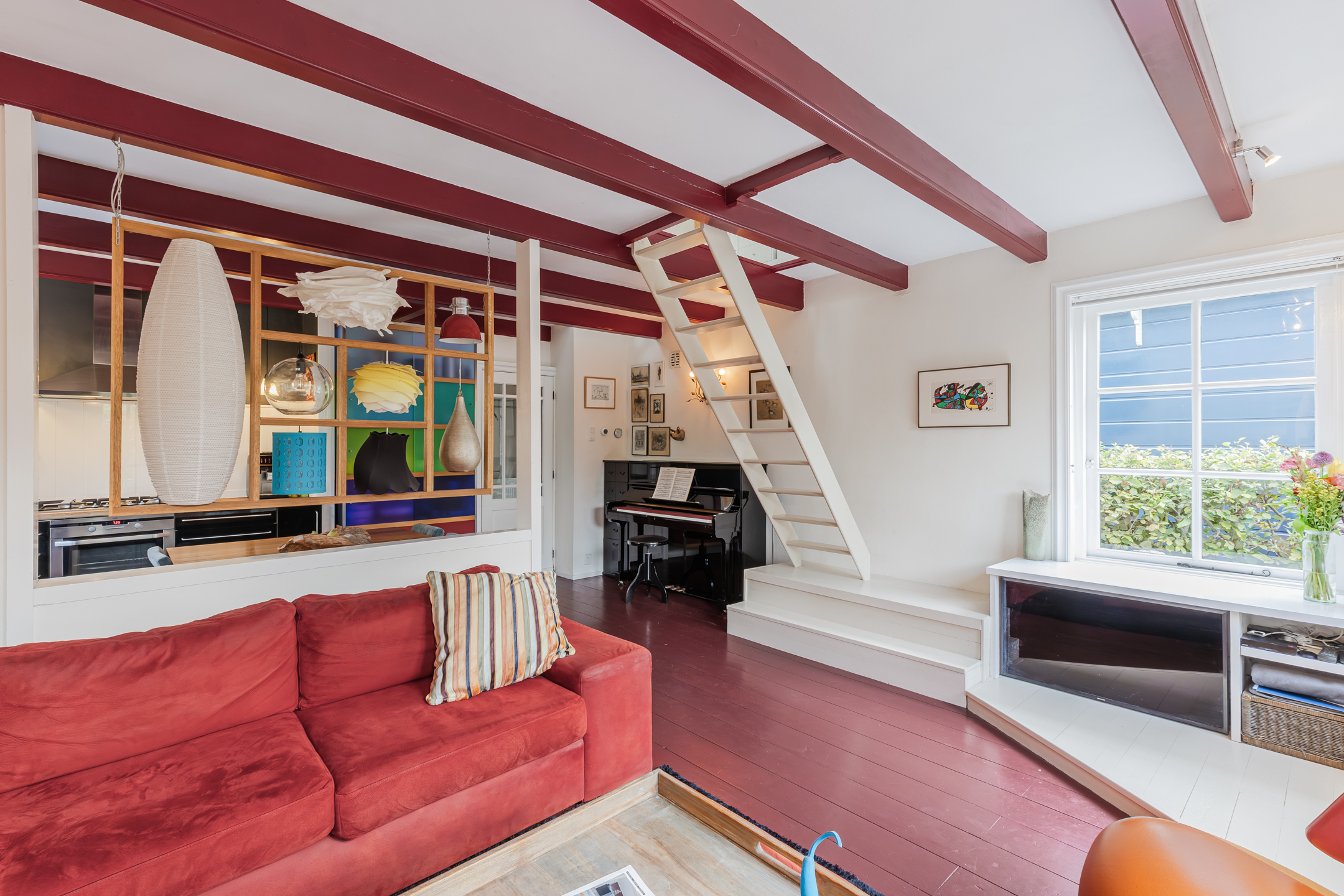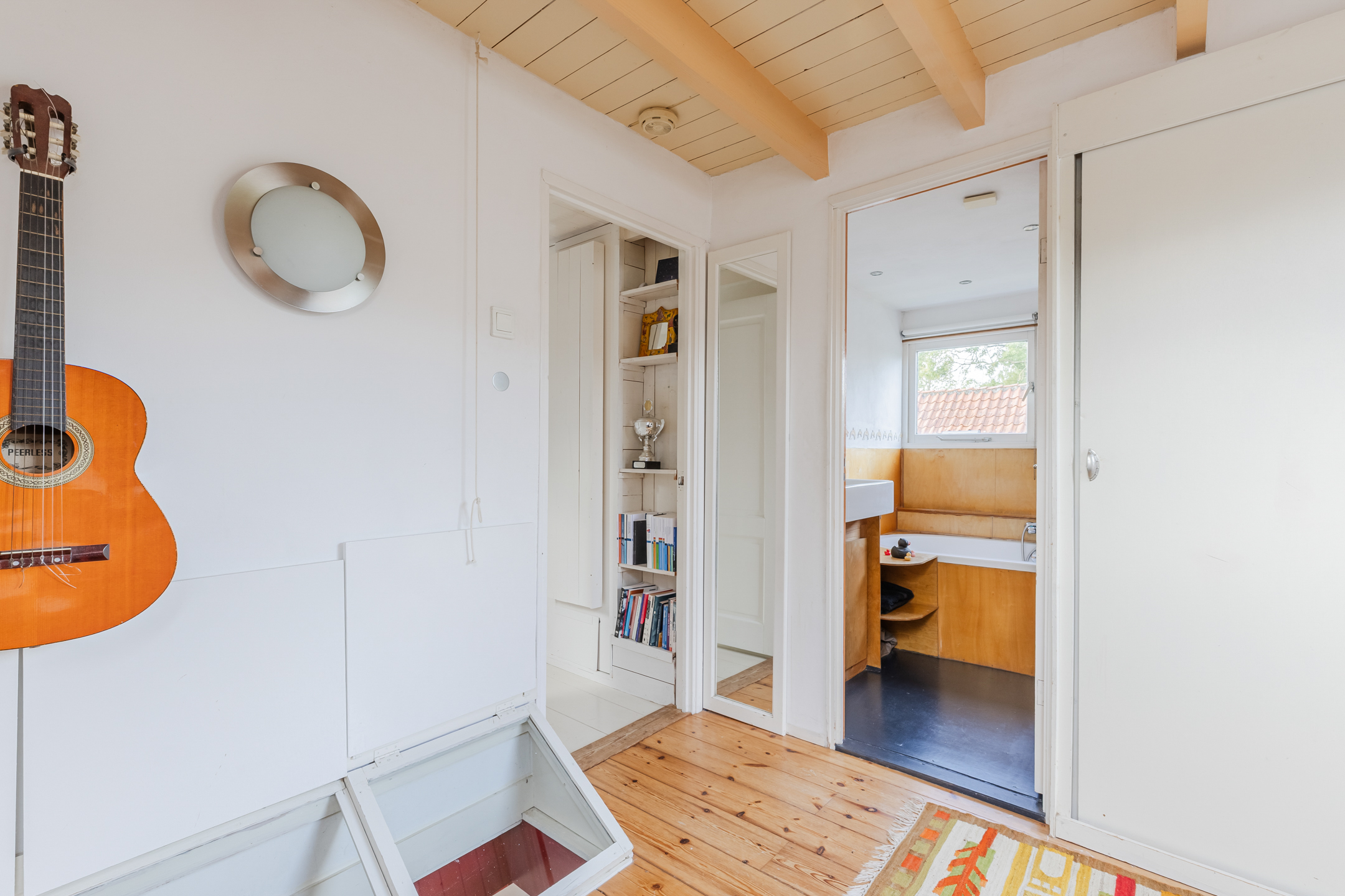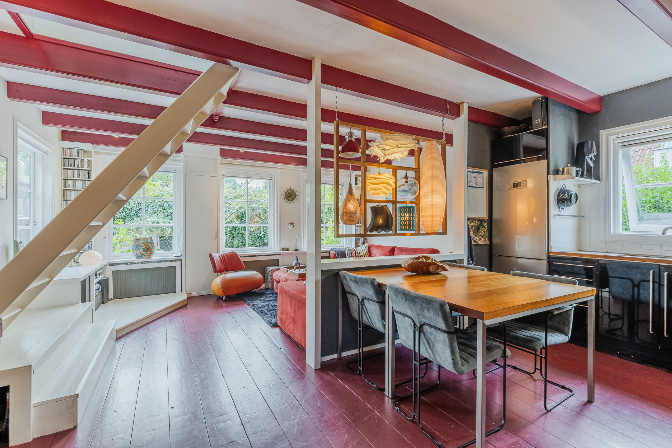 The wooden beamed ceiling, in combination with the wooden floor, gives the room a lot of character.