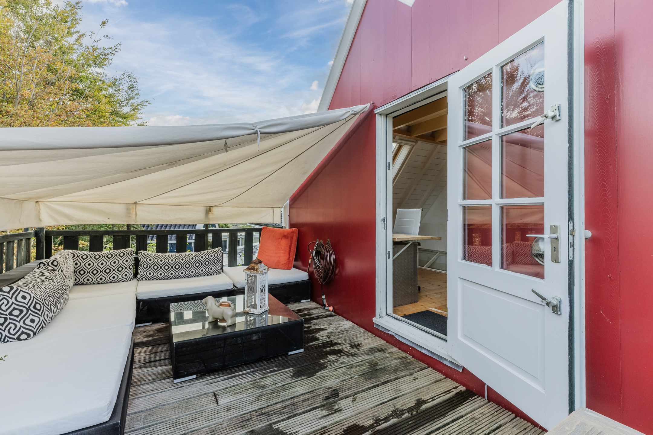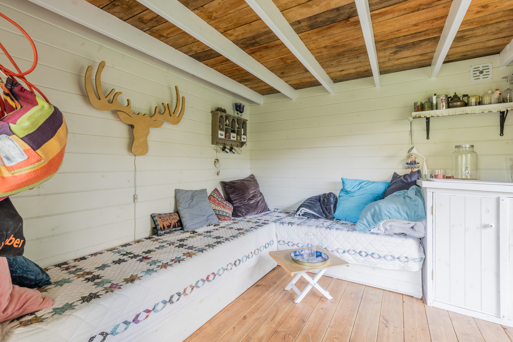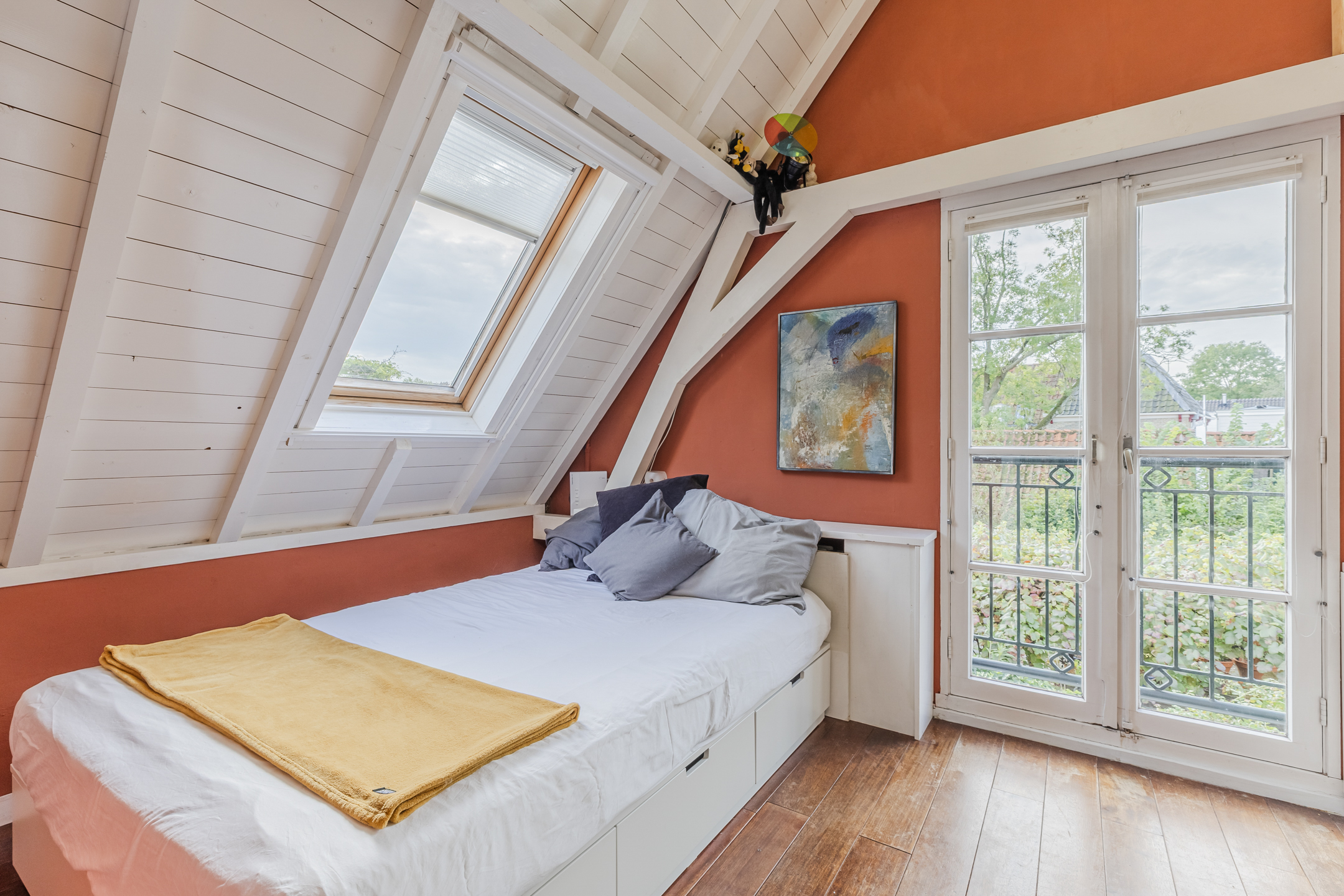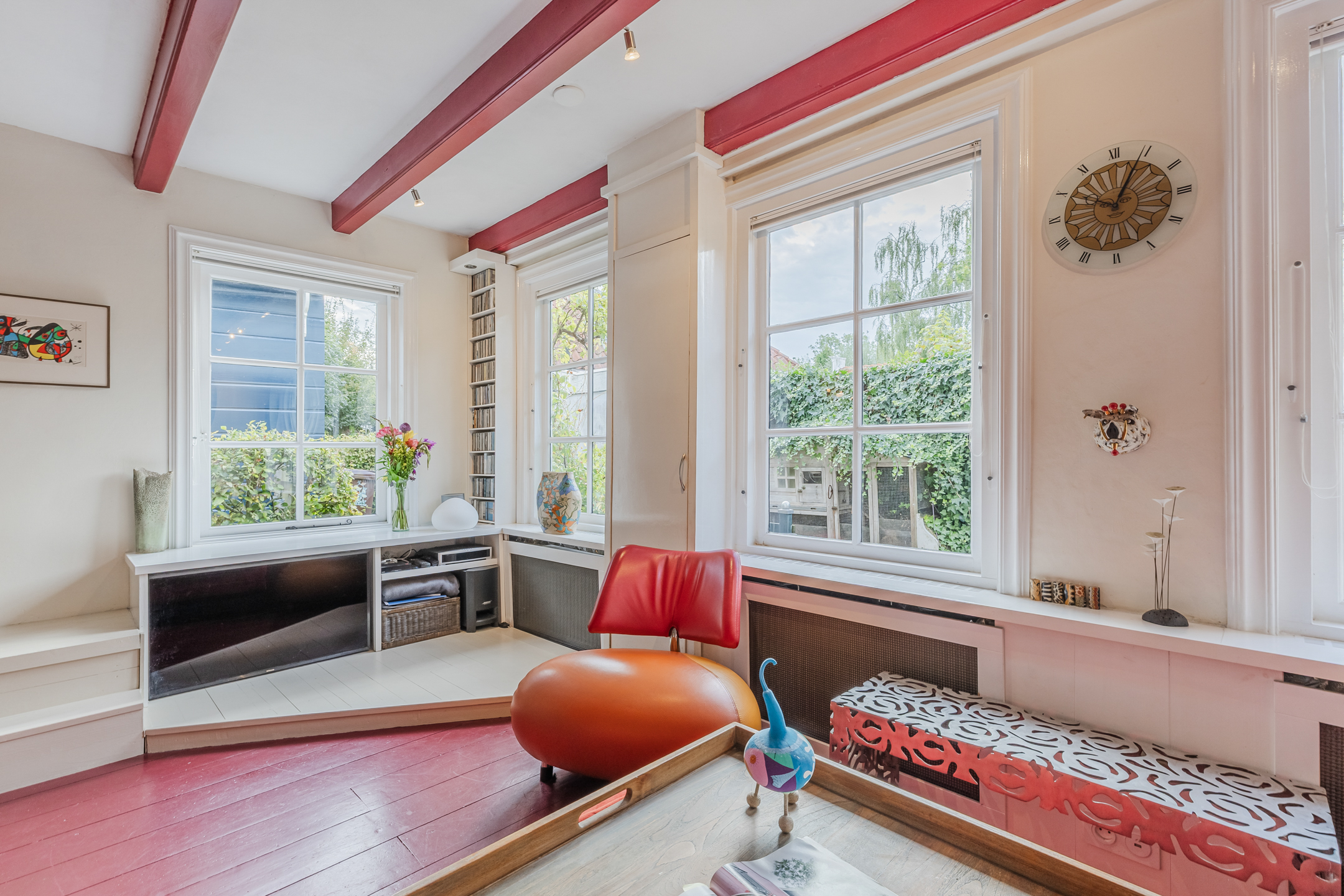 The wooden beamed ceiling, in combination with the wooden floor, gives the room a lot of character.