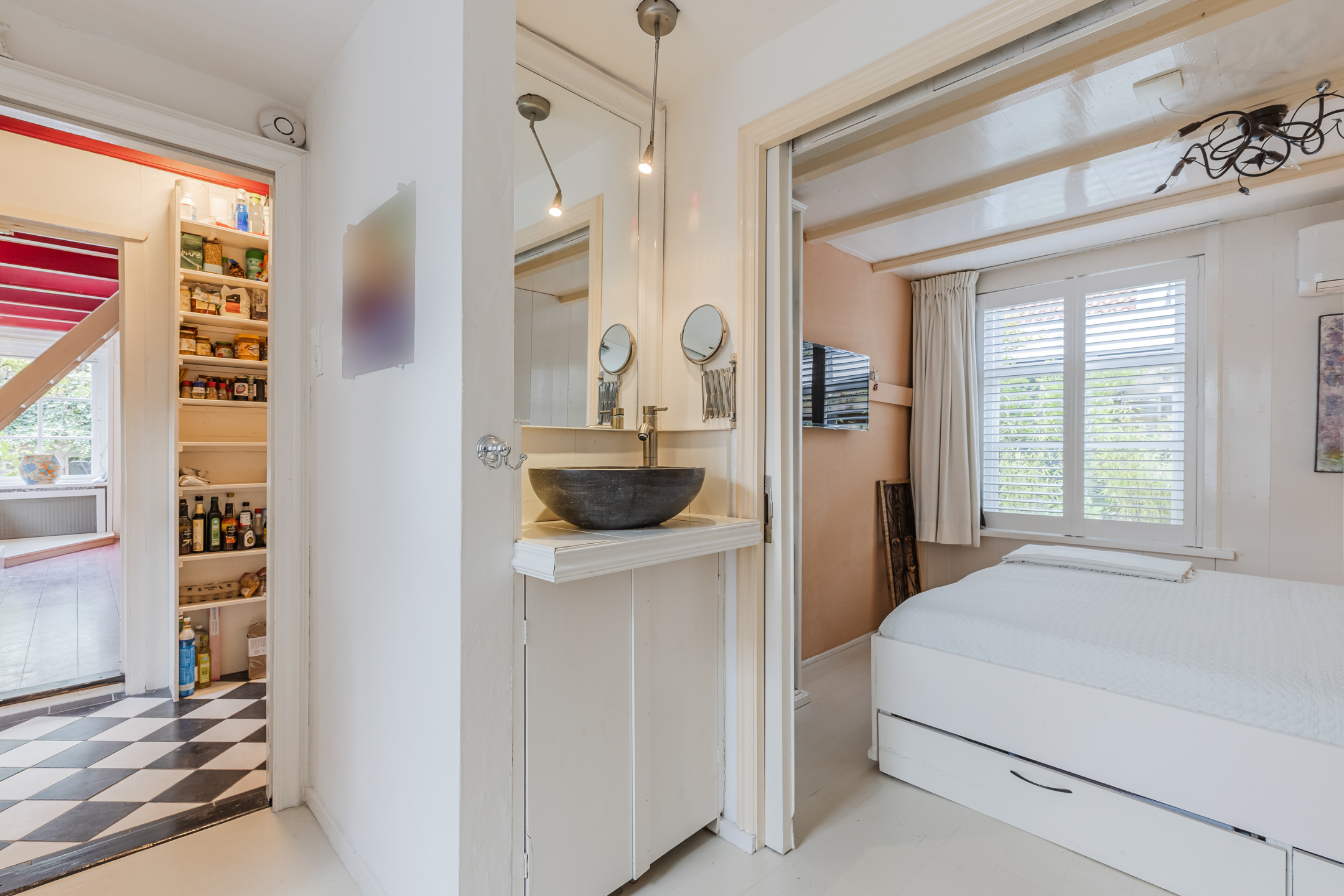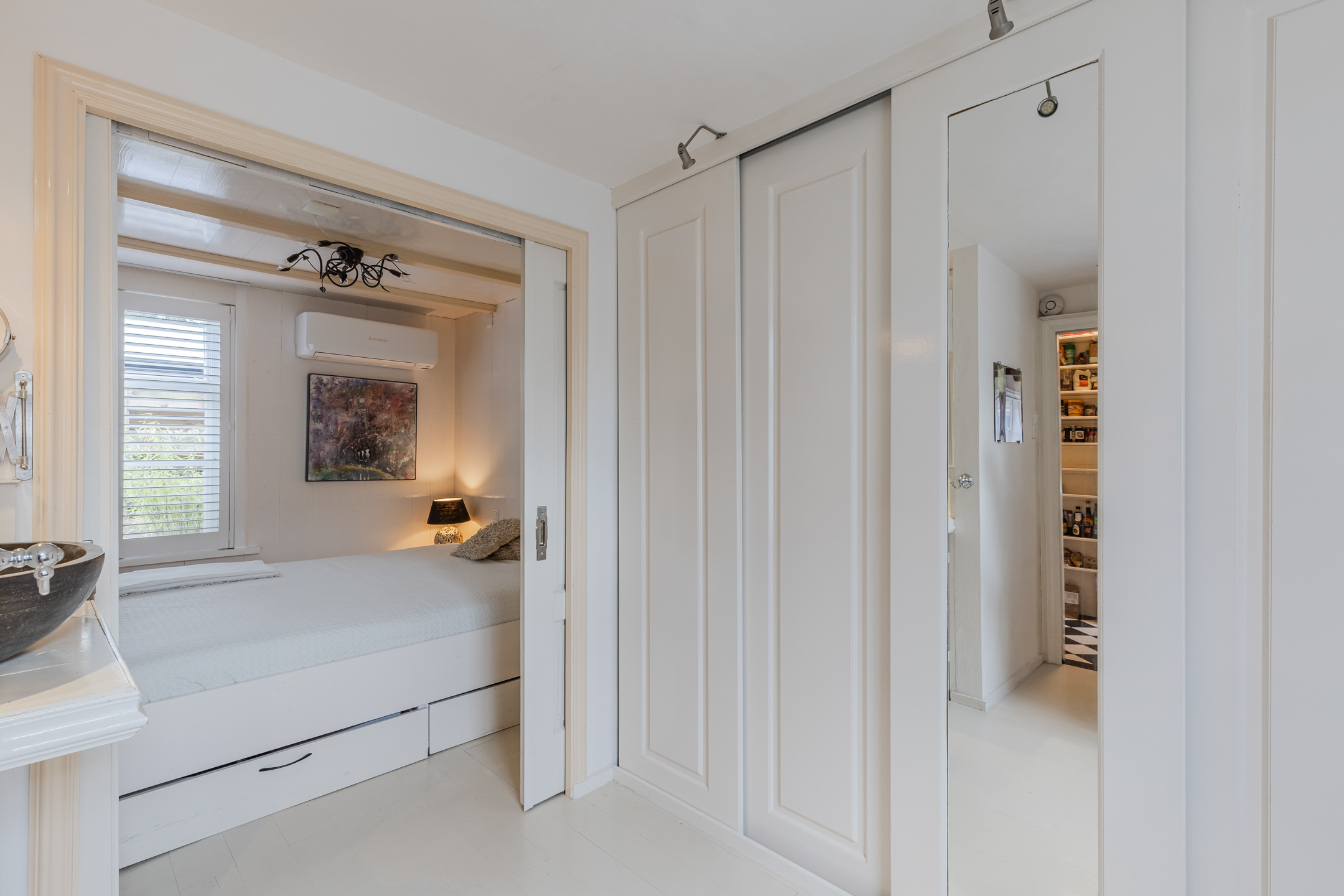 Op de begane grond bevinden zich 2 door een schuifdeur aan elkaar gekoppelde slaapkamers ā met ingebouwde kasten en een wastafel. De badkamer is voorzien van een wastafel, zwevend toilet en douche.