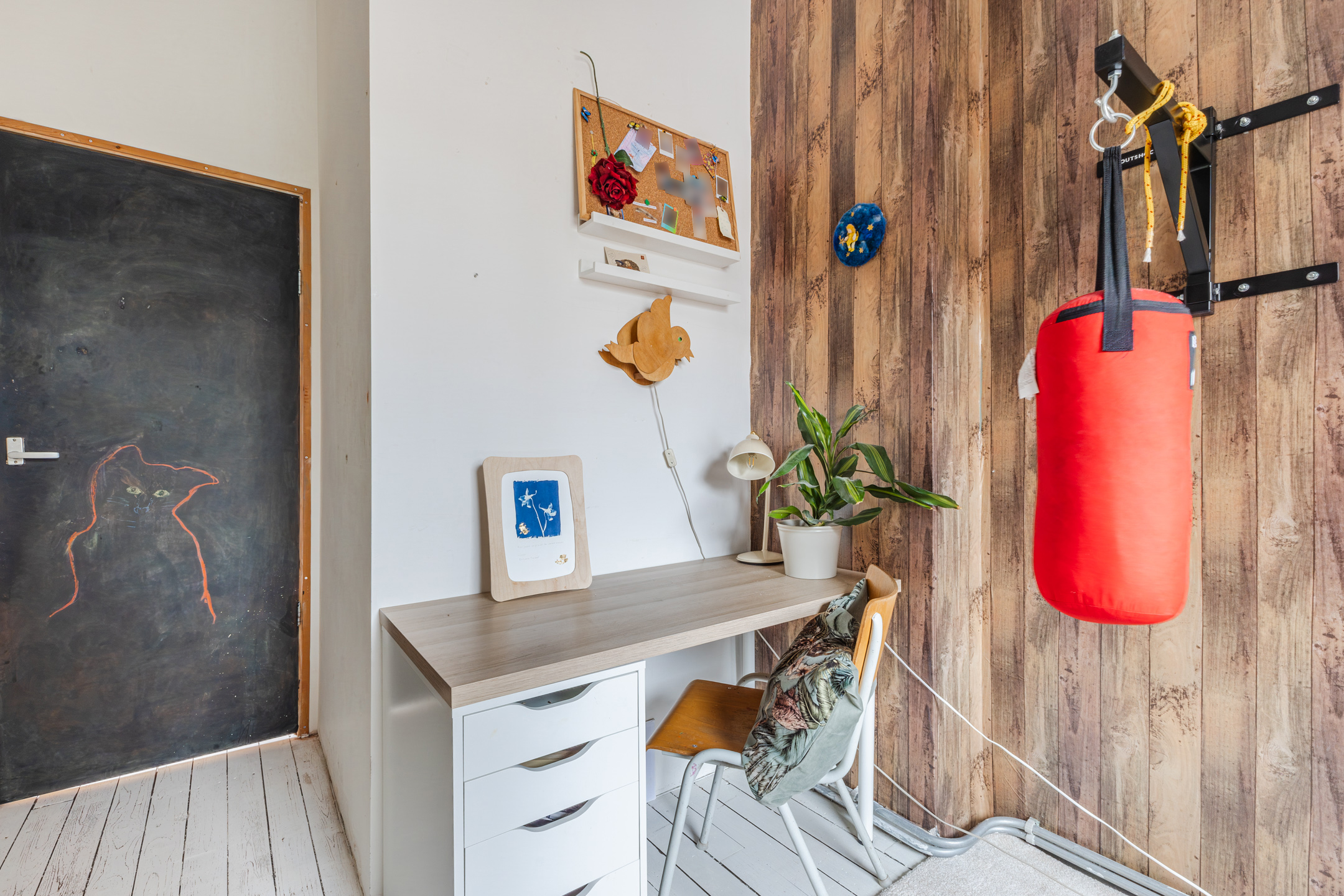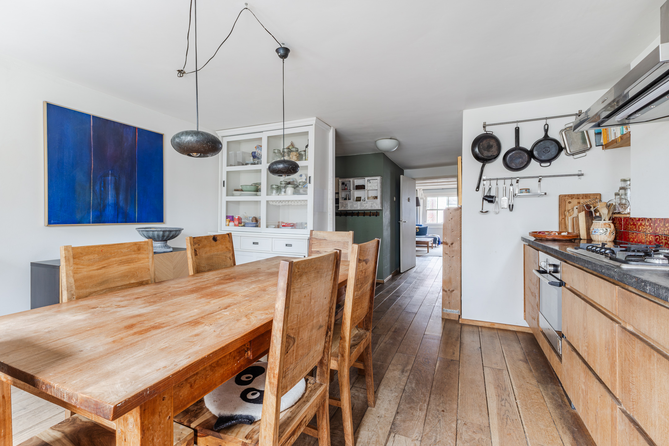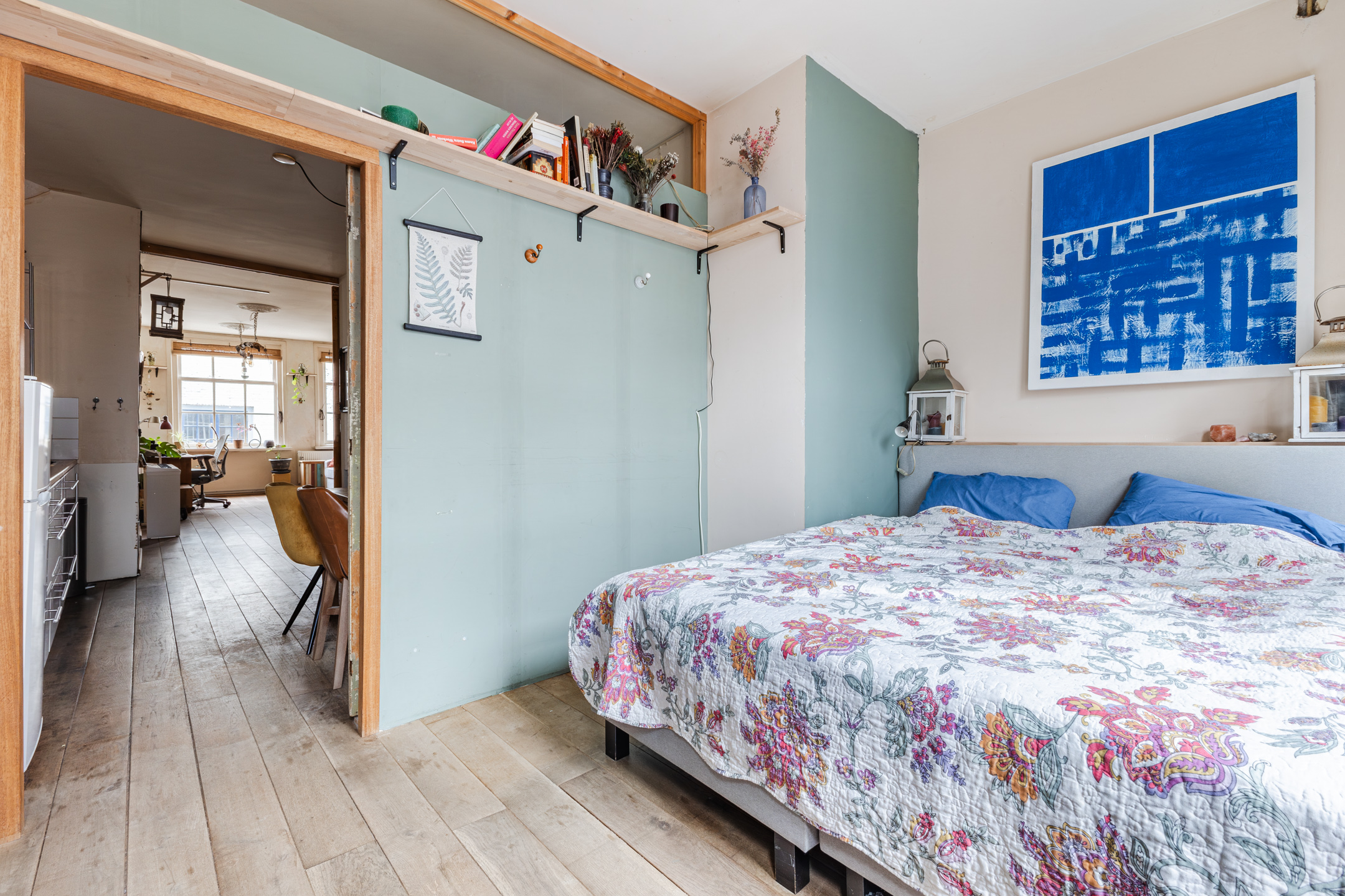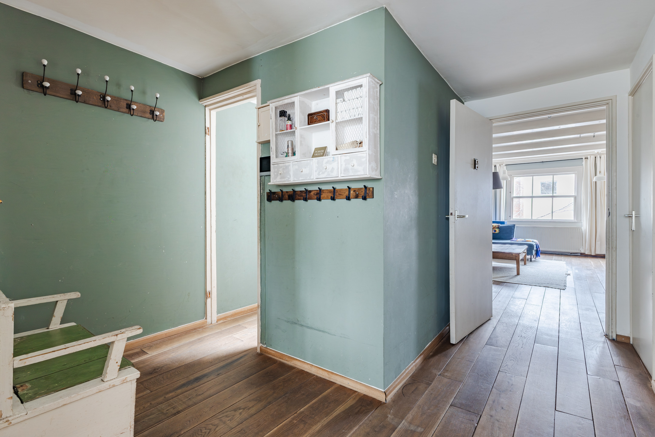 Vanaf de overloop is er toegang tot zowel de woonkamer als de keuken. De ruimte geniet van een prettige hoeveelheid lichtinval en is afgewerkt met een mooie houten vloer.