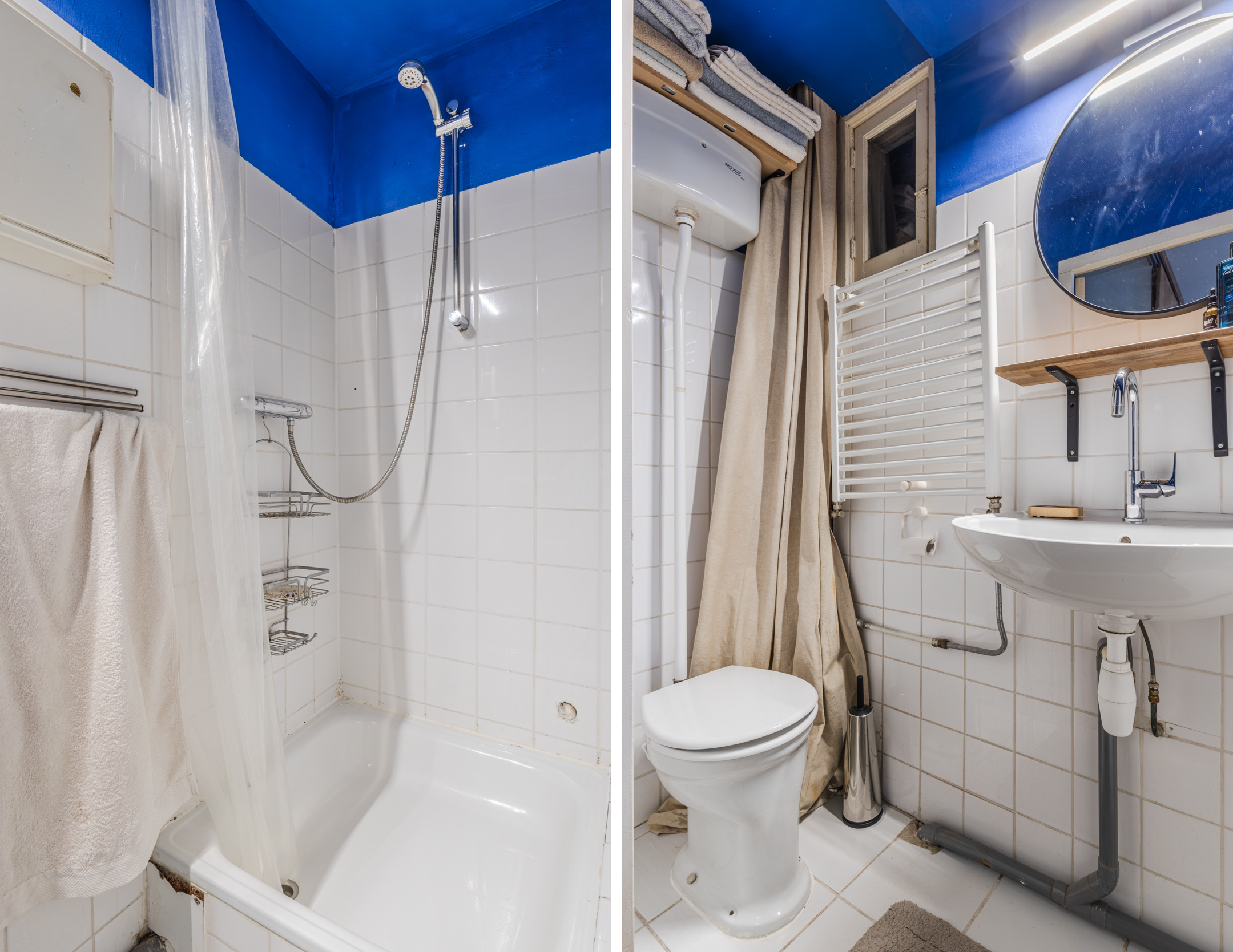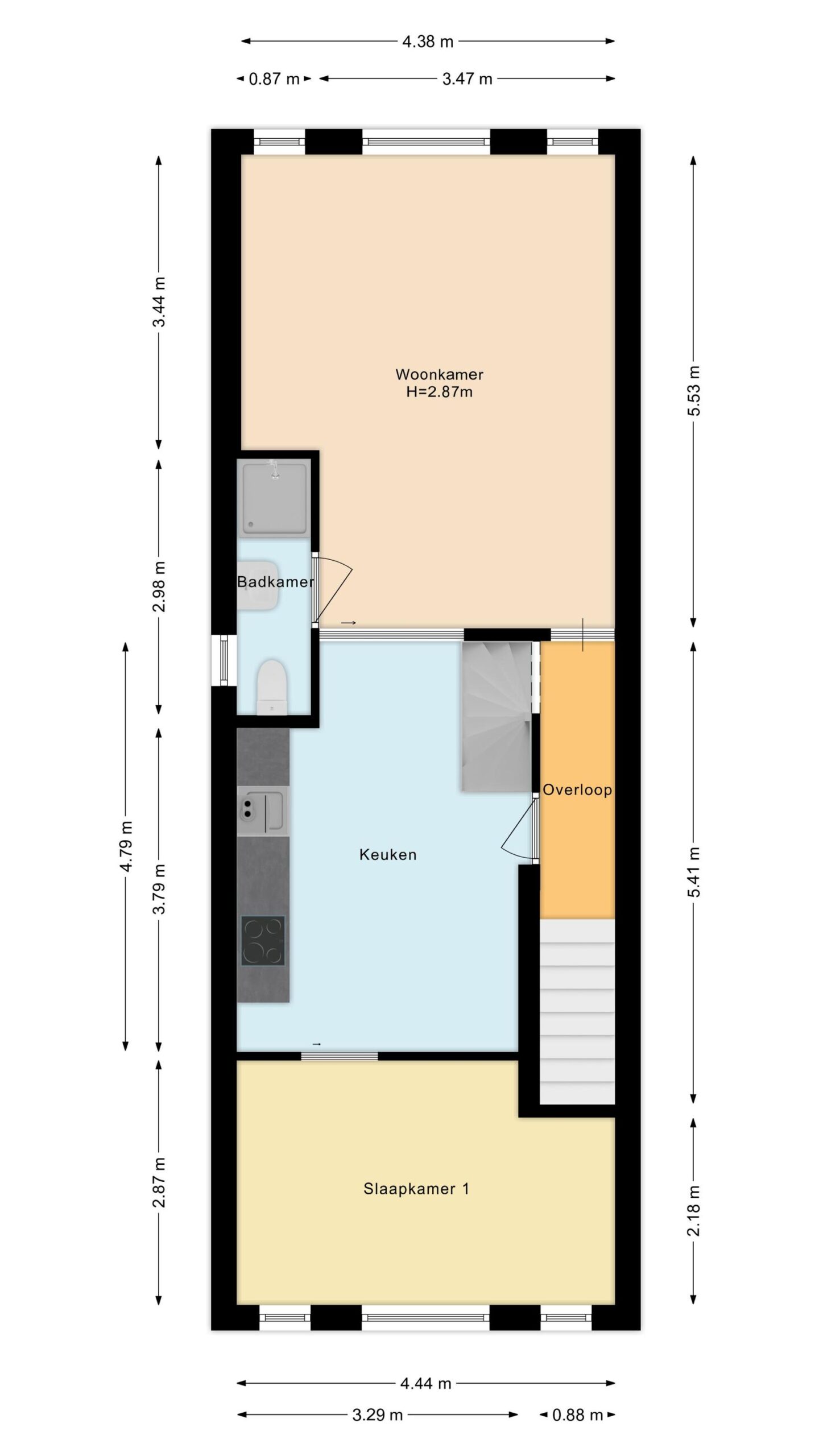 Vanuit de keuken is er toegang tot de slaapkamer en vanuit de woonkamer is er toegang tot de badkamer met toilet, wastafel en douche.