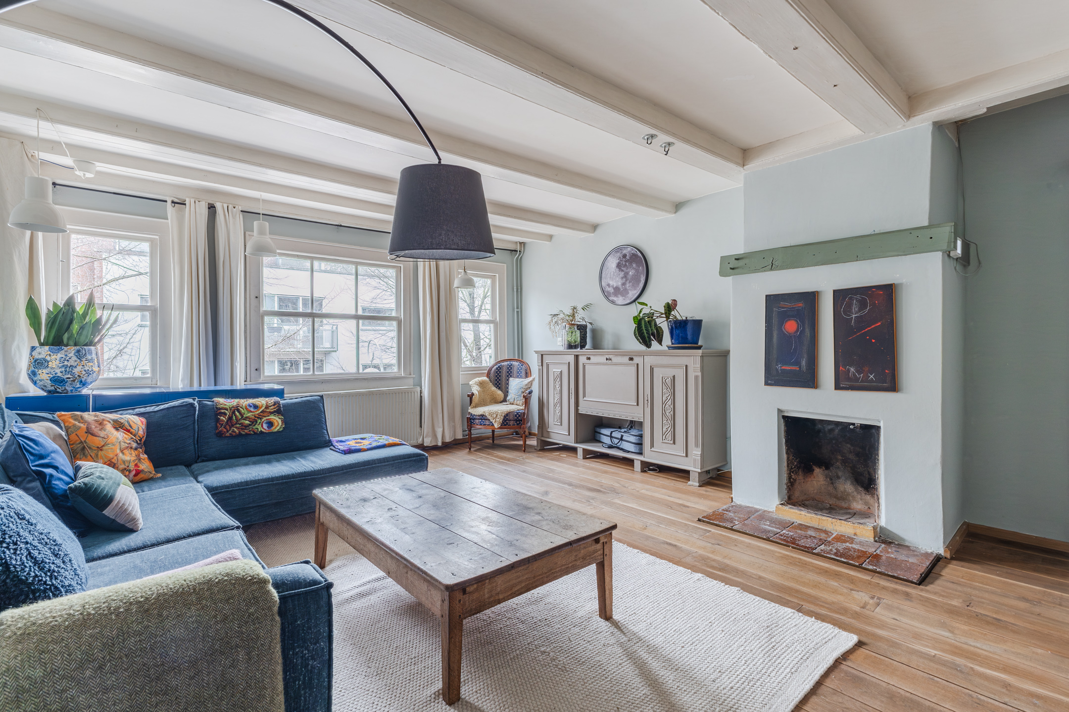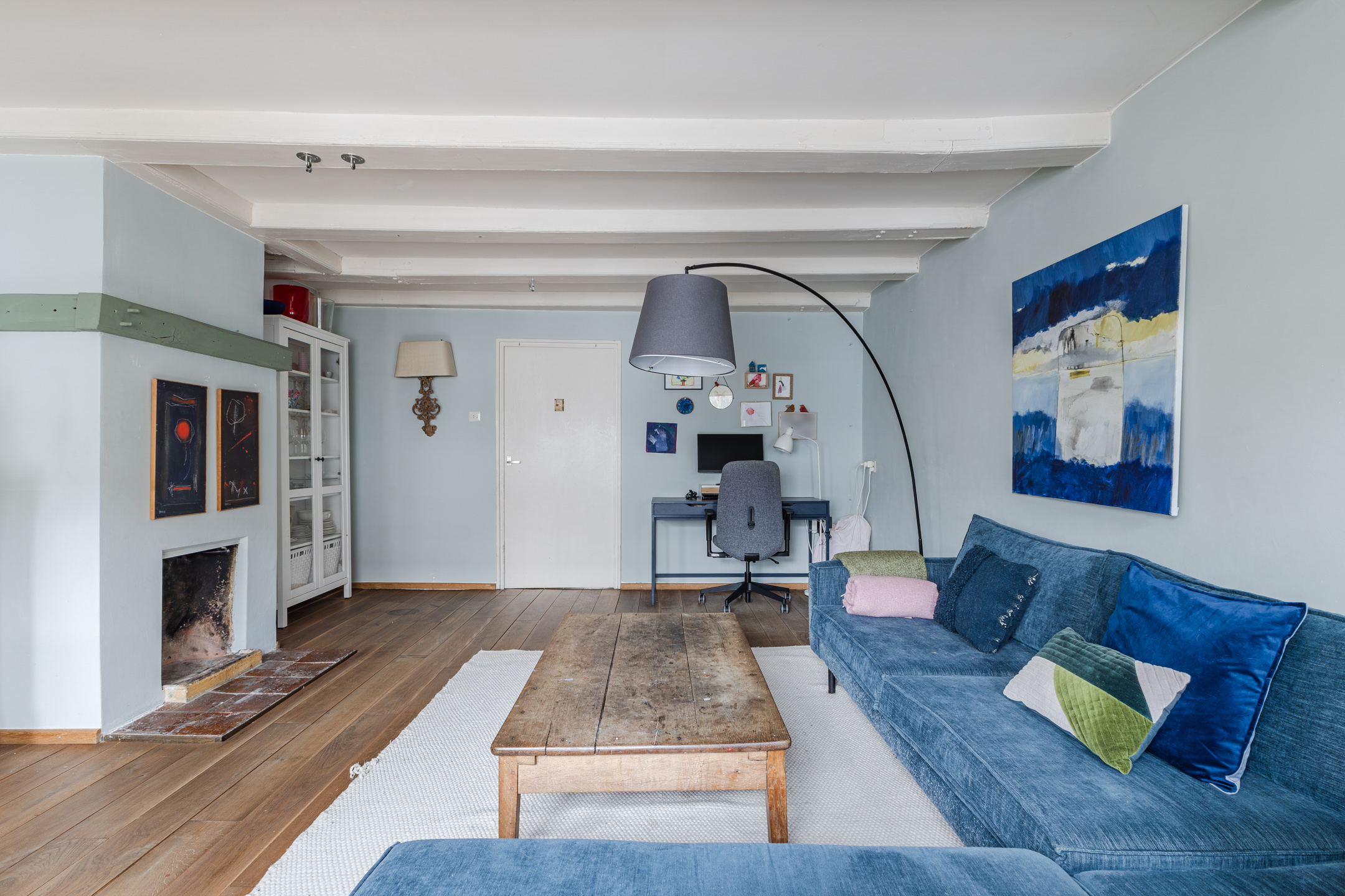 Via the staircase to the second floor. This level also features a spacious living room and an open kitchen. Once again, the apartment is neatly finished with a beautiful wooden floor. Characteristic elements such as the exposed wooden beams and the fireplace add a great deal of atmosphere.